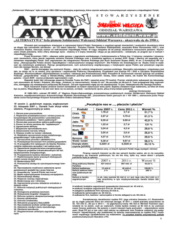 ,,Solidarność Walcząca’’ była w latach 1982-1990 konspiracyjną organizacją, która czynnie walczyła z komunistycznym reŜymem o niepodległość Polski. „ALTERNATYWA” była pismem Solidarności Walczącej Oddział Warszawa - ukazywała się do 1990 r. Wrzesień jest szczególnym miesiącem w najnowszej historii Polski. Pamiętamy o wspólnej agresji niemieckich i sowieckich zbrodniarzy która na długie lata unicestwiła odrodzone - po 123 latach zaborów - Państwo Polskie. Powstanie Wielkopolskie, zwycięska Bitwa Warszawska 1920 r. oraz Powstania Śląskie, stworzyły szanse na wskrzeszenie niepodległej Polski. W ciągu niespełna 20 lat pokoju zbudowano nowoczesne państwo. Wychowano młode pokolenie, które ofiarą własnego Ŝycia - złoŜoną w II wojny światowej i długo po jej zakończeniu - świadczyło, Ŝe pragnie Ŝyć w wolnym i niepodległym kraju. Przed Wrześniem 1939 r. zdawano sobie sprawę z zagroŜenia wynikającego z funkcjonowania w Polsce tzw. V kolumny: związków i stowarzyszeń niemieckich, które jawnie negowały istnienie Państwa Polskiego oraz z sowieckiej agentury w postaci KPP. Rosja i Niemcy nie pogodziły się z istnieniem niepodległej Polski. Dziś zagroŜeniem dla integralności Państwa Polskiego jest Ruch Autonomii Śląska (RAŚ). W art. 5 Konstytucji RP czytamy: ,,Rzeczpospolita Polska strzeŜe niepodległości i nienaruszalności swojego terytorium''. Dla Polaków nie mieszkających na Śląsku moŜe to wydawać się nieistotnym problemem. Patrząc perspektywicznie, ruch autonomiczny współpracujący z instytucjami spoza Polski, jest powaŜnym zagroŜeniem dla naszego Narodu. JuŜ dzisiaj! RAŚ - jawnie domagając się autonomii Śląska - dąŜy do rozbicia integralności państwa polskiego. Niezwykle zatrwaŜający i niepokojący jest fakt, Ŝe dzieje się to za wiedzą, przy aprobacie i współudziale Platformy Obywatelskiej. Przykładem jest koalicja PO i RAŚ w Zarządzie Województwa Śląskiego. Wicemarszałkiem odpowiedzialnym za kulturę i edukację jest Przewodniczący RAŚ. Prezydent B. Komorowski równieŜ ignoruje ten problem. Podczas ,,gospodarskiej’’ wizyty w Bielsku-Białej, całkowicie pominął temat autonomii. Osobę, która zadała waŜne, ale trudne dla Komorowskiego pytania – trzech BOR - owców próbowało wyprowadzić z sali. Niepokój budzi fakt milczącego poparcia Donalda Tuska dla RAŚ i zawartej przez PO koalicji. Premier wielokrotnie wykazywał się lekcewaŜącym stosunkiem do Polski i Polaków. Dla niego ,,Polskość to nienormalność, Polska to mit''. Na początku lat 90-tych D. Tusk propagował ideę regionalizmu, domagając się niezaleŜności politycznej dla Kaszub . Od tych wypowiedzi nigdy się nie zdystansował. To jest niebezpieczne dla naszego Państwa. Ruch Autonomii Śląska umieścił swoich kandydatów na listach wyborczych wielu partii. Bądźmy świadomi kogo wybieramy, za kilka lat moŜe być za późno. Niepodległość nie jest nam dana raz na zawsze, za błędy i zaniechanie ojców, płacą krwią kolejne pokolenia. Jadwiga Chmielowska W 1980-1981r. członek ZR NSZZ ,,S’’ Regionu Śląsko-Dąbrowskiego, przewodnicząca podziemnych struktur Solidarności Walczącej Oddział Katowice, współprzewodnicząca Autonomicznego Wydziału Wschodniego SW , poszukiwana listem gończym do 1 VIII 1990 r., odznaczona przez Prezydenta Lecha Kaczyńskiego KrzyŜem Komandorskim Orderu Odrodzenia Polski W swoim 3. godzinnym expose, wygłoszonym 23. listopada 2007 r., Donald Tusk złoŜył wiele obietnic. Przypomnijmy je sobie. 1. Obrona praw pracowników 2. Wspieranie przedsiębiorczości i zmiana prawa na korzystniejsze dla pracowników i pracodawców. 3. ObniŜenie podatków i "danin publicznych". 4. Wzrost płac pracowników sektora publicznego. 5. Pomoc ze strony państwa dla "najsłabszych". 6. Ograniczenie deficytu. 7. Bezpieczne wprowadzenie euro. 8. Zahamowanie wzrostu inflacji. 9. Większe środki na rozwój i edukacje. 10. Radykalne uproszczenie prawa podatkowego, gospodarczego i trybu poboru ZUSu. 11. Uproszczenie procedur zakładania firm. 12. Prywatyzacja kluczowych firm polskiej gospodarki. 13. W przypadku firm naleŜących do Skarbu Państwa rzetelne wybierania zarządów i rad nadzorczych. 14. Zapewnienie bezpieczeństwa energetycznego. 15. Wsparcie projektów infrastrukturalnych UE dot. bezpieczeństwa energetycznego. 16. Przyśpieszenie budowy obwodnic i autostrad. 17. Wyeliminowanie barier prawnych blokujących szybki rozwój infrastruktury. 18. Modernizacja PKP 19. Powszechny dostęp do szerokopasmowego Internetu. 20. Wprowadzenie moŜliwości załatwiania spraw państwowych (podatki itp.) przez Internet. 21. Gospodarczy "powrót Polski nad morze". 22. Mądre wykorzystywanie funduszy europejskich. 23. Decentralizacja władzy. 24. Wsparcie rozwoju regionalnego. 25. Modernizacja wsi i rolnictwa. 26. Usprawnienie procesu składania wniosków o dotacje unijne. 27. Reforma instytucji publicznych obsługujących rolnictwo. 28. Ekologiczna produkcja Ŝywności. 29. Wytwarzanie biopaliw i biogazów. 30. Reforma systemu ubezpieczeniowego rolników. 31. Rozwój rybołówstwa 32. Ochrona środowiska. 33. WdroŜenie programu Natura2000 34. Wprowadzenie polityki solidarnego państwa. 35. Ułatwienie młodym startu zawodowego. 36. ObniŜenie bezrobocia. 37. Długoterminowe uniknięcie zagroŜeń demograficznych. Oddajmy wspólnie hołd pomordowanym: ,,Pocałujcie nas w ..., płaczcie i płaćcie’’ ,, Produkt Chleb Cukier Jajka Śmietana Masło Gaz Benzyna Woda i ścieki Energia elektr. czynna [zł/kWh] Cena 2007 r. Cena 2011 r. 1,78 zł 2,7 zł Wzrost % 51,7 % 2,97 zł 4,79 zł 61,3 % 0,35 zł 0,50 zł 42,8 % 1,22 zł 2,7 zł 121 % 3,24 zł 4,2 zł 29,6 % 2,05 zł 2,6 zł 26,8 % 4,27 zł 5,15 zł 20,6 % 6,38 zł 0,2291 zł 9,97 zł 0,3325 zł 56,3 % 45,13 % (przykładowe ceny, w innych rejonach Polski mogą wystąpić róŜnice) Finanse naszych kieszeni są dla nas samych b