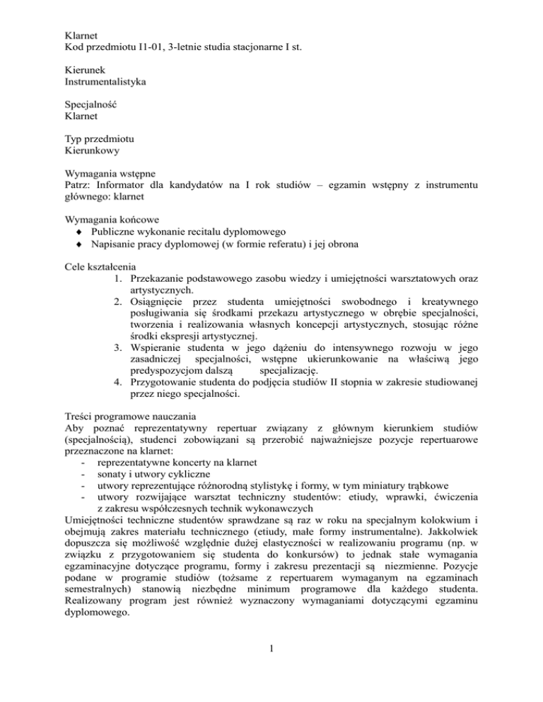 Klarnet Kod przedmiotu I1-01, 3-letnie studia stacjonarne I st. Kierunek Instrumentalistyka Specjalność Klarnet Typ przedmiotu Kierunkowy Wymagania wstępne Patrz: Informator dla kandydatów na I rok studiów – egzamin wstępny z instrumentu głównego: klarnet Wymagania końcowe Publiczne wykonanie recitalu dyplomowego Napisanie pracy dyplomowej (w formie referatu) i jej obrona Cele kształcenia 1. Przekazanie podstawowego zasobu wiedzy i umiejętności warsztatowych oraz artystycznych. 2. Osiągnięcie przez studenta umiejętności swobodnego i kreatywnego posługiwania się środkami przekazu artystycznego w obrębie specjalności, tworzenia i realizowania własnych koncepcji artystycznych, stosując różne środki ekspresji artystycznej. 3. Wspieranie studenta w jego dążeniu do intensywnego rozwoju w jego zasadniczej specjalności, wstępne ukierunkowanie na właściwą jego predyspozycjom dalszą specjalizację. 4. Przygotowanie studenta do podjęcia studiów II stopnia w zakresie studiowanej przez niego specjalności. Treści programowe nauczania Aby poznać reprezentatywny repertuar związany z głównym kierunkiem studiów (specjalnością), studenci zobowiązani są przerobić najważniejsze pozycje repertuarowe przeznaczone na klarnet: - reprezentatywne koncerty na klarnet - sonaty i utwory cykliczne - utwory reprezentujące różnorodną stylistykę i formy, w tym miniatury trąbkowe - utwory rozwijające warsztat techniczny studentów: etiudy, wprawki, ćwiczenia z zakresu współczesnych technik wykonawczych Umiejętności techniczne studentów sprawdzane są raz w roku na specjalnym kolokwium i obejmują zakres materiału technicznego (etiudy, małe formy instrumentalne). Jakkolwiek dopuszcza się możliwość względnie dużej elastyczności w realizowaniu programu (np. w związku z przygotowaniem się studenta do konkursów) to jednak stałe wymagania egzaminacyjne dotyczące programu, formy i zakresu prezentacji są niezmienne. Pozycje podane w programie studiów (tożsame z repertuarem wymaganym na egzaminach semestralnych) stanowią niezbędne minimum programowe dla każdego studenta. Realizowany program jest również wyznaczony wymaganiami dotyczącymi egzaminu dyplomowego. 1 Zamierzone efekty kształcenia (uczenia się) Po ukończeniu I cyklu studiów studenci specjalności klarnet powinni: W zakresie wiedzy: - dysponować wiedzą dotyczącą repertuaru związanego z własną specjalnością (K_W02) - docierać do niezbędnych informacji (książki, nagrania, materiały nutowe, internet), potrafić je analizować i interpretować we właściwy sposób (K_W04) - świadomie wykorzystywać wzajemne relacje pomiędzy teoretycznymi i praktycznymi elementami studiów oraz zdolność do integrowania nabytej wiedzy (K_W07) W zakresie umiejętności: - tworzyć, realizować i wyrażać własne koncepcje artystyczne oraz samodzielnie interpretować utwory muzyczne w oparciu o własne twórcze motywacje (K_U01) - czytać teksty nutowe na poziomie umożliwiającym ich szybkie opanowanie (również pamięciowe), zrozumienie ich kontekstu historycznego, formy i innych zawartych w nich treści (K_U09) - opanować warsztat techniczny potrzebny do profesjonalnej prezentacji muzycznej (K_U10) - ćwiczyć we właściwy sposób unikając zagrożeń wynikających z codziennego parogodzinnego obcowania z instrumentem (K_U11) - przez częste występy publiczne radzić sobie z różnymi stresowymi sytuacjami z nich wynikającymi, jak również reagować na rozmaite warunki akustyczne sal, w których występują (K_U17) - wypowiadać się ustnie i pisemnie na temat interpretowania, tworzenia i odtwarzania muzyki oraz na temat kwestii dotyczących szeroko pojmowanych tematów ogólnohumanistycznych (dotyczy pracy licencjackiej i jej obrony) (K_U15) W zakresie kompetencji społecznych: - w sposób świadomy korzystać (poprzez umiejętność samooceny) ze swej emocjonalności, wyobraźni i intuicji. Dotyczy to również umiejętności konstruktywnej oceny wykonań innych wykonawcówn(K_K12) posługiwać się fachową terminologią z zakresu dziedziny muzyki (dotyczy pracy licencjackiej i jej obrony) (K_K10) Metody nauczania Wykłady, zajęcia indywidualne Nakład pracy studenta potrzebny do osiągnięcia efektów uczenia się Rok I II Semestr 1 2 3 4 5 6 Punkty ECTS 10 10 12 12 12 12 Ilość godzin w tygodniu 2 2 2 2 2 2 Rodzaj zaliczenia ekm ekm ekm ekm ekm zal Legenda zal – zaliczenie; zst – zaliczenie ze stopniem; egz – egzamin; ekm – egzamin komisyjny Kryteria oceny: 2 III warsztat wykonawczy – umiejętności techniczne opanowanie i zrozumienie tekstu muzycznego, logika narracji muzycznej frazowanie umiejętność wypowiedzi w różnych stylach i formach muzycznych kształtowanie dźwięku i jego jakość estetyczna intonacja Skala ocen: według obowiązującej na Wydziale Instrumentalnym tabeli punktacyjnej Literatura (piśmiennictwo) David Pino- The Clarinet and clarinet playing, 1980 Dover publications Język wykładowy Polski, możliwość prowadzenia zajęć w innych językach: angielski, francuski Imię i nazwisko wykładowcy prof. Mieczysław Stachura, prof. Jan Tatarczyk Ad. dr hab. Jan Jakub Bokun Załącznik: PROGRAM STUDIÓW (Klarnet) - 3 letnie niestacjonarne studia l st. Etiudy: C.Baermann E.Cavallini P.Jeanjean Szkoła gry na klarnecie, Op. 63 (Tomy 4 and 5) 30 Capricci 18 Etudes 16 Etudes Modernes Etudes Progressive et Melodique E.Mandat Finger Food V.Polatschek Advanced Studies 12 Etudes C.Rose 40 Studies 32 Etudes 20 Grand Studies F.Thurston Passage Studies A. UHL 48 Etudes D.Scarlatti/J.P.Post Sonates Inne etiudy o zbliżonym stopniu trudności. Koncerty: F.Busoni Concertino op.48 J.G.Mann Koncert klarnetowy op.90 J.Rivier Koncert na klarnet i smyczki M.Magin Koncert klarnetowy L.Spohr Koncert no.3 WoO19, nr 4 WoO20 E.Bozza Koncert klarnetowy H.Tomasi Koncert klarnetowy A. Tansmann Koncert klarnetowy K.Sikorski Koncert klarnetowy O. Kukal Clarinettino In
