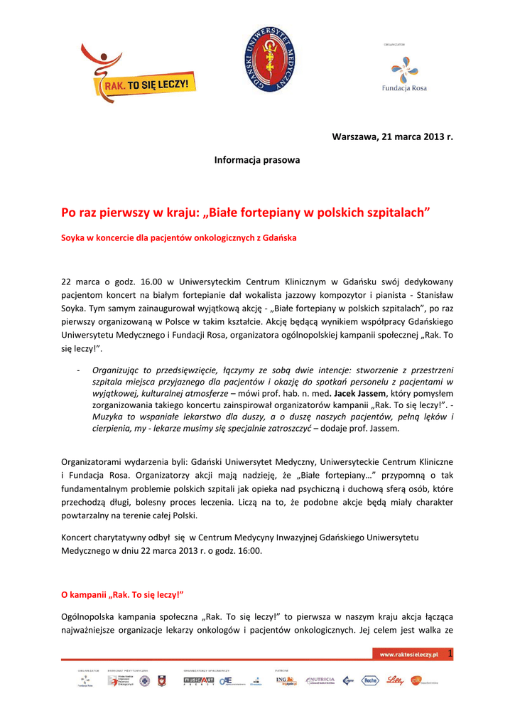 Warszawa, 21 marca 2013 r. Informacja prasowa Po raz pierwszy w kraju: „Białe fortepiany w polskich szpitalach” Soyka w koncercie dla pacjentów onkologicznych z Gdańska 22 marca o godz. 16.00 w Uniwersyteckim Centrum Klinicznym w Gdańsku swój dedykowany pacjentom koncert na białym fortepianie dał wokalista jazzowy kompozytor i pianista - Stanisław Soyka. Tym samym zainaugurował wyjątkową akcję - „Białe fortepiany w polskich szpitalach”, po raz pierwszy organizowaną w Polsce w takim kształcie. Akcję będącą wynikiem współpracy Gdańskiego Uniwersytetu Medycznego i Fundacji Rosa, organizatora ogólnopolskiej kampanii społecznej „Rak. To się leczy!”. - Organizując to przedsięwzięcie, łączymy ze sobą dwie intencje: stworzenie z przestrzeni szpitala miejsca przyjaznego dla pacjentów i okazję do spotkań personelu z pacjentami w wyjątkowej, kulturalnej atmosferze – mówi prof. hab. n. med. Jacek Jassem, który pomysłem zorganizowania takiego koncertu zainspirował organizatorów kampanii „Rak. To się leczy!”. Muzyka to wspaniałe lekarstwo dla duszy, a o duszę naszych pacjentów, pełną lęków i cierpienia, my - lekarze musimy się specjalnie zatroszczyć – dodaje prof. Jassem. Organizatorami wydarzenia byli: Gdański Uniwersytet Medyczny, Uniwersyteckie Centrum Kliniczne i Fundacja Rosa. Organizatorzy akcji mają nadzieję, że „Białe fortepiany…” przypomną o tak fundamentalnym problemie polskich szpitali jak opieka nad psychiczną i duchową sferą osób, które przechodzą długi, bolesny proces leczenia. Liczą na to, że podobne akcje będą miały charakter powtarzalny na terenie całej Polski. Koncert charytatywny odbył się w Centrum Medycyny Inwazyjnej Gdańskiego Uniwersytetu Medycznego w dniu 22 marca 2013 r. o godz. 16:00. O kampanii „Rak. To się leczy!” Ogólnopolska kampania społeczna „Rak. To się leczy!” to pierwsza w naszym kraju akcja łącząca najważniejsze organizacje lekarzy onkologów i pacjentów onkologicznych. Jej celem jest walka ze 1 społecznymi stereotypami na temat chorób nowotworowych oraz zachęcenie Polaków do badań profilaktycznych. To kampania, która poprzez wskazywanie sposobów wczesnej diagnostyki i innowacyjnych metod leczenia, obalanie mitów i przesądów związanych z nowotworami oraz pokazywanie pozytywnych przykładów ma przekonać Polaków, że rak w porę wykryty jest uleczalny. Organizatorem kampanii jest Fundacja Rosa, której merytorycznego wsparcia udzieliły: Polska Koalicja Organizacji Pacjentów Onkologicznych, Polskie Towarzystwo Onkologiczne, Polska Unia Onkologów, Polskie Towarzystwo Onkologów Klinicznych oraz Towarzystwo Chirurgów Polskich. Dzięki współpracy tych środowisk powstała platforma www.raktosieleczy.pl, która gromadzi informacje przydatne każdemu, kto poszukuje wiedzy o dostępnych badaniach profilaktycznych, ośrodkach medycznych, metodach leczenia, wskazówkach. Jak zapowiada Bohdan Pecuszok, Prezes Fundacji Rosa, edukacja i doraźne zaspokajanie potrzeb pacjentów onkologicznych jest priorytetem fundacji na najbliższe lata. Fundacja była również organizatorem zakończonego właśnie plebiscytu „Złote Krople Rosy”, w którym internauci wybierali człowieka najbardziej zaangażowanego w problematyką onkologiczną, oddział onkologiczny najbardziej przyjazny pacjentom, zaś Kapituła ekspertów wyłoniła najlepszą akcję roku 2012 na rzecz walki z rakiem. Organizatorzy kampanii pragną również przełamać lęk przed nowotworem i zmienić język opisujący go. Dlatego zaprosili do współpracy znanych i lubianych aktorów z różnych pokoleń, aby zachęcali Polaków do badań: Jerzego Stuhra, Cezarego Pazurę, Stanisława Mikulskiego i Jarosława Boberka. Oficjalna strona kampanii: www.raktosieleczy.pl Centrum Medycyny Inwazyjnej (UCK) Centrum Medycyny Inwazyjnej (UCK) to według wielu specjalistów jeden z najnowocześniejszych obecnie szpitali w Europie, powstał by podnieść poziom opieki nad pacjentami po wypadkach co daje szanse dotarcia z profesjonalną pomocą do większej liczby pacjentów. Centrum Medycyny Inwazyjnej jako Centrum Urazowe jest specjalistycznym ośrodkiem, gdzie trafiają w stanie ciężkim pacjenci wymagającym błyskawicznej diagnozy lekarzy kilku specjalizacji. Są to przeważnie ofiary wypadków z poważnymi, rozległymi i wielonarządowymi urazami. „Białe fortepiany w polskich szpitalach” to przedsięwzięcie dzięki, któremu gospodarze Centrum Medycyny Inwazyjnej chcą zadbać o to, aby przestrzeń szpitala była przyjazna dla pacjenta, nie kojarzyła się jedynie z chorobami i stresem. Udowadniają w ten sposób, że widzią opiekę nad chorymi nieco szerzej, a równocześnie stwarzają wyjątkową okazję do spotkań pacjentów, w bardziej kulturalnym enturage’u. 2 Kontakt dla mediów: Alicja Zakrzewska, agencja Fama PR e-mail: [email protected], kom.. 605 73 46 38 Anna Nowocień-Rega, Fundacja Rosa e-mail: [email protected], kom. 607 233 699 Natalia Wosiek, Gdański Uniwersytet Medyczny e-mail: [email protected], kom. 516 019 753 3 4