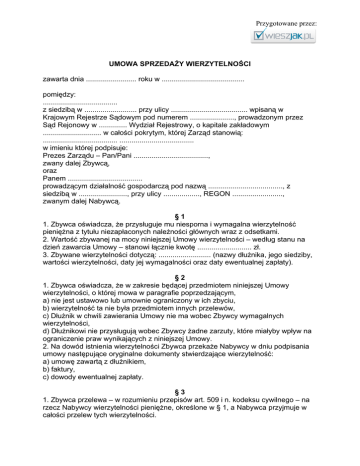 Przygotowane przez: UMOWA SPRZEDAŻY WIERZYTELNOŚCI zawarta dnia ......................... roku w ......................................... pomiędzy: ..................................... z siedzibą w .......................... przy ulicy ...................................... wpisaną w Krajowym Rejestrze Sądowym pod numerem ......................, prowadzonym przez Sąd Rejonowy w .............. Wydział Rejestrowy, o kapitale zakładowym ............................. w całości pokrytym, której Zarząd stanowią: ..................................... ..................................... w imieniu której podpisuje: Prezes Zarządu – Pan/Pani ....................................., zwany dalej Zbywcą, oraz Panem ..................................... prowadzącym działalność gospodarczą pod nazwą ....................................., z siedzibą w ........................, przy ulicy .................., REGON ........................., zwanym dalej Nabywcą. §1 1. Zbywca oświadcza, że przysługuje mu niesporna i wymagalna wierzytelność pieniężna z tytułu niezapłaconych należności głównych wraz z odsetkami. 2. Wartość zbywanej na mocy niniejszej Umowy wierzytelności – według stanu na dzień zawarcia Umowy – stanowi łącznie kwotę ........................... zł. 3. Zbywane wierzytelności dotyczą: .......................... (nazwy dłużnika, jego siedziby, wartości wierzytelności, daty jej wymagalności oraz daty ewentualnej zapłaty). §2 1. Zbywca oświadcza, że w zakresie będącej przedmiotem niniejszej Umowy wierzytelności, o której mowa w paragrafie poprzedzającym, a) nie jest ustawowo lub umownie ograniczony w ich zbyciu, b) wierzytelność ta nie była przedmiotem innych przelewów, c) Dłużnik w chwili zawierania Umowy nie ma wobec Zbywcy wymagalnych wierzytelności, d) Dłużnikowi nie przysługują wobec Zbywcy żadne zarzuty, które miałyby wpływ na ograniczenie praw wynikających z niniejszej Umowy. 2. Na dowód istnienia wierzytelności Zbywca przekaże Nabywcy w dniu podpisania umowy następujące oryginalne dokumenty stwierdzające wierzytelność: a) umowę zawartą z dłużnikiem, b) faktury, c) dowody ewentualnej zapłaty. §3 1. Zbywca przelewa – w rozumieniu przepisów art. 509 i n. kodeksu cywilnego – na rzecz Nabywcy wierzytelności pieniężne, określone w § 1, a Nabywca przyjmuje w całości przelew tych wierzytelności. Przygotowane przez: 2. Przelew wierzytelności na rzecz Nabywcy następuje z chwilą podpisania niniejszej Umowy. 3. Wraz z wierzytelnościami Zbywca przenosi na Nabywcę wszelkie związane z nimi prawa, w tym prawo do odsetek za opóźnienie. §4 1. Zbywca zobowiązuje się do niezwłocznego, pisemnego zawiadomienia Dłużnika o dokonaniu przelewu wierzytelności. 2. W przypadku spłacenia całości lub części wierzytelności na rzecz Zbywcy, Zbywca zobowiązuje się do niezwłocznego przekazania otrzymanych należności na rzecz Nabywcy. §5 1. Strony zgodnie ustalają, że tytułem przeniesienia praw własności wierzytelności Nabywca zapłaci Zbywcy kwotę ................................ zł w formie polecenia przelewu na Jego rachunek numer ................................ w ...................................... 2. Ustala się następujące warunki płatności: Nabywca zapłaci należność wymienioną w ust. 1 w terminie ........................ dni od daty podpisania niniejszej umowy. §6 Zbywca odpowiada za to, że wierzytelność mu przysługuje. §7 1. Strony zgodnie ustalają, iż zastrzegają dla niniejszej Umowy formę pisemną pod rygorem nieważności. 2. Zmiany Umowy wymagają odrębnego dokumentu sporządzonego w formie pisemnej pod rygorem nieważności. 3. Jeśli którekolwiek z postanowień Umowy okaże się sprzeczne z prawem, niewykonalne lub w inny sposób nieważne, Umowa pozostaje w mocy, a takie postanowienie będzie uważane za nieistniejące lub zostanie przez Strony zastąpione postanowieniem ważnym. §8 Koszty związane z zawarciem niniejszej Umowy ponosi w całości Nabywca. §9 W kwestiach nie unormowanych niniejszą Umową zastosowanie mają odpowiednie przepisy kodeksu cywilnego. § 10 Umowa została sporządzona w dwóch jednobrzmiących egzemplarzach, po jednym dla każdej ze stron. ..................................... Zbywca Przygotowane przez: ..................................... Nabywca