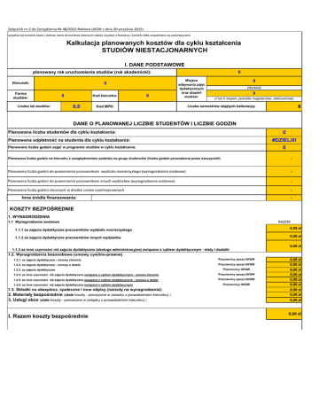 Załącznik nr 2 do Zarządzenia Nr 48/2015 Rektora UKSW z dnia 30 września 2015r. wypełnia się komórki szare i zielone; dane do komórek zielonych należy uzyskać z Kwestury; komórki żółte uzupełniane są automatycznie Kalkulacja planowanych kosztów dla cyklu kształcenia STUDIÓW NIESTACJONARNYCH I. DANE PODSTAWOWE planowany rok uruchomienia studiów (rok akademicki): 0 Kierunek: Forma studiów: Liczba lat studiów: 0 Kod kierunku: 0,0 0 0 Miejsce odbywania zajęć dydaktycznych oraz stopień studiów: Kod MPK: 0 (Wydział) 0 (I lub II stopień, jednolite magisterskie, doktoranckie) 0 Liczba semestrów objętych kalkulacją: DANE O PLANOWANEJ LICZBIE STUDENTÓW I LICZBIE GODZIN 0 Planowana liczba studentów dla cyklu kształcenia: #DZIEL/0! 0 Planowana odpłatność na studenta dla cyklu kształcenia: Planowana liczba godzin zajęć w programie studiów w cyklu kształcenia: Planowana liczba godzin na kierunku z uwzględnieniem podziału na grupy studenckie (liczba godzin prowadzona przez nauczycieli) - Planowana liczba godzin do powierzenia pracownikom wydziału macierzystego (wynagrodzenia osobowe) - Planowana liczba godzin do powierzenia pracownikom innych wydziałów (wynagrodzenia osobowe) - Planowana liczba godzin zleconych w drodze umów cywilnoprawnych - Inne źródła finansowania: - KOSZTY BEZPOŚREDNIE 1. WYNAGRODZENIA 1.1 Wynagrodzenia osobowe RAZEM 1.1.1 za zajęcia dydaktyczne pracowników wydziału macierzystego 0,00 zł 1.1.2 za zajęcia dydaktyczne pracowników innych wydziałów 0,00 zł 1.1.3 za inne czynności niż zajęcia dydaktyczne (obsługa administracyjna) związane z cyklem dydaktycznym - etaty i dodatki 0,00 zł 1.2. Wynagrodzenia bezosobowe (umowy cywilno-prawne) 1.2.1. za zajęcia dydaktyczne - umowy zlecenia Pracownicy spoza UKSW 1.2.2. za zajęcia dydaktyczne - umowy o dzieło Pracownicy spoza UKSW 1.2.3. za zajęcia dydaktyczne Pracownicy UKSW 1.2.4. za inne czynności niż zajęcia dydaktyczne związane z cyklem dydaktycznym - umowa zlecenie Pracownicy spoza UKSW 1.2.5. za inne czynności niż zajęcia dydaktyczne związane z cyklem dydaktycznym - umowa o dzieło Pracownicy spoza UKSW 1.2.6. za inne czynności niż zajęcia dydaktyczne związane z cyklem dydaktycznym 1.3. Składki na ubezpiecz. społeczne i inne odpisy (narzuty na wynagrodzenia): 2. Materiały bezpośrednie (stałe koszty - ponoszone w zwiazku z prowadzeniem kierunku) : 3. Usługi obce (stałe koszty - ponoszone w związku z prowadzeniem kierunku) : I. Razem koszty bezpośrednie Pracownicy UKSW 0,00 zł 0,00 zł 0,00 zł 0,00 zł 0,00 zł 0,00 zł 0,00 zł 0,00 zł 0,00 zł 0,00 zł II. Koszty pośrednie 1. Narzut kosztów wydziałowych: 0,00% 0 zł od kosztów bezpośrednich tj. od kwoty: 0,00 zł WYDZIAŁOWY KOSZT KSZTAŁCENIA (koszty bezpośrednie + koszty pośrednie wydziałowe): 2. Narzut kosztów ogólnouczelnianych: od 0,00% wydział. kosztów kształcenia, tj. od kwoty: 3. Narzut kosztów przygotowania i wdrożenia strategii rozwoju uczelni: 0,00% 0,00 zł od wydział. kosztów kształcenia, tj. od kwoty: 0 zł 0,00 zł 0 zł 0,00 zł 0,00 zł UCZELNIANY KOSZT KSZTAŁCENIA (koszty bezpośrednie+koszty pośrednie wydziałowe i ogólnouczelniane): III. Rezerwy Rezerwa na dofinansowanie odpłatności za studia (umorzenia): 5% 0 zł od uczelnianego kosztu kształcenia tj. od kwoty: 0,00 zł UCZELNIANY KOSZT KSZTAŁCENIA + REZERWY 0,00 zł Roczny koszt kształcenia w przeliczeniu na jednego studenta - zł Roczny koszt kształcenia w przeliczeniu na jednego studenta ze wskaźnikiem ryzyka przychodów - zł IV. Prognozowane przychody Prognozowane przychody z tyt. odpłatności za cykl kształcenia: 0,00 zł Prognozowane przychody z pozostałych źródeł 0,00 zł PROGNOZOWANY WYNIK ZA CYKL KSZTAŁCENIA 0,00 zł Warszawa, dnia Pod względem merytorycznym: OPRACOWAŁ(A) DZIEKAN WYDZIAŁU …………………………………………………………… …………………………………………………………… Pod względem formalno-rachunkowym: Akceptuję KWESTOR REKTOR …………………………………………………………… ……………………………………………………………