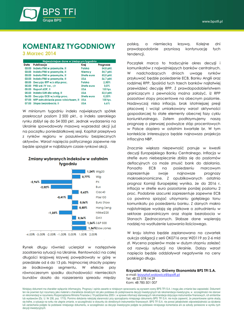 KOMENTARZ TYGODNIOWY 3 Marzec 2014 W minionym tygodniu indeks największych spółek przekroczył poziom 2 500 pkt., a indeks szerokiego rynku zbliżył się do 54 000 pkt. Jednak wydarzenia na Ukrainie spowodowały masową wyprzedaż akcji już na początku poniedziałkowej sesji. Kapitał przepływa z rynków regionu w poszukiwaniu bezpiecznych aktywów. Wzrost napięcia politycznego zapewne nie będzie sprzyjał w najbliższym czasie rynkowi akcji. Rynek długu również ucierpiał w następstwie zaostrzenia sytuacji na Ukrainie. Rentowności na całej długości krajowej krzywej powędrowały w górę w przedziale od 6 do 13 pb. Najmocniej straciły papiery ze środkowego segmentu. W efekcie przy równoczesnym spadku dochodowości niemieckich bundów doszło do rozszerzenia spreadu między polską, a niemiecką krzywą. Kolejne prawdopodobnie przyniosą kontynuację tendencji. dni tych Początek marca to tradycyjnie okres decyzji i komunikatów z najważniejszych banków centralnych. W nadchodzących dniach uwagę rynków przykuwać będzie posiedzenie ECB, Banku Anglii oraz rodzimej RPP. Spośród tych trzech banków najłatwiej przewidzieć decyzję RPP. Z prawdopodobieństwem graniczącym z pewnością można założyć, iż RPP pozostawi stopy procentowe na obecnym poziomie. Nadzwyczaj niska inflacja, brak istotniejszej presji płacowej i wciąż umiarkowany wzrost aktywności gospodarczej to stałe elementy obecnej fazy cyklu koniunkturalnego. Zatem podtrzymujemy naszą prognozę o pierwszej podwyżce stóp procentowych w Polsce dopiero w ostatnim kwartale br. W tym kontekście interesująca będzie najnowsza projekcja inflacyjna NBP. Znacznie większa niepewność panuje w kwestii decyzji Europejskiego Banku Centralnego. Inflacja w strefie euro niebezpiecznie zbliża się do poziomów deflacyjnych co może zmusić bank do działania. Ponadto ECB na posiedzeniu marcowym zaprezentuje swoje najnowsze prognozy makroekonomiczne. Z opublikowanych ostatnio prognoz Komisji Europejskiej wynika, że do 2016 r. inflacja w strefie euro pozostanie poniżej poziomu 2 proc. Podobnie szacunki zaprezentuje zapewne ECB co powinno sprzyjać utrzymaniu gołębiego tonu komunikatu po posiedzeniu banku. Z danych makro najistotniejsze wydają się piątkowe o zatrudnieniu w sektorze pozarolniczym oraz stopie bezrobocia w Stanach Zjednoczonych. Słabsze dane wspierają nadziej na wydłużenie luzowania ilościowego. W kraju istotna będzie zaplanowana na czwartek aukcja obligacji z serii OK0716 oraz WZ0119 za 2-6 mld zł. Wycena papierów może w dużym stopniu zależeć od rozwoju sytuacji na Ukrainie. Dalszy wzrost napięcia będzie oddziaływał negatywnie na ceny polskiego długu. Krzysztof Wołowicz, Główny Ekonomista BPS TFI S.A. e-mail: [email protected] Tel: 48 22 578 14 29 Kom: 48 785 501 007 Niniejszy dokument ma charakter wyłącznie informacyjny. Prognozy i opinie zawarte w niniejszym opracowaniu są wyrazem oceny BPS TFI S.A. i mogą ulec zmianie bez zapowiedzi. Dokument ten nie powinien być rozumiany jako materiał o charakterze doradczym lub jako podstawa do podejmowania decyzji inwestycyjnych lub rekomendacja inwestycyjna, w szczególności nie stanowi on rekomendacji w rozumieniu Rozporządzenia Ministra Finansów z 19 października 2005 r. w sprawie informacji stanowiących rekomendacje dotyczące instrumentów finansowych, ich emitentów lub wystawców (Dz. U. Nr 206, poz. 1715). Pomimo dołożenia należytej staranności przy sporządzaniu niniejszego dokumentu BPS TFI S.A. nie może zapewnić, że prezentowane opinie okażą się trafne, a sytuacja na rynku nie ulegnie zmianie, w szczególności w stosunku do określonych instrumentów finansowych. BPS TFI S.A. nie ponosi jakiejkolwiek odpowiedzialności za działania lub zaniechania podjęte na podstawie niniejszego dokumentu, w szczególności za decyzje inwestycyjne podjęte na podstawie niniejszego komentarza ani za szkody poniesione w wyniku tych decyzji inwestycyjnych.