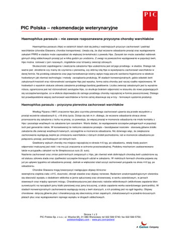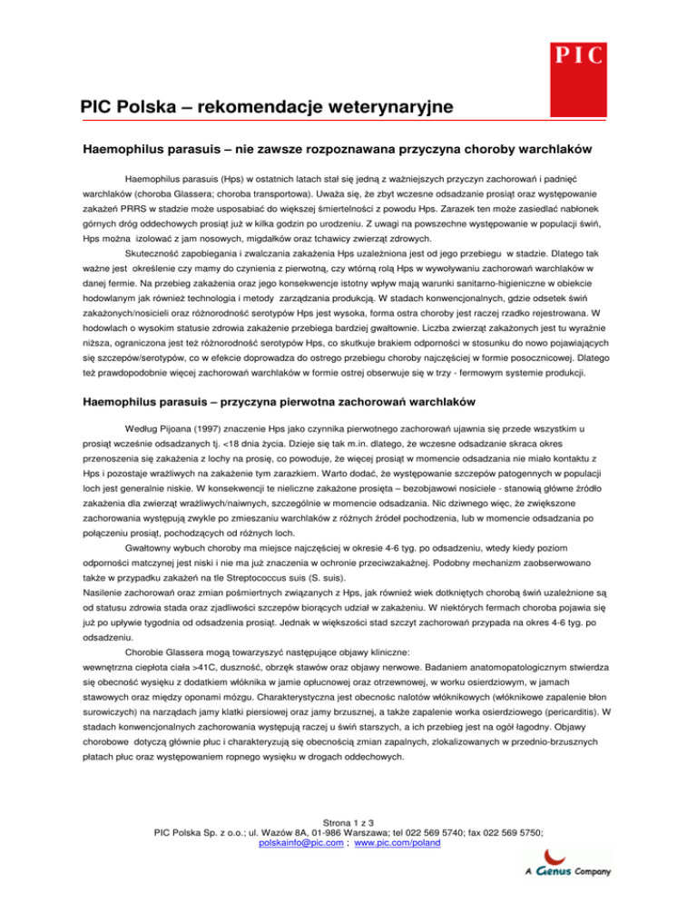 PIC Polska – rekomendacje weterynaryjne Haemophilus parasuis – nie zawsze rozpoznawana przyczyna choroby warchlaków Haemophilus parasuis (Hps) w ostatnich latach stał się jedną z waŜniejszych przyczyn zachorowań i padnięć warchlaków (choroba Glassera; choroba transportowa). UwaŜa się, Ŝe zbyt wczesne odsadzanie prosiąt oraz występowanie zakaŜeń PRRS w stadzie moŜe usposabiać do większej śmiertelności z powodu Hps. Zarazek ten moŜe zasiedlać nabłonek górnych dróg oddechowych prosiąt juŜ w kilka godzin po urodzeniu. Z uwagi na powszechne występowanie w populacji świń, Hps moŜna izolować z jam nosowych, migdałków oraz tchawicy zwierząt zdrowych. Skuteczność zapobiegania i zwalczania zakaŜenia Hps uzaleŜniona jest od jego przebiegu w stadzie. Dlatego tak waŜne jest określenie czy mamy do czynienia z pierwotną, czy wtórną rolą Hps w wywoływaniu zachorowań warchlaków w danej fermie. Na przebieg zakaŜenia oraz jego konsekwencje istotny wpływ mają warunki sanitarno-higieniczne w obiekcie hodowlanym jak równieŜ technologia i metody zarządzania produkcją. W stadach konwencjonalnych, gdzie odsetek świń zakaŜonych/nosicieli oraz róŜnorodność serotypów Hps jest wysoka, forma ostra choroby jest raczej rzadko rejestrowana. W hodowlach o wysokim statusie zdrowia zakaŜenie przebiega bardziej gwałtownie. Liczba zwierząt zakaŜonych jest tu wyraźnie niŜsza, ograniczona jest teŜ róŜnorodność serotypów Hps, co skutkuje brakiem odporności w stosunku do nowo pojawiających się szczepów/serotypów, co w efekcie doprowadza do ostrego przebiegu choroby najczęściej w formie posocznicowej. Dlatego teŜ prawdopodobnie więcej zachorowań warchlaków w formie ostrej obserwuje się w trzy - fermowym systemie produkcji. Haemophilus parasuis – przyczyna pierwotna zachorowań warchlaków Według Pijoana (1997) znaczenie Hps jako czynnika pierwotnego zachorowań ujawnia się przede wszystkim u prosiąt wcześnie odsadzanych tj. <18 dnia Ŝycia. Dzieje się tak m.in. dlatego, Ŝe wczesne odsadzanie skraca okres przenoszenia się zakaŜenia z lochy na prosię, co powoduje, Ŝe więcej prosiąt w momencie odsadzania nie miało kontaktu z Hps i pozostaje wraŜliwych na zakaŜenie tym zarazkiem. Warto dodać, Ŝe występowanie szczepów patogennych w populacji loch jest generalnie niskie. W konsekwencji te nieliczne zakaŜone prosięta – bezobjawowi nosiciele - stanowią główne źródło zakaŜenia dla zwierząt wraŜliwych/naiwnych, szczególnie w momencie odsadzania. Nic dziwnego więc, Ŝe zwiększone zachorowania występują zwykle po zmieszaniu warchlaków z róŜnych źródeł pochodzenia, lub w momencie odsadzania po połączeniu prosiąt, pochodzących od róŜnych loch. Gwałtowny wybuch choroby ma miejsce najczęściej w okresie 4-6 tyg. po odsadzeniu, wtedy kiedy poziom odporności matczynej jest niski i nie ma juŜ znaczenia w ochronie przeciwzakaźnej. Podobny mechanizm zaobserwowano takŜe w przypadku zakaŜeń na tle Streptococcus suis (S. suis). Nasilenie zachorowań oraz zmian pośmiertnych związanych z Hps, jak równieŜ wiek dotkniętych chorobą świń uzaleŜnione są od statusu zdrowia stada oraz zjadliwości szczepów biorących udział w zakaŜeniu. W niektórych fermach choroba pojawia się juŜ po upływie tygodnia od odsadzenia prosiąt. Jednak w większości stad szczyt zachorowań przypada na okres 4-6 tyg. po odsadzeniu. Chorobie Glassera mogą towarzyszyć następujące objawy kliniczne: wewnętrzna ciepłota ciała >41C, duszność, obrzęk stawów oraz objawy nerwowe. Badaniem anatomopatologicznym stwierdza się obecność wysięku z dodatkiem włóknika w jamie opłucnowej oraz otrzewnowej, w worku osierdziowym, w jamach stawowych oraz między oponami mózgu. Charakterystyczna jest obecnośc nalotów włóknikowych (włóknikowe zapalenie błon surowiczych) na narządach jamy klatki piersiowej oraz jamy brzusznej, a takŜe zapalenie worka osierdziowego (pericarditis). W stadach konwencjonalnych zachorowania występują raczej u świń starszych, a ich przebieg jest na ogół łagodny. Objawy chorobowe dotyczą głównie płuc i charakteryzują się obecnością zmian zapalnych, zlokalizowanych w przednio-brzusznych płatach płuc oraz występowaniem ropnego wysięku w drogach oddechowych. Strona 1 z 3 PIC Polska Sp. z o.o.; ul. Wazów 8A, 01-986 Warszawa; tel 022 569 5740; fax 022 569 5750; [email protected] ; www.pic.com/poland PIC Polska – rekomendacje weterynaryjne Zasady profilaktyki swoistej zakaŜenia pierwotnego Hps Przy opracowywaniu metod zapobiegania i zwalczania choroby Glassera w pierwszym rzędzie naleŜy scharakteryzować szczepy Hps, izolowane z przypadków chorobowych. Warto podkreślić, Ŝe w ramach gatunku Hps rozróŜnia się 15 serotypów. Tak duŜa róŜnorodność serotypów jak równieŜ duŜa liczba szczepów trudnych do typowania serologicznego znacznie utrudnia opracowanie uniwersalnej szczepionki. NaleŜy pamiętać, Ŝe szczepienia chronią tylko przed zakaŜeniem homologicznymi szczepami/serotypami Hps tzn. takimi, których antygeny są zawarte w szczepionce. Nie występuje tu odporność krzyŜowa. Tak więc charakterystyka serologiczna wyizolowanych szczepów jest warunkiem niezbędnym przy wyborze biopreparatu komercyjnego, potencjalnie najbardziej skutecznego w danym stadzie. Wykazano, Ŝe zastosowanie szczepionki, zawierającej szczepy podobne – homologiczne pod względem antygenowym daje satysfakcjonujące wyniki w zapobieganiu zachorowaniom na tle Hps. Alternatywą dla szczepionek komercyjnych, przy ich braku na rynku, moŜe być autoszczepionka. NaleŜy jednak podkreślić, Ŝe jej skuteczność uzaleŜniona będzie od właściwego doboru szczepów Hps do jej przygotowania. O tym powinny decydować nie tylko badania serologiczne, ale takŜe badania genotypowe, pozwalające scharakteryzować i porównać izolaty Hps pod kątem ich przydatności do produkcji autosz