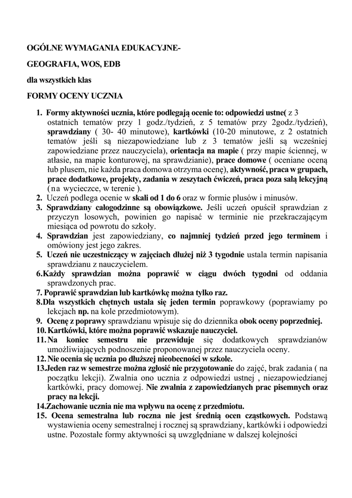 OGÓLNE WYMAGANIA EDUKACYJNEGEOGRAFIA, WOS, EDB dla wszystkich klas FORMY OCENY UCZNIA 1. Formy aktywności ucznia, które podlegają ocenie to: odpowiedzi ustne( z 3 ostatnich tematów przy 1 godz./tydzień, z 5 tematów przy 2godz./tydzień), sprawdziany ( 30- 40 minutowe), kartkówki (10-20 minutowe, z 2 ostatnich tematów jeśli są niezapowiedziane lub z 3 tematów jeśli są wcześniej zapowiedziane przez nauczyciela), orientacja na mapie ( przy mapie ściennej, w atłasie, na mapie konturowej, na sprawdzianie), prace domowe ( oceniane oceną łub plusem, nie każda praca domowa otrzyma ocenę), aktywność, praca w grupach, prace dodatkowe, projekty, zadania w zeszytach ćwiczeń, praca poza salą lekcyjną ( n a wycieczce, w terenie ). 2. Uczeń podlega ocenie w skali od 1 do 6 oraz w formie plusów i minusów. 3. Sprawdziany całogodzinne są obowiązkowe. Jeśli uczeń opuścił sprawdzian z przyczyn losowych, powinien go napisać w terminie nie przekraczającym miesiąca od powrotu do szkoły. 4. Sprawdzian jest zapowiedziany, co najmniej tydzień przed jego terminem i omówiony jest jego zakres. 5. Uczeń nie uczestniczący w zajęciach dłużej niż 3 tygodnie ustala termin napisania sprawdzianu z nauczycielem. 6.Każdy sprawdzian można poprawić w ciągu dwóch tygodni od oddania sprawdzonych prac. 7. Poprawić sprawdzian lub kartkówkę można tylko raz. 8.Dla wszystkich chętnych ustala się jeden termin poprawkowy (poprawiamy po lekcjach np. na kole przedmiotowym). 9. Ocenę z poprawy sprawdzianu wpisuje się do dziennika obok oceny poprzedniej. 10. Kartkówki, które można poprawić wskazuje nauczyciel. 11. Na koniec semestru nie przewiduje się dodatkowych sprawdzianów umożliwiających podnoszenie proponowanej przez nauczyciela oceny. 12. Nie ocenia się ucznia po dłuższej nieobecności w szkole. 13.Jeden raz w semestrze można zgłosić nie przygotowanie do zajęć, brak zadania ( na początku lekcji). Zwalnia ono ucznia z odpowiedzi ustnej , niezapowiedzianej kartkówki, pracy domowej. Nie zwalnia z zapowiedzianych prac pisemnych oraz pracy na lekcji. 14.Zachowanie ucznia nie ma wpływu na ocenę z przedmiotu. 15. Ocena semestralna lub roczna nie jest średnią ocen cząstkowych. Podstawą wystawienia oceny semestralnej i rocznej są sprawdziany, kartkówki i odpowiedzi ustne. Pozostałe formy aktywności są uwzględniane w dalszej kolejności FORMY SPRAWDZANIA WIEDZY I UMIEJĘTNOŚCI: 1. Wypowiedzi ustne - przynajmniej raz w semestrze, oceniane pod względem stosowania języka przedmiotu, umiejętności formułowania dłuższych wypowiedzi. Przy odpowiedzi ustnej obowiązuje znajomość materiału z trzech ostatnich lekcji przy jednej godzinie a z 5 przy dwóch godzinach, w przypadku lekcji powtórzeniowych- z całego działu. 2. Sprawdziany pisemne - przeprowadzane po zakończeniu każdego działu, zapowiedziane tydzień wcześniej. Sprawdziany mogą zawierać dodatkowe pytania (zadania) na ocenę celującą. 3. Kartkówki: - krótkie ( nie muszą być zapowiadane) formy równoznaczne z odpowiedzią ustną 4. Prace domowe- przynajmniej jedną w ciągu semestru, oceniane oceną lub plusem. 5. Aktywność na lekcji: a. aktywność cząstkowa znak „ plus" - uczeń otrzymuje ocenę bardzo dobrą, gdy zgromadzi trzy plusy przy 1 godzinie ,a 5 przy 2 godzinach, gdy uzyska ich mniej, w końcu semestru mogą zostać one zamienione odpowiednio: dwa plusy- ocena dobra, jeden plus- ocena dostateczna). Przy dużej aktywności na lekcji uczeń może otrzymać kilka ocen bardzo dobrych b. aktywność cząstkowa „ znak minus": - brak prostego zadania domowego - brak zeszytu ćwiczeń - brak koniecznych materiałów potrzebnych na lekcję - brak oznak pracy w grupie - niewykonywanie prostych czynności w toku lekcji 1 godzina tygodniowo trzy minusy- uczeń otrzymuje ocenę niedostateczną 2 godziny tygodniowo pięć minusów -uczeń otrzymuje ocenę niedostateczną Równoważna ilość znaków znosi się 6. Zadania w zeszycie ćwiczeń. 7. Praca w grupach oceniana oceną lub plusem. 8. Prace dodatkowe - schematy, plansze, wykresy, rysunki, albumy, prezentacje multimedialne, materiały pomocnicze do lekcji i inne w skali dobry- bardzo dobry, oraz w postaci plusów, które przelicza się na oceny analogicznie jak za aktywność na lekcji. 9. Praca poza salą lekcyjną (n a wycieczce, w terenie, projekt). W przypadku sprawdzianów pisemnych, kartkówek przyjmuje się punktową skalę przeliczaną na oceny wg kryteriów: 100% + zadanie dodatkowe - ocena celująca 90% - 99% - ocena bardzo dobra 75% - 89% - ocena dobra 51 % - 74% - ocena dostateczna 30% - 50% - ocena dopuszczająca 0% - 29% - ocena niedostateczna Ocenę celującą uczeń uzyskuje w przypadku, gdy osiągnie 100 procent poprawnych odpowiedzi lub rozwiąże zadanie dodatkowe. Uczniowie posiadający informacje o obniżeniu wymagań edukacyjnych otrzymują ocenę dopuszczającą po uzyskaniu 20% maksymalnej liczby punktów. Sposób wystawiania oceny semestralnej i rocznej a. uczeń wykazuje się wiedzą i umiejętnościami przewidzianymi w poszczególnych działach programowych b. ma minimum 50 procent obecności na lekcjach c. uczeń może uzyskać ocenę o stopień wyższą od proponowanej jeżeli zakwalifikował się do etapu wojewódzkiego, został laureatem konkursu przedmiotowego, innych konkursów geograficznych łub krajoznawczych i uzyskał miejsce od 1 do 3 lub wyróżnienie W przypadku gdy uczeń zgłosi chęć uzupełnienia braków z przedmiotu, nauczyciel chętnie udzieli pomocy podczas swoich zajęć dodatkowych. OGÓLNE KRYTERIA OCEN Z GEOGRAFII DLA WSZYSTKICH KLAS Ocenę celująca : otrzymuje uczeń, który: posiadł wiedzę i umiejętności znacznie wykraczające poza program nauczania geografii w danej klasie, samodzielnie i twórczo rozwija własne uzdolnienia oraz biegłe posługuje się zdobytymi wiadomościami w rozwiązywaniu problemów teoretycznych lub praktycznych, proponuje rozwiązania 