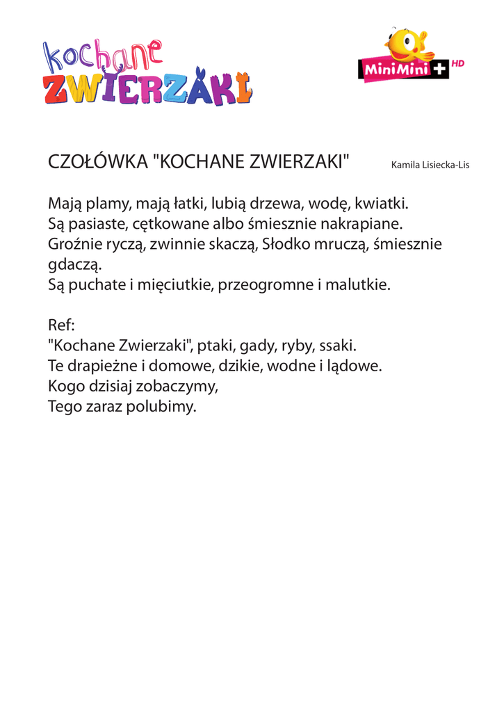 CZOŁÓWKA "KOCHANE ZWIERZAKI" Kamila Lisiecka-Lis Mają plamy, mają łatki, lubią drzewa, wodę, kwiatki. Są pasiaste, cętkowane albo śmiesznie nakrapiane. Groźnie ryczą, zwinnie skaczą, Słodko mruczą, śmiesznie gdaczą. Są puchate i mięciutkie, przeogromne i malutkie. Ref: "Kochane Zwierzaki", ptaki, gady, ryby, ssaki. Te drapieżne i domowe, dzikie, wodne i lądowe. Kogo dzisiaj zobaczymy, Tego zaraz polubimy.