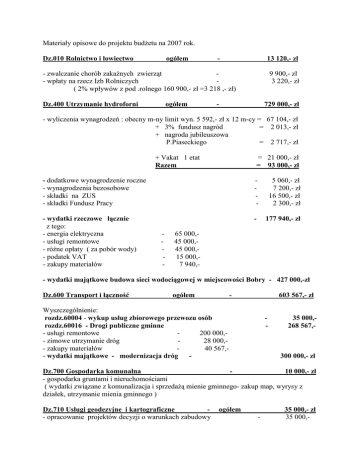 Materiały opisowe do projektu budŜetu na 2007 rok. Dz.010 Rolnictwo i łowiectwo ogółem - 13 120,- zł - zwalczanie chorób zakaźnych zwierząt - wpłaty na rzecz Izb Rolniczych ( 2% wpływów z pod .rolnego 160 900,- zł =3 218 ,- zł) Dz.400 Utrzymanie hydroforni ogółem 9 900,- zł 3 220,- zł - 729 000,- zł - wyliczenia wynagrodzeń : obecny m-ny limit wyn. 5 592,- zł x 12 m-cy = 67 104,- zł + 3% fundusz nagród = 2 013,- zł + nagroda jubileuszowa P.Piaseckiego = 2 717,- zł + Vakat 1 etat Razem = 21 000,- zł = 93 000,- zł - dodatkowe wynagrodzenie roczne - wynagrodzenia bezosobowe - składki na ZUS - składki Fundusz Pracy - 5 060,- zł 7 200,- zł 16 500,- zł 2 300,- zł - wydatki rzeczowe łącznie z tego: - energia elektryczna - usługi remontowe - róŜne opłaty ( za pobór wody) - podatek VAT - zakupy materiałów - 177 940,- zł - 65 000,45 000,45 000,15 000,7 940,- - wydatki majątkowe budowa sieci wodociągowej w miejscowości Bobry - 427 000,-zł Dz.600 Transport i łączność ogółem - 603 567,- zł Wyszczególnienie: rozdz.60004 - wykup usług zbiorowego przewozu osób rozdz.60016 - Drogi publiczne gminne - usługi remontowe 200 000,- zimowe utrzymanie dróg 28 000,- zakupy materiałów 40 567,- wydatki majątkowe - modernizacja dróg - - 35 000,268 567,- 300 000,- zł Dz.700 Gospodarka komunalna 10 000,- zł - gospodarka gruntami i nieruchomościami ( wydatki związane z komunalizacja i sprzedaŜą mienie gminnego- zakup map, wyrysy z działek, utrzymanie mienia gminnego ) Dz.710 Usługi geodezyjne i kartograficzne - opracowanie projektów decyzji o warunkach zabudowy ogółem - 35 000,- zł 35 000,- Dz.750 Administracja publiczna ogółem zadania zlecone – rozdz. 75011 -Urząd Wojewódzki - - 1 484 745 ,- zł 70 569,- zł - wynagrodzenia (wyk.2006 roku ) 44 904,- zł - dodatkowe wynagrodzenie roczne 4 896,- zł - składka ZUS 7 115,- zł - składka Fundusz Pracy 1 085,- zł - wydatki rzeczowe 6 129,- zł w tym: (zakupy materiałów biurowych, usługi, odpis na zakładowy fundusz świadczeń socjalnych) - zakupy inwestycyjne – zakup komputera z oprogramowaniem dla ewidencji ludności - 6 440,00 zł zadania własne - rozdz.75022 Rada Gminy 57 000,- zł - diety radnych - 52 482,wyliczenie : radni członkowie kom. 150 zł x 12 x 8 = 14 400 zł przewodniczący kom Z-ca PRG 162zł x 12 x 6 = 11 646 zł PRG 1 117 zł x 12 = 13 404 zł Sesje 6 posiedzeń 13 032 zł razem 52 482 zł - zakupy materiałów - zwroty kosztów podróŜy - 2 500 zł 2 018 zł rozdz. 75023 Urząd Gminy 1 315 176,- zł wynagrodzenia 788 734,wyliczenie : wynagrodzenie osobowe obecny. m-ny limit wynagrodzeń - 60 000,- x 12 = 720 000,Nagrody jubileuszowe 1) Borkowska 150% 2) Zaborowski 200% 3) Zagórowicz 200% 4) Gonciarek 100% 5) Styczyńska 100 % Fundusz nagród razem = 79 286,-wakaty 2 800,- x 12 = 33 600,- wzrost na wysługę lat = 1 748,Razem 834 634,Zadania zlecone - - 44 900,Razem 788 734,- dodatkowe wynagrodzenia roczne – 57 600,- - zad.zlec. 4 896,- = 52 704,- składki ZUS 145 822,- składki Fundusz Pracy – 20 616,- składki na PEFRON 17 000,- - wydatki rzeczowe razem – w tym: - zakupy materiałów biurowych – - usługi ( obsługa prawna ) - rozmowy telefoniczne - ubezpieczenia wyposaŜenia i budynków - opłaty licencyjne na programy komputerowe - wydatki majątkowe ( związane z komputeryzacją urzędu) - 240 300,- rozdz. 75075 Promocja gminy 42 000,- Dz. 751 ogółem 901,- wydatki rzeczowe aktualizacja stałego rejestru wyborców razem - 901,- Dz.754 rozdz.75412 OSP 50 000,- 75 700,- razem 65 000,- Wynagrodzenia - wyliczenia ob.limit m-ny 2050,- x 12 = 24 600,(kierowców i kom.OSP) - składki ZUS - 1 040,- składki Fundusz Pracy 150,- wydatki rzeczowe – razem - 35 500,w tym : - zakupy paliwa - zakupy wyposaŜenia - ubezpieczenie samochodów i straŜaków - usługi remontowe - energia elektryczna rozdz. 75414 Obrona Cywilna razem wyszczególnienie : - wydatki rzeczowe - wydatki majątkowe - utworzenie gminnego zespołu reagowania 10 700,700,- 10 000,- Dz.756 ogółem rozdz. 75647 - pobór podatków wyliczenie: - diety za udział w posiedzeniach sesji - inkaso podatków - umowy zlecenia za pobór naleŜności za wodę - składki ZUS - składki Fundusz Pracy - wydatki rzeczowe w tym: 65 000,- - 3 400,- 25 000,- 13 500,- 2 000,- 290,- 20 810,- - zakup druków - zakup materiałów biurowych - zakup znaczków pocztowych -opłaty komornicze - zwrot kosztów podróŜy Dz.757 ogółem wyszczególnienie -odsetki od poŜyczek – kanalizacja Strzałków - 2 200,- kanalizacja Kietlin - 1 412,- kanalizacja Strzałków - 3 388,Dz. 787 ogółem ( rezerwa ogólna) Dz. 851 ogółem rozdz. 85154 przeciwdziałanie alkoholizmowi wyszczególnienie: - diety członków komisji - 1 200,- zakupy materiałów i wyposaŜenia - 20 000,- usługi - 30 000,- 4 800,- róŜne opłaty i składki razem 7 000,- 95 000,- - 56 000,56 000,- Dz. 852 ogółem - 2 713 009,- rozdz. 85212 - świadczenia rodzinne - ogółem wyszczególnienie: - zasiłki rodzinne 2 157 074,- składki ZUS od zasiłków 12 000,- - 2 237 087,- obsługa zasiłków 3% od kwoty 2 169 974,- = 65 100, w tym : - wynagrodzenia 36 628,- (tj.2 232-x12=26 784,+ x 3% f.nagród 800,- = 27 584 + ½ wakat 8 944,- + 100,- wzrost wysługi lat) - wynagrodzenia bezosobowe 3 600,- dodatkowe wynagrodzenia roczne 1 850,- składki ZUS 7 293,- składki Fundusz Pracy 1 031,- wydatki rzeczowe 14 698,w tym: - zakupy materiałów - 4 636,- usługi opł.za rozm.telef. szkolenia - 4 800,- opłaty porto od zasiłków - 1 200,- licencja na programy komputerowe - 1200,- 598,- zwroty kosztów podróŜy - usługi remontowe - 1 500,- fundusz socjalny ok. - 764,rozdz.852 13 – składka zdrowotna - ogółem 10 796,- rozdz.85214 – zasiłki i pomoc w naturze 250 026,wyszczególnienie: zadania zlecone - zasiłki stałe - 110 993,zadania własne - zasiłki celowe - 88 000,- zasiłki okresowe - 51 033,rozdz. 85215 – dodatki mieszkaniowe 5 000,rozdz. 85219 – GOPS 