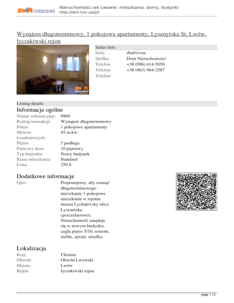 Nieruchomości we Lwowie: mieszkania, domy, budynki http://dim.lviv.ua/pl/ Wynajem długoterminowy, 1 pokojowe apartamenty, Lysenytska St, Lwów, łyczakiwski rejon Seller Info Imię: Spółka: Telefon: Telefon: Telefon: dimlvivua Dom Nieruchomości +38 (096) 614-5050 +38 (063) 964-2587 Listing details Informacje ogólne Numer referencyjny: Rodzaj transakcji: Pokoi: Metrów kwadratowych: Piętro: Piętrowy dom: Typ budynku: Klasa mieszkania: Cena: 0969 Wynajem długoterminowy 1 pokojowe apartamenty 45 m.kw. 5 podłoga 10 piętrowy Nowy budynek Standard 250 $ Dodatkowe informacje Opis: Proponujemy, aby usunąć długoterminowego mieszkanie 1-pokojowe mieszkanie w rejonie miasta Lychakivsky ulicy Lysynetska (pszczelarstwo). Nieruchomość znajduje się w nowym budynku, cegła piętro 5/10, remont, meble, sprzęt, stiralka. Lokalizacja Kraj: Obwód: Miasto: Rejon: Ukraina Obwód Lwowski Lwów łyczakiwski rejon page 1 / 2 Nieruchomości we Lwowie: mieszkania, domy, budynki http://dim.lviv.ua/pl/ Ulice: Lysenytska St page 2 / 2 Powered by TCPDF (www.tcpdf.org)