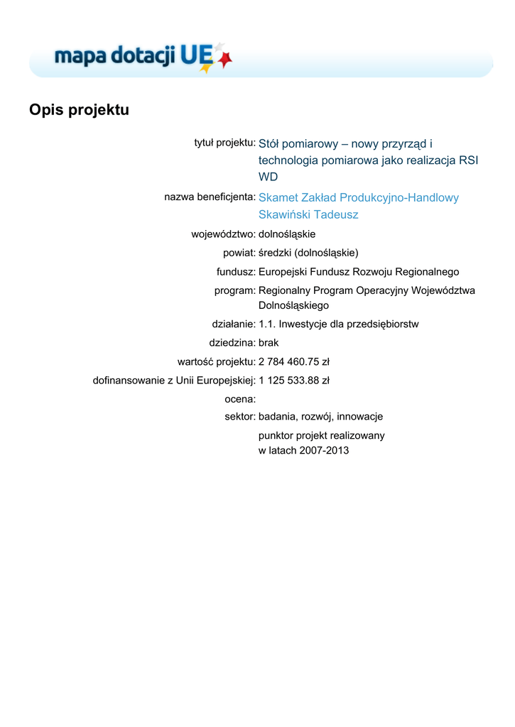 Opis projektu tytuł projektu: Stół pomiarowy – nowy przyrząd i technologia pomiarowa jako realizacja RSI WD nazwa beneficjenta: Skamet Zakład Produkcyjno-Handlowy Skawiński Tadeusz województwo: dolnośląskie powiat: średzki (dolnośląskie) fundusz: Europejski Fundusz Rozwoju Regionalnego program: Regionalny Program Operacyjny Województwa Dolnośląskiego działanie: 1.1. Inwestycje dla przedsiębiorstw dziedzina: brak wartość projektu: 2 784 460.75 zł dofinansowanie z Unii Europejskiej: 1 125 533.88 zł ocena: sektor: badania, rozwój, innowacje punktor projekt realizowany w latach 2007-2013