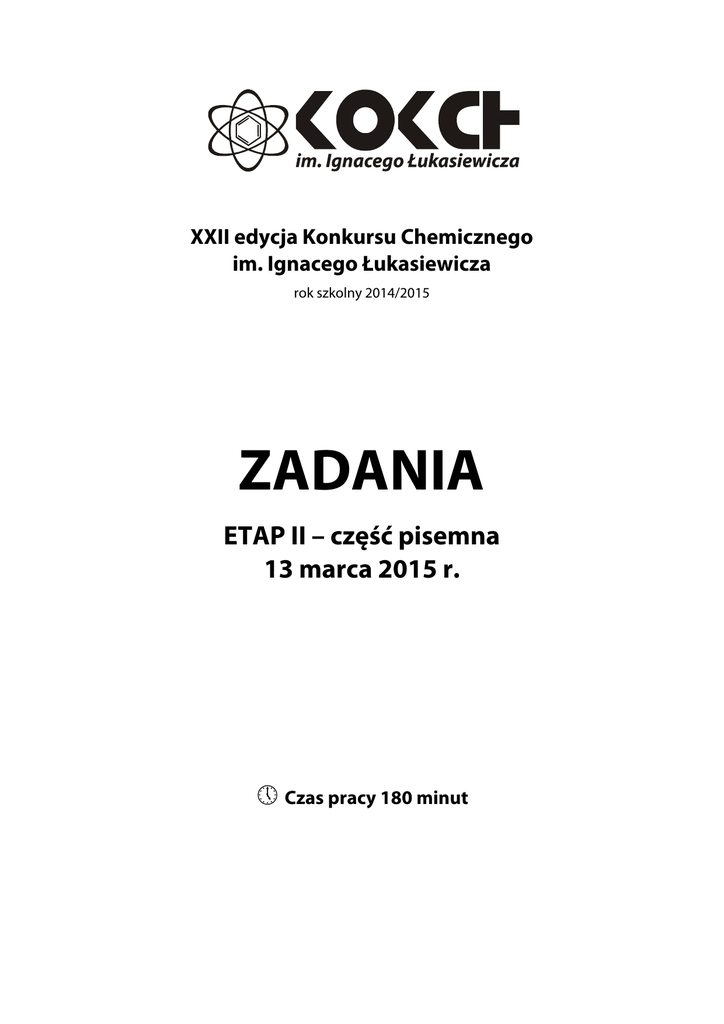 XXII edycja Konkursu Chemicznego im. Ignacego Łukasiewicza rok szkolny 2014/2015 ZADANIA ETAP II – część pisemna 13 marca 2015 r. Czas pracy 180 minut UCZESTNIKU ! Przed Tobą 3 zadania otwarte. Rozwiąż je stosując zasady matematyki i właściwe prawa chemiczne. Masy molowe pierwiastków i związków chemicznych wyrażaj w wartościach liczb całkowitych, tam gdzie nie jest wskazanie większej dokładności. Wyniki podaj z dokładnością do dwóch miejsc po przecinku, jeśli w treści zadania polecenie nie wskazuje inaczej. Wyeksponuj dyskusję jednostek i uwzględnij komentarz pisemny. Nie używaj korektora ani ołówka, błędne zapisy przekreśl. Każde zadanie winno znaleźć rozwiązanie na odpowiednich stronach w karcie odpowiedzi (obliczenia pomocnicze również). Strona 2 z 9 ZADANIE A Max. 20 pkt Skały są naturalnym zespołem minerałów powstałym w wyniku określonego procesu geologicznego. Mogą być one złożone z ziaren jednego minerału lub z wielu minerałów. Minerały wykorzystywane są do m.in. produkcji cementu albo farb, do wyrobu elementów ozdobnych, są też przedmiotem badań laboratoryjnych. 1. Do 29,125 g barytu (BaSO4) zawierającego 20% masowych domieszek rozpuszczalnych w kwasie, a nie zawierających związków baru dolano 200 g kwasu siarkowego(VI) o stężeniu 9,8% masowych. Otrzymano roztwór o gęstości 1,14 g/cm3. Oblicz stężenie jonów baru w roztworze. 2. a. Tryfilin – ortofosforan(V) dwóch metali rozpuszczono kwasem solnym w stosunku molowym 1 : 1. Do otrzymanego roztworu dodawano roztwór siarczku baru aż do całkowitego wytrącenia osadu. W odfiltrowanym osadzie zidentyfikowano 300,5 g fosforanu baru i 88g siarczku żelaza(II). W przesączu zidentyfikowano 1mol kationów, które barwiły płomień palnika na czerwono, ale nie strącały się w roztworze jonów węglanowych. Ustal wzór tryfilinu i oblicz jego masę cząsteczkową. 2. b. Badanie izotopowe kationów zidentyfikowanych w przesączu wykazały obecność 7% izotopu istotnego dla przemysłu nuklearnego. Jądra tego izotopu napromieniowane neutronami ulegają przemianie w tryt (bez produktów ubocznych). Napisz równanie opisanej przemiany. 3. Pisząc odpowiednie równania reakcji i dokonując właściwych obliczeń ustal masę strontianitu (SrCO3), konieczną do otrzymania nasyconego roztworu chromianu(VI) strontu, dla którego KSO = 5·10–6. 4. Próbkę malachitu – CuCO3 ·n Cu(OH)2 o masie 22,2 g rozpuszczono w kwasie siarkowym(VI). Wydzielający się gaz zajął objętość 2,477 dm3 w warunkach standardowych. Ustal liczbę cząsteczek Cu(OH)2 we wzorze malachitu. MCu=64 g/mol 5. Okruch skalny – dolomit – węglan wapniowo-magnezowy rozpuszczono w kwasie solnym, po czym dolano 0,5 dm3 roztworu ortofosforanu(V) sodu o stężeniu 0,08 mol/dm3. Wytrącony osad odsączono, przemyto i wysuszono. Masa osadu wyniosła 5,72 g. Ustal stosunek molowy wapnia do magnezu w dolomicie i zapisz wzór sumaryczny minerału (w obliczeniach pomiń rozpuszczalność soli nierozpuszczalnych). 6. Naturalna substancja promieniotwórcza może być miernikiem wieku skały, w której jest zawarta. Podczas przemian promieniotwórczych uranu emitowane są cząstki α, które przyłączają elektrony na skutek jonizacji ośrodka i tworzą atomy helu. 1 g uranu-238 produkuje rocznie 1,1·10–7 cm3 helu. Oblicz, ile przemian α towarzyszy przemianom uranu-238 aż do powstania ołowiu-206. Oblicz wiek skały, w której naukowcy znaleźli 49,5 cm3 helu. Strona 3 z 9 ZADANIE B 1. Max. 20 pkt Pierwszą syntetyczną metodą otrzymywani amoniaku dla przemysłu chemicznego, obecnie mającą już tylko historyczne znaczenie, jest metoda Serpeka. Polega ona na działaniu wody na azotek glinu wytwarzany w reakcji tlenku glinu z azotem w obecności węgla, gdzie produktem ubocznym jest czad. Oblicz objętość zużytego azotu w metodzie Serpeka do produkcji 2 m3 amoniaku, gdy wydajność pierwszego etapu procesu wynosi 70%, a wydajność drugiego etapu wynosi 90%. 2. Obecnie amoniak produkuje się w bezpośredniej syntezie pierwiastków. Reakcja przebiega z dostateczną szybkością dopiero w temperaturze powyżej 673 K i w obecności katalizatorów: Ru, U, Os. Ze względu na wysoką cenę tych katalizatorów, w technice stosuje się żelazo z dodatkiem tlenku glinu i wodorotlenku potasu. Katalizator ten działa jednak dopiero w temperaturze 773 K i wyższych. T [oC] 300 400 500 600 Rozpad termiczny amoniaku Rozpad w % obj p=1atm p=200atm p=1000atm 97,2 37,2 8,4 99,56 63,7 20,2 99,87 82,4 42,5 99,95 91,75 68.6 E. Józefowicz Chemia nieorganiczna PWN 1962 Wybierz z tabeli najlepsze parametry dla prowadzenia syntezy amoniaku z pierwiastków z użyciem katalizatora żelaznego i oblicz objętość azotu, jaką należy zmieszać z 3 m3 wodoru, aby otrzymać amoniak (wg wybranych parametrów). Stała równowagi reakcji w temperaturze najwłaściwszej dla użytego katalizatora wynosi 1,5. 3. Amoniak w laboratoriach stosuje się m.in. do sporządzania roztworów buforowych. d [g/cm3] 0,99 0,98 0,96 0,95 Gęstość roztworów amoniaku w T=15oC NH3 NH3 d NH3 3 [g/l] [%] [g/cm ] [g/l] 22,8 2,31 0,94 146,8 47,0 4,80 0,92 199,9 95,1 9,91 0,90 254,7 120,9 12,74 0,88 313,3 NH3 [%] 15,63 21,75 28,33 35,60 E. Józefowicz Chemia nieorganiczna PWN 1962 3. a. Do 500 cm3 wodnego roztworu amoniaku o gęstości 0,95 g/cm3 dolano 500 cm3 roztworu chlorku amonu. Sporządzony roztwór wykazuje pH=10. Oblicz masę chlorku amonu konieczną do przygotowania roztworu o odpowiednim stężeniu dla sporządzonego roztworu buforowego. KNH3 = 1,77∙10– 5 . 3. b. Oblicz zmianę pH powyższego roztworu buforowego po wprowadzeniu do niego 0,1 mola wodorotlenku sodu bez zmiany objętości roztworu. Strona 4 z 9 4. Amoniak w przemyśle stosuje się m.in. do produkcji kwasu azotowego. Podgrzaną mieszaninę amoniaku i powietrza przepuszcza się przez rozżarzoną siatkę platynową otrzymując tlenek azotu(IV). Przez silne oziębienie, t