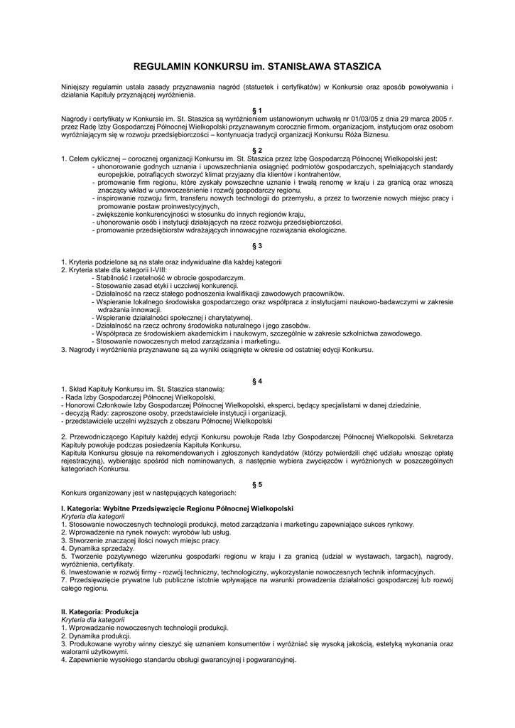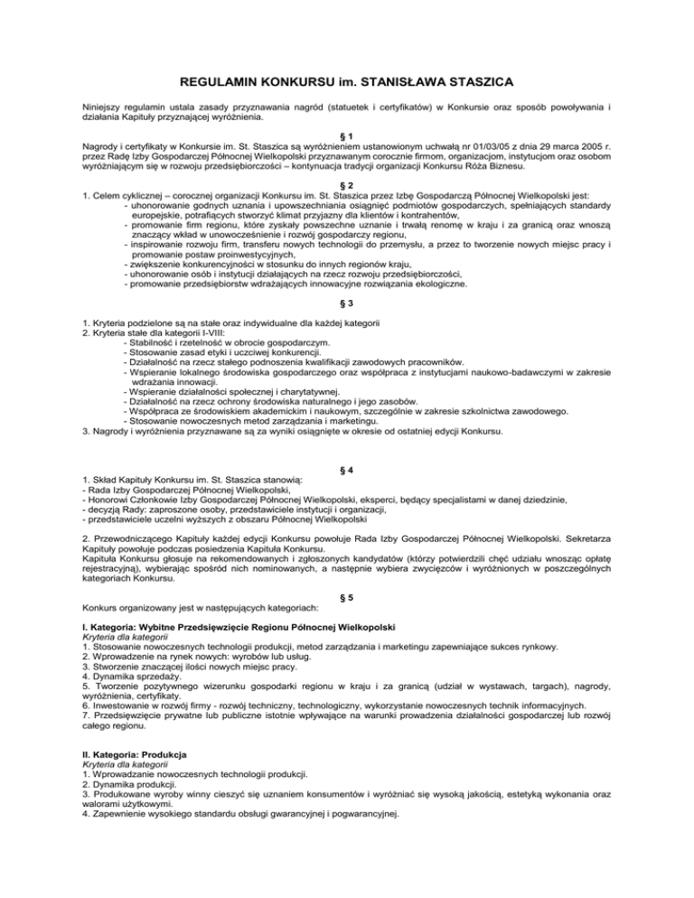 REGULAMIN KONKURSU im. STANISŁAWA STASZICA Niniejszy regulamin ustala zasady przyznawania nagród (statuetek i certyfikatów) w Konkursie oraz sposób powoływania i działania Kapituły przyznającej wyróżnienia. §1 Nagrody i certyfikaty w Konkursie im. St. Staszica są wyróżnieniem ustanowionym uchwałą nr 01/03/05 z dnia 29 marca 2005 r. przez Radę Izby Gospodarczej Północnej Wielkopolski przyznawanym corocznie firmom, organizacjom, instytucjom oraz osobom wyróżniającym się w rozwoju przedsiębiorczości – kontynuacja tradycji organizacji Konkursu Róża Biznesu. §2 1. Celem cyklicznej – corocznej organizacji Konkursu im. St. Staszica przez Izbę Gospodarczą Północnej Wielkopolski jest: - uhonorowanie godnych uznania i upowszechniania osiągnięć podmiotów gospodarczych, spełniających standardy europejskie, potrafiących stworzyć klimat przyjazny dla klientów i kontrahentów, - promowanie firm regionu, które zyskały powszechne uznanie i trwałą renomę w kraju i za granicą oraz wnoszą znaczący wkład w unowocześnienie i rozwój gospodarczy regionu, - inspirowanie rozwoju firm, transferu nowych technologii do przemysłu, a przez to tworzenie nowych miejsc pracy i promowanie postaw proinwestycyjnych, - zwiększenie konkurencyjności w stosunku do innych regionów kraju, - uhonorowanie osób i instytucji działających na rzecz rozwoju przedsiębiorczości, - promowanie przedsiębiorstw wdrażających innowacyjne rozwiązania ekologiczne. §3 1. Kryteria podzielone są na stałe oraz indywidualne dla każdej kategorii 2. Kryteria stałe dla kategorii I-VIII: - Stabilność i rzetelność w obrocie gospodarczym. - Stosowanie zasad etyki i uczciwej konkurencji. - Działalność na rzecz stałego podnoszenia kwalifikacji zawodowych pracowników. - Wspieranie lokalnego środowiska gospodarczego oraz współpraca z instytucjami naukowo-badawczymi w zakresie wdrażania innowacji. - Wspieranie działalności społecznej i charytatywnej. - Działalność na rzecz ochrony środowiska naturalnego i jego zasobów. - Współpraca ze środowiskiem akademickim i naukowym, szczególnie w zakresie szkolnictwa zawodowego. - Stosowanie nowoczesnych metod zarządzania i marketingu. 3. Nagrody i wyróżnienia przyznawane są za wyniki osiągnięte w okresie od ostatniej edycji Konkursu. §4 1. Skład Kapituły Konkursu im. St. Staszica stanowią: - Rada Izby Gospodarczej Północnej Wielkopolski, - Honorowi Członkowie Izby Gospodarczej Północnej Wielkopolski, eksperci, będący specjalistami w danej dziedzinie, - decyzją Rady: zaproszone osoby, przedstawiciele instytucji i organizacji, - przedstawiciele uczelni wyższych z obszaru Północnej Wielkopolski 2. Przewodniczącego Kapituły każdej edycji Konkursu powołuje Rada Izby Gospodarczej Północnej Wielkopolski. Sekretarza Kapituły powołuje podczas posiedzenia Kapituła Konkursu. Kapituła Konkursu głosuje na rekomendowanych i zgłoszonych kandydatów (którzy potwierdzili chęć udziału wnosząc opłatę rejestracyjną), wybierając spośród nich nominowanych, a następnie wybiera zwycięzców i wyróżnionych w poszczególnych kategoriach Konkursu. §5 Konkurs organizowany jest w następujących kategoriach: I. Kategoria: Wybitne Przedsięwzięcie Regionu Północnej Wielkopolski Kryteria dla kategorii 1. Stosowanie nowoczesnych technologii produkcji, metod zarządzania i marketingu zapewniające sukces rynkowy. 2. Wprowadzenie na rynek nowych: wyrobów lub usług. 3. Stworzenie znaczącej ilości nowych miejsc pracy. 4. Dynamika sprzedaży. 5. Tworzenie pozytywnego wizerunku gospodarki regionu w kraju i za granicą (udział w wystawach, targach), nagrody, wyróżnienia, certyfikaty. 6. Inwestowanie w rozwój firmy - rozwój techniczny, technologiczny, wykorzystanie nowoczesnych technik informacyjnych. 7. Przedsięwzięcie prywatne lub publiczne istotnie wpływające na warunki prowadzenia działalności gospodarczej lub rozwój całego regionu. II. Kategoria: Produkcja Kryteria dla kategorii 1. Wprowadzanie nowoczesnych technologii produkcji. 2. Dynamika produkcji. 3. Produkowane wyroby winny cieszyć się uznaniem konsumentów i wyróżniać się wysoką jakością, estetyką wykonania oraz walorami użytkowymi. 4. Zapewnienie wysokiego standardu obsługi gwarancyjnej i pogwarancyjnej. III. Kategoria: Usługa Kryteria dla kategorii 1. Dynamika sprzedaży. 2. Rozszerzenie oferty oraz stworzenie nowych punktów usługowych. 3. Zapewnienie wysokiego standardu obsługi klientów. 4. Terminowość i rzetelność kupiecka. 5. Oferowane usługi winny cieszyć się uznaniem konsumentów i wyróżniać się wysoką jakością. 6. Zapewnienie wysokiego standardu obsługi gwarancyjnej i pogwarancyjnej przyjaznej dla klienta. VI. Kategoria: Handel Kryteria dla kategorii 1. Dynamika sprzedaży. 2. Rozszerzenie oferty asortymentowej towarów oraz sieci sprzedaży. 3. Eksport towarów i usług. 4. Zapewnienie wysokiego standardu obsługi klientów. 5. Terminowość i rzetelność kupiecka. 6. Zapewnienie wysokiego standardu obsługi gwarancyjnej i pogwarancyjnej przyjaznego dla klienta. VI. Kategoria: Dynamiczna firma Kryteria dla kategorii 1. Firma zatrudniająca mniej niż 20 pracowników. 2.Dynamika sprzedaży. 3. Rozszerzenie oferty asortymentowej towarów oraz sieci sprzedaży. 4. Eksport towarów i usług. 5. Zapewnienie wysokiego standardu obsługi klientów. 6. Terminowość i rzetelność kupiecka. 7. Zapewnienie wysokiego standardu obsługi gwarancyjnej i pogwarancyjnej przyjaznego dla klienta. VII. Kategoria: Odpowiedzialność społeczna i ochrona środowiska Kryteria dla kategorii 1. Wdrożony system zarządzania środowiskowego. 2. Jasno sformułowana, upowszechniona i przestrzegana Polityka Środowiskowa. 3. Brak w ostatnich 3 latach kar od organów kontrolnych takich jak WIOŚ. 4. Udokumentowana innymi certyfikatami i nagrodami aktywność na polu ochrony środowiska lub CSR. 5. Jasno sformułowana i prz