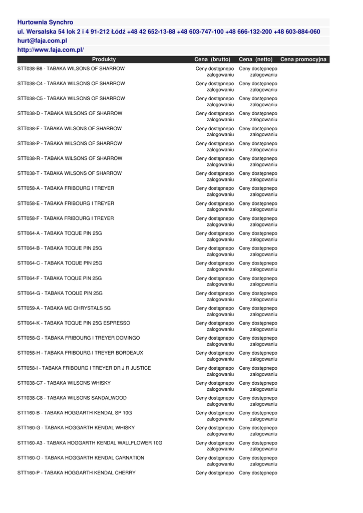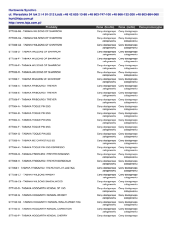 Hurtownia Synchro ul. Wersalska 54 lok 2 i 4 91-212 Łódź +48 42 652-13-88 +48 603-747-100 +48 666-132-200 +48 603-884-060 [email protected] http://www.faja.com.pl/ Cena (brutto) Cena (netto) STT038-B8 - TABAKA WILSONS OF SHARROW Produkty Ceny dostępnepo zalogowaniu Ceny dostępnepo zalogowaniu STT038-C4 - TABAKA WILSONS OF SHARROW Ceny dostępnepo zalogowaniu Ceny dostępnepo zalogowaniu STT038-C5 - TABAKA WILSONS OF SHARROW Ceny dostępnepo zalogowaniu Ceny dostępnepo zalogowaniu STT038-D - TABAKA WILSONS OF SHARROW Ceny dostępnepo zalogowaniu Ceny dostępnepo zalogowaniu STT038-F - TABAKA WILSONS OF SHARROW Ceny dostępnepo zalogowaniu Ceny dostępnepo zalogowaniu STT038-P - TABAKA WILSONS OF SHARROW Ceny dostępnepo zalogowaniu Ceny dostępnepo zalogowaniu STT038-R - TABAKA WILSONS OF SHARROW Ceny dostępnepo zalogowaniu Ceny dostępnepo zalogowaniu STT038-T - TABAKA WILSONS OF SHARROW Ceny dostępnepo zalogowaniu Ceny dostępnepo zalogowaniu STT058-A - TABAKA FRIBOURG I TREYER Ceny dostępnepo zalogowaniu Ceny dostępnepo zalogowaniu STT058-E - TABAKA FRIBOURG I TREYER Ceny dostępnepo zalogowaniu Ceny dostępnepo zalogowaniu STT058-F - TABAKA FRIBOURG I TREYER Ceny dostępnepo zalogowaniu Ceny dostępnepo zalogowaniu STT064-A - TABAKA TOQUE PIN 25G Ceny dostępnepo zalogowaniu Ceny dostępnepo zalogowaniu STT064-B - TABAKA TOQUE PIN 25G Ceny dostępnepo zalogowaniu Ceny dostępnepo zalogowaniu STT064-C - TABAKA TOQUE PIN 25G Ceny dostępnepo zalogowaniu Ceny dostępnepo zalogowaniu STT064-F - TABAKA TOQUE PIN 25G Ceny dostępnepo zalogowaniu Ceny dostępnepo zalogowaniu STT064-G - TABAKA TOQUE PIN 25G Ceny dostępnepo zalogowaniu Ceny dostępnepo zalogowaniu STT059-A - TABAKA MC CHRYSTALS 5G Ceny dostępnepo zalogowaniu Ceny dostępnepo zalogowaniu STT064-K - TABAKA TOQUE PIN 25G ESPRESSO Ceny dostępnepo zalogowaniu Ceny dostępnepo zalogowaniu STT058-G - TABAKA FRIBOURG I TREYER DOMINGO Ceny dostępnepo zalogowaniu Ceny dostępnepo zalogowaniu STT058-H - TABAKA FRIBOURG I TREYER BORDEAUX Ceny dostępnepo zalogowaniu Ceny dostępnepo zalogowaniu STT058-I - TABAKA FRIBOURG I TREYER DR J R JUSTICE Ceny dostępnepo zalogowaniu Ceny dostępnepo zalogowaniu STT038-C7 - TABAKA WILSONS WHISKY Ceny dostępnepo zalogowaniu Ceny dostępnepo zalogowaniu STT038-C8 - TABAKA WILSONS SANDALWOOD Ceny dostępnepo zalogowaniu Ceny dostępnepo zalogowaniu STT160-B - TABAKA HOGGARTH KENDAL SP 10G Ceny dostępnepo zalogowaniu Ceny dostępnepo zalogowaniu STT160-G - TABAKA HOGGARTH KENDAL WHISKY Ceny dostępnepo zalogowaniu Ceny dostępnepo zalogowaniu STT160-A3 - TABAKA HOGGARTH KENDAL WALLFLOWER 10G Ceny dostępnepo zalogowaniu Ceny dostępnepo zalogowaniu STT160-O - TABAKA HOGGARTH KENDAL CARNATION Ceny dostępnepo zalogowaniu Ceny dostępnepo zalogowaniu STT160-P - TABAKA HOGGARTH KENDAL CHERRY Ceny dostępnepo Ceny dostępnepo Cena promocyjna zalogowaniu zalogowaniu STT160-S - TABAKA HOGGARTH KENDAL IRISH D Ceny dostępnepo zalogowaniu Ceny dostępnepo zalogowaniu STT160-U - TABAKA HOGGARTH KENDAL JOCKEY CLUB Ceny dostępnepo zalogowaniu Ceny dostępnepo zalogowaniu STT160-V - TABAKA HOGGARTH KENDAL LAKELAND Ceny dostępnepo zalogowaniu Ceny dostępnepo zalogowaniu Ceny dostępnepo zalogowaniu STT160-X - TABAKA HOGGARTH KENDAL MITCHELLS SPECIAL Ceny dostępnepo zalogowaniu Ceny dostępnepo zalogowaniu Ceny dostępnepo zalogowaniu STT160-Z - TABAKA HOGGARTH KENDAL SANDALWOOD Ceny dostępnepo zalogowaniu Ceny dostępnepo zalogowaniu STT038-D5 - TABAKA WILSONS SUPER MENTHOL Ceny dostępnepo zalogowaniu Ceny dostępnepo zalogowaniu STT038-D6 - TABAKA WILSONS APRICOT-MENTHOL Ceny dostępnepo zalogowaniu Ceny dostępnepo zalogowaniu STT058-K - TABAKA FRIBOURG I TREYER BUREAU 25G Ceny dostępnepo zalogowaniu Ceny dostępnepo zalogowaniu STT058-M - TABAKA FRIBOURG I TREYER HIGH DRY TOAST 25G Ceny dostępnepo zalogowaniu Ceny dostępnepo zalogowaniu STT058-N - TABAKA FRIBOURG I TREYER MOROCCO 25G Ceny dostępnepo zalogowaniu Ceny dostępnepo zalogowaniu STT191-C - TABAKA MULLINS & WESTLEY JOCK`S CHOICE Ceny dostępnepo zalogowaniu Ceny dostępnepo zalogowaniu STT191-D - TABAKA MULLINS & WESTLEY PARTICULAR Ceny dostępnepo zalogowaniu Ceny dostępnepo zalogowaniu STT038-D8 - TABAKA WILSONS LEMON & LIME Ceny dostępnepo zalogowaniu Ceny dostępnepo zalogowaniu STT038-D9 - TABAKA WILSONS CLOVE Ceny dostępnepo zalogowaniu Ceny dostępnepo zalogowaniu STT038-E1 - TABAKA WILSONS CHOCOLATE Ceny dostępnepo zalogowaniu Ceny dostępnepo zalogowaniu