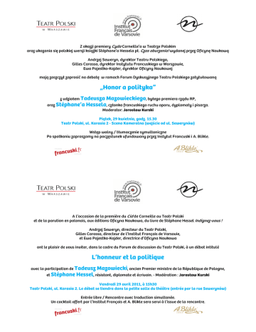Z okazji premiery Cyda Corneille’a w Teatrze Polskim oraz ukazania się polskiej wersji książki Stéphane’a Hessela pt. Czas oburzenia! wydanej przez Oficynę Naukową Andrzej Seweryn, dyrektor Teatru Polskiego, Gilles Carasso, dyrektor Instytutu Francuskiego w Warszawie, Ewa Pajestka-Kojder, dyrektor Oficyny Naukowej mają zaszczyt zaprosić na debatę w ramach Forum Dyskusyjnego Teatru Polskiego zatytułowaną „Honor a polityka” z udziałem Tadeusza Mazowieckiego, byłego premiera rządu RP, oraz Stéphane’a Hessela, członka francuskiego ruchu oporu, dyplomaty i pisarza. Moderator: Jarosław Kurski Piątek, 29 kwietnia, godz. 15.30 Teatr Polski, ul. Karasia 2 - Scena Kameralna (wejście od ul. Sewerynów) Wstęp wolny / tłumaczenie symultaniczne Po spotkaniu zapraszamy na poczęstunek ufundowany przez Instytut Francuski i A. Blikle. A l’occasion de la première du Cid de Corneille au Teatr Polski et de la parution en polonais, aux éditions Oficyna Naukowa, du livre de Stéphane Hessel Indignez-vous ! Andrzej Seweryn, directeur du Teatr Polski, Gilles Carasso, directeur de l’Institut Français de Varsovie, et Ewa Pajestka-Kojder, directrice d’Oficyna Naukowa ont le plaisir de vous inviter, dans le cadre du Forum de discussion du Teatr Polski, à un débat intitulé L’honneur et la politique avec la participation de Tadeusz Mazowiecki, ancien Premier ministre de la République de Pologne, et Stéphane Hessel, résistant, diplomate et écrivain. - Modération : Jarosław Kurski Vendredi 29 avril 2011, à 15h30 Teatr Polski, ul. Karasia 2. Le débat se tiendra dans la petite salle du théâtre (entrée par la rue Sewerynów) Entrée libre / Rencontre avec traduction simultanée. Un cocktail offert par l’Institut Français et A. Blikle sera servi à l’issue de la rencontre.