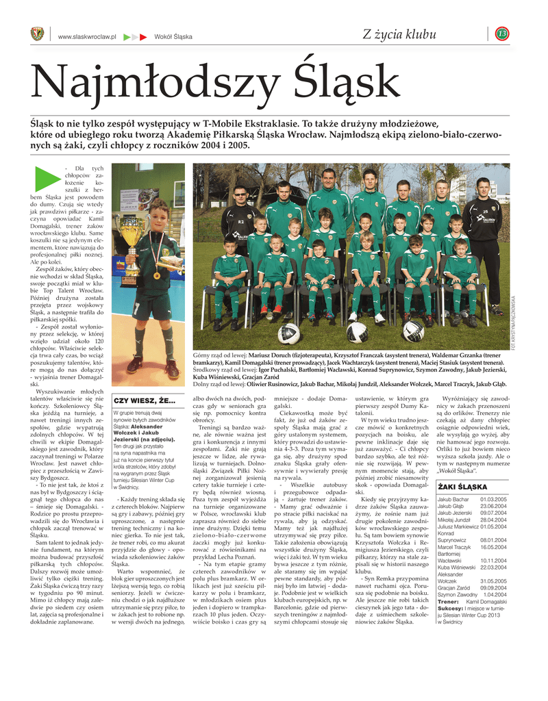 www.slaskwroclaw.pl Z życia klubu Wokół Śląska 13 Najmłodszy Śląsk Śląsk to nie tylko zespół występujący w T-Mobile Ekstraklasie. To także drużyny młodzieżowe, które od ubiegłego roku tworzą Akademię Piłkarską Śląska Wrocław. Najmłodszą ekipą zielono-biało-czerwonych są żaki, czyli chłopcy z roczników 2004 i 2005. FOT. KRYSTYNA PĄCZKOWSKA ► - Dla tych chłopców założenie koszulki z herbem Śląska jest powodem do dumy. Czują się wtedy jak prawdziwi piłkarze - zaczyna opowiadać Kamil Domagalski, trener żaków wrocławskiego klubu. Same koszulki nie są jedynym elementem, które nawiązują do profesjonalnej piłki nożnej. Ale po kolei. Zespół żaków, który obecnie wchodzi w skład Śląska, swoje początki miał w klubie Top Talent Wrocław. Później drużyna została przejęta przez wojskowy Śląsk, a następnie trafiła do piłkarskiej spółki. - Zespół został wyłoniony przez selekcję, w której wzięło udział około 120 chłopców. Właściwie selekcja trwa cały czas, bo wciąż poszukujemy talentów, które mogą do nas dołączyć - wyjaśnia trener Domagalski. Wyszukiwanie młodych talentów właściwie się nie kończy. Szkoleniowcy Śląska jeżdżą na turnieje, a nawet treningi innych zespołów, gdzie wypatrują zdolnych chłopców. W tej chwili w ekipie Domagalskiego jest zawodnik, który zaczynał treningi w Polarze Wrocław. Jest nawet chłopiec z przeszłością w Zawiszy Bydgoszcz. - To nie jest tak, że ktoś z nas był w Bydgoszczy i ściągnął tego chłopca do nas – śmieje się Domagalski. Rodzice po prostu przeprowadzili się do Wrocławia i chłopak zaczął trenować w Śląsku. Sam talent to jednak jedynie fundament, na którym można budować przyszłość piłkarską tych chłopców. Dalszy rozwój może umożliwić tylko ciężki trening. Żaki Śląska ćwiczą trzy razy w tygodniu po 90 minut. Mimo iż chłopcy mają zaledwie po siedem czy osiem lat, zajęcia są profesjonalne i dokładnie zaplanowane. Górny rząd od lewej: Mariusz Doruch (fizjoterapeuta), Krzysztof Franczak (asystent trenera), Waldemar Grzanka (trener bramkarzy), Kamil Domagalski (trener prowadzący), Jacek Wachtarczyk (asystent trenera), Maciej Stasiuk (asystent trenera). Środkowy rząd od lewej: Igor Puchalski, Bartłomiej Wacławski, Konrad Suprynowicz, Szymon Zawodny, Jakub Jezierski, Kuba Wiśniewski, Gracjan Zaród Dolny rząd od lewej: Oliwier Rusinowicz, Jakub Bachar, Mikołaj Jundził, Aleksander Wołczek, Marcel Traczyk, Jakub Głąb. CZY WIESZ, ŻE... W grupie trenują dwaj synowie byłych zawodników Śląska: Aleksander Wołczek i Jakub Jezierski (na zdjęciu). Ten drugi jak przystało na syna napastnika ma już na koncie pierwszy tytuł króla strzelców, który zdobył na wygranym przez Śląsk turnieju Silesian Winter Cup w Świdnicy. - Każdy trening składa się z czterech bloków. Najpierw są gry i zabawy, później gry uproszczone, a następnie trening techniczny i na koniec gierka. To nie jest tak, że trener robi, co mu akurat przyjdzie do głowy - opowiada szkoleniowiec żaków Śląska. Warto wspomnieć, że blok gier uproszczonych jest lżejszą wersją tego, co robią seniorzy. Jeżeli w ćwiczeniu chodzi o jak najdłuższe utrzymanie się przy piłce, to w żakach jest to robione np. w wersji dwóch na jednego, albo dwóch na dwóch, podczas gdy w seniorach gra się np. pomocnicy kontra obrońcy. Treningi są bardzo ważne, ale równie ważna jest gra i konkurencja z innymi zespołami. Żaki nie grają jeszcze w lidze, ale rywalizują w turniejach. Dolnośląski Związek Piłki Nożnej zorganizował jesienią cztery takie turnieje i cztery będą również wiosną. Poza tym zespół wyjeżdża na turnieje organizowane w Polsce, wrocławski klub zaprasza również do siebie inne drużyny. Dzięki temu z ie lo no - bi a ło - c z e r wo n e żaczki mogły już konkurować z rówieśnikami na przykład Lecha Poznań. - Na tym etapie gramy czterech zawodników w polu plus bramkarz. W orlikach jest już sześciu piłkarzy w polu i bramkarz, w młodzikach osiem plus jeden i dopiero w trampkarzach 10 plus jeden. Oczywiście boisko i czas gry są mniejsze - dodaje Domagalski. Ciekawostką może być fakt, że już od żaków zespoły Śląska mają grać z góry ustalonym systemem, który prowadzi do ustawienia 4-3-3. Poza tym wymaga się, aby drużyny spod znaku Śląska grały ofensywnie i wywierały presję na rywala. Wszelkie autobusy i przegubowce odpadają - żartuje trener żaków. - Mamy grać odważnie i po stracie piłki naciskać na rywala, aby ją odzyskać. Mamy też jak najdłużej utrzymywać się przy piłce. Takie założenia obowiązują wszystkie drużyny Śląska, więc i żaki też. W tym wieku bywa jeszcze z tym różnie, ale staramy się im wpajać pewne standardy, aby później było im łatwiej - dodaje. Podobnie jest w wielkich klubach europejskich, np. w Barcelonie, gdzie od pierwszych treningów z najmłodszymi chłopcami stosuje się ustawienie, w którym gra pierwszy zespół Dumy Katalonii. W tym wieku trudno jeszcze mówić o konkretnych pozycjach na boisku, ale pewne inklinacje daje się już zauważyć. - Ci chłopcy bardzo szybko, ale też różnie się rozwijają. W pewnym momencie stają, aby później zrobić niesamowity skok - opowiada Domagalski. Kiedy się przyjrzymy kadrze żaków Śląska zauważymy, że rośnie nam już drugie pokolenie zawodników wrocławskiego zespołu. Są tam bowiem synowie Krzysztofa Wołczka i Remigiusza Jezierskiego, czyli piłkarzy, którzy na stale zapisali się w historii naszego klubu. - Syn Remka przypomina nawet ruchami ojca. Porusza się podobnie na boisku. Ale jeszcze nie robi takich cieszynek jak jego tata - dodaje z uśmiechem szkoleniowiec żaków Śląska. Wyróżniający się zawodnicy w żakach przenoszeni są do orlików. Trenerzy nie czekają aż dany chłopiec osiągnie odpowiedni wiek, ale wysyłają go wyżej, aby nie h