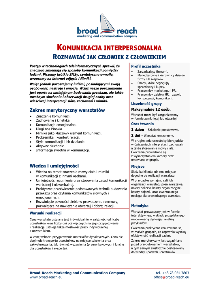 KOMUNIKACJA INTERPERSONALNA ROZMAWIAĆ JAK CZŁOWIEK Z CZŁOWIEKIEM Postęp w technologiach teleinformatycznych sprawił, że znacząco zmieniają się sposoby komunikacji pomiędzy ludźmi. Piszemy krótkie SMSy, syntetyczne e-maile, wrzucamy na internet zdjęcia i filmiki. Profil uczestnika Wciąż jednak pozostajemy ludźmi, posiadającymi swoją osobowość, nastroje i emocje. Wciąż nasze porozumienie jest oparte na umiejętnym budowaniu przekazu, ale także uważnym słuchaniu i obserwacji drugiej osoby oraz właściwej interpretacji słów, zachowań i mimiki. Zakres merytoryczny warsztatów Znaczenie komunikacji. Zachowanie i kinetyka. Komunikacja emocjonalna. Długi nos Pinokia. Mimika jako kluczowy element komunikacji. Proksemika i komfort relacji. Style komunikacji i ich działanie. Aktywne słuchanie. Informacja zwrotna w komunikacji. Zarządzający firmami. Menedżerowie i kierownicy działów firmy lub zespołów. Osoby, które negocjują – sprzedawcy i kupcy. Pracownicy marketingu i PR. Pracownicy działów HR, rozwoju kompetencji, komunikacji. Liczebność grupy Maksymalnie 12 osób. Warsztat może być zorganizowany w formie zamkniętej lub otwartej. Czas trwania 1 dzień – Szkolenie podstawowe. 2 dni – Warsztat rozszerzony. W drugim dniu uczestnicy biorą udział w ćwiczeniach interpretacji zachowań, a także stosowania mowy ciała. Ćwiczenia prowadzone są z wykorzystaniem kamery oraz omawiane w grupie. Wiedza i umiejętności Miejsce Siedziba klienta lub inne miejsce dogodne do realizacji warsztatu. Wiedza na temat znaczenia mowy ciała i mimiki w komunikacji z innymi osobami. Umiejętność rozumienia oraz stosowania zasad komunikacji werbalnej i niewerbalnej. Praktyczne przećwiczenie podstawowych technik budowania przekazu oraz czytania komunikatów słownych i emocjonalnych. Rozwinięcie pewności siebie w prowadzeniu rozmowy, pozwalające na nawiązanie otwartej i dobrej relacji. Warunki realizacji Cena warsztatu ustalana jest indywidualnie w zależności od liczby uczestników oraz liczby dni poświęconych na jego przygotowanie i realizację. Istnieje także możliwość pracy indywidualnej z uczestnikiem. W cenę wchodzi przygotowanie materiałów dydaktycznych. Cena nie obejmuje transportu uczestników na miejsce szkolenia oraz zakwaterowania, jak również wyżywienia (przerw kawowych i lunchu dla uczestników i eksperta). Broad-Reach Marketing and Communication Company www.broad-reach.eu W przypadku wynajmu sali lub organizacji warsztatu poza Warszawą należy doliczyć koszty organizacyjne, koszty dojazdu oraz ewentualnego noclegu dla prowadzącego warsztat. Metodyka Warsztat prowadzony jest w formie interaktywnego wykładu przeplatanego moderowaną dyskusją i analizą przykładów. Ćwiczenia praktyczne realizowane są w małych grupach, co zapewnia wysoką efektywność realizacji zadań. Zakres merytoryczny jest uzgadniany przed przygotowaniem warsztatów, a tym samym elastycznie dostosowany do wiedzy i potrzeb uczestników. tel. +48 78 054 7803 [email protected]