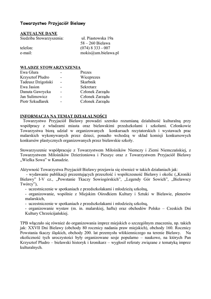 Towarzystwo Przyjaciół Bielawy AKTUALNE DANE