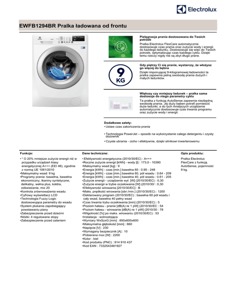 EWFB1294BR Pralka ładowana od frontu Pielęgnacja prania dostosowana do Twoich potrzeb Pralka Electrolux FlexCare automatycznie dostosowuje czas prania oraz zużycie wody i energii do każdego ładunku. Dostosowuje się więc do Twoich potrzeb, optymalizując czas każdego cyklu. Dzięki temu rzeczy nigdy nie są zbyt długo prane. Gdy piętrzy Ci się pranie, wystarczy, że włożysz go więcej do bębna Dzięki imponującej 9-kilogramowej ładowności ta pralka zapewnia pełną swobodę prania dużych i małych ładunków. Większy czy mniejszy ładunek – pralka sama dostosuje do niego parametry cyklu Ta pralka z funkcją AutoSense zapewnia niezbędną swobodę prania. Jej duży bęben potrafi pomieścić duże ładunki, a do tych mniejszych urządzenie automatycznie dostosowuje czas trwania programu oraz zużycie wody i energii. Dodatkowe zalety: • Ustaw czas zakończenia prania • Technologia PowerJet – sposób na wykorzystanie całego detergentu i czysty dozownik • Czyste ubrania - cicho i efektywnie, dzięki silnikowi inwerterowemu Funkcje: Dane techniczne: Opis produktu: • * O 20% mniejsze zużycie energii niż w przypadku urządzeń klasy energetycznej A+++ (EEI 46), zgodnie z normą UE 1061/2010 •Maksymalny wsad: 9 kg •Programy prania: bawełna, bawełna ekonomiczny, tkaniny syntetyczne, delikatny, wełna plus, kołdra, odświeżanie, mix 20 •Kontrola zrównoważenia wsadu •Cyfrowy wyświetlacz LCD •Technologia Fuzzy Logic dostosowująca parametry do wsadu •System płukania zapobiegający powstawaniu piany •Zabezpieczenie przed dziećmi •Nóżki: 4 regulowane stopy •Zabezpieczenie przed zalaniem • Efektywność energetyczna (2010/30/EC) : A+++ •Roczne zużycie energii [kWh] - wody [l] : 173,0 - 10390 •Maksymalny wsad [kg] : 9 •Energia [kWh] - czas [min.] bawełna 60 : 0.95 - 248 •Energia [kWh] - czas [min.] bawełna 60, pół wsadu : 0.64 - 209 •Energia [kWh] - czas [min.] bawełna 40, pół wsadu : 0.61 - 205 •Zużycie energii - urządzenie wył. [W] (2010/30/EC) : 0,30 •Zużycie energii w trybie oczekiwania [W] (2010/30/ : 0,30 •Efektywność wirowania [2010/30/EC] : B •Maks. prędkość wirowania [obr./min.] (2010/30/EC) : 1200 •Deklarowany program (2010/30/EC) : bawełna 60 pół wsadu i cały wsad, bawełna 40 pełny wsad •Czas trwania trybu oczekiwania [min] (2010/30/EC) : 5 •Poziom hałasu - pranie [dB(A) re 1 pW] (2010/30/EC : 54 •Poziom hałasu - wirowanie [dB(A) re 1 pW] (2010/30 : 78 •Wilgotność [%] po maks. wirowaniu (2010/30/EC) : 53 •Instalacja : wolnostojąca •Wymiary WxSzxG [mm] : 850x600x600 •Maksymalna głębokość [mm] : 660 •Napięcie [V] : 230 •Wymagany bezpiecznik [A] : 10 •Pobierana moc [W] : 2200 •Kolor : biel •Kod produktu (PNC) : 914 910 437 •Kod EAN : 7332543481927 Pralka Electrolux FlexCare z funkcją AutoSense, pojemność 9 kg.