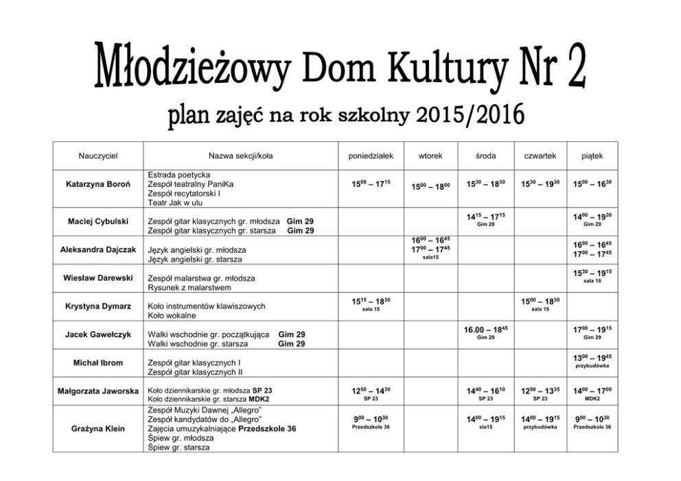 Nauczyciel Katarzyna Boroń Maciej Cybulski Aleksandra Dajczak Nazwa sekcji/koła Estrada poetycka Zespół teatralny PaniKa Zespół recytatorski I Teatr Jak w ulu Krystyna Dymarz Koło instrumentów klawiszowych Koło wokalne Jacek Gawełczyk Walki wschodnie gr. początkująca Walki wschodnie gr. starsza Grażyna Klein środa czwartek piątek 1500 – 1715 1500 – 1800 1530 – 1830 1530 – 1930 1500 – 1630 1415 – 1715 1400 – 1930 Gim 29 Gim 29 1600 – 1645 1700 – 1745 Język angielski gr. młodsza Język angielski gr. starsza Zespół malarstwa gr. młodsza Rysunek z malarstwem Małgorzata Jaworska wtorek Zespół gitar klasycznych gr. młodsza Gim 29 Zespół gitar klasycznych gr. starsza Gim 29 Wiesław Darewski Michał Ibrom poniedziałek 1600 – 1645 1700 – 1745 sala15 1530 – 1915 sala 18 1515 – 1830 1500 – 1830 sala 15 sala 15 Gim 29 Gim 29 16.00 – 1845 1700 – 1915 Gim 29 Gim 29 1300 – 1945 Zespół gitar klasycznych I Zespół gitar klasycznych II Koło dziennikarskie gr. młodsza SP 23 Koło dziennikarskie gr. starsza MDK2 Zespół Muzyki Dawnej „Allegro” Zespół kandydatów do „Allegro” Zajęcia umuzykalniające Przedszkole 36 Śpiew gr. młodsza Śpiew gr. starsza przybudówka 1250 – 1430 1440 – 1610 1250 – 1335 1400 – 1700 SP 23 SP 23 SP 23 MDK2 900 – 1030 1400 – 1915 1400 – 1915 900 – 1030 Przedszkole 36 sla15 przybudówka Przedszkole 36 Nauczyciel Nazwa sekcji/koła poniedziałek Grzegorz Kolenda Informatyka gr. młodsza ZSS 39 Informatyka gr. starsza ZSS 39 Zespół gitar klasycznych gr. początkująca SP 21 Zespół gitar klasycznych gr. zaawansowana Zespół gitar akustycznych Zespół gitar klasycznych gr. młodsza SP 21 Zespoły gry na instrumentach klawiszowych Zespół gitar klasycznych gr.średniozaawansowana 1150 – 1235 Andrzej Krośniak Adam Krzyż Mirosław Muzykant Wioletta Muzykant Lucyna Mykietyn Tadeusz Nowotarski Kamilla Pająk Maria Popławska Jolanta Skorupa Zespół perkusyjny gr. zaawansowana Zespół perkusyjny gr. początkująca Młodzieżowe zespoły rockowe Teatr Tańca ATRUM Zespoły baletowe dla przedszkolaków gr. I Zespoły baletowe dla przedszkolaków gr. II Zespoły baletowo-taneczne gr. starsza Zespoły baletowo-taneczne gr. młodsza Młodzieżowe zajęcia otwarte gr. młodsza Młodzieżowe zajęcia otwarte gr. starsza Dziecięcy Teatr Tańca Zespoły plastyczne gr. młodsza Zespoły plastyczne gr. starsza Rysunek gr, początkująca Malarstwo gr. początkująca Rysunek gr. średniozaawansowana Rysunek i malarstwo gr. początkująca Rysunek gr. zaawansowana Malarstwo gr. zaawansowana Chór dziewczęcy Gimn.21 Zespół wokalny Gimn.21 Teatr Prawdziwny Teatr Prawdziwny gr. „Nasz Dom” Małe formy teatralne Zespół recytatorski II Zespoły polonistyczne Konsultacje metodyczne wtorek środa czwartek Piątek 1435 – 1605 1400 – 1700 1515 – 1900 1515 – 1900 1515 – 1900 SP21 piwnica rysia sala 18 piwnica rysia 1400 – 1915 1400 – 1530 1500 – 1930 1400 – 1615 MDK2 SP21 MDK2 SP21 1600 – 1815 1445 – 2000 1600 – 2030 1730 – 1900 filia sala 15 perkusyjna 18 – 19 00 30 1600 – 1645 1645 – 1815 1700 – 1800 1600 – 1700 filia 18 – 2030 1600 – 1645 15 1700 – 1800 1600 – 1700 1815 – 1900 1900 – 2030 1645 – 1815 1400 – 1700 przybudówka 1530 – 1830 1845 – 2100 1445 – 1700 przybudówka 1530 – 1830 SP42 SP42 1700 – 2045 1700 – 2045 1700 – 2045 1830 – 2045 przybudówka przybudówka przybudówka przybudówka 1600 – 1815 1600 – 1815 Gim 21 10 – 11 00 Gim 21 30 Nasz dom 1500 – 1930 piwnica rysia 1600 – 1815 sala 12 CZAS PRACY MŁODZIEŻOWEGO DOMU KULTURY NR 2 PONIEDZIAŁEK – PIĄTEK 8.00 – 21.00 1600 – 1815 sala 12