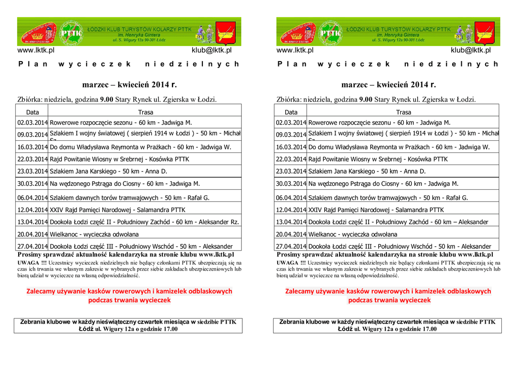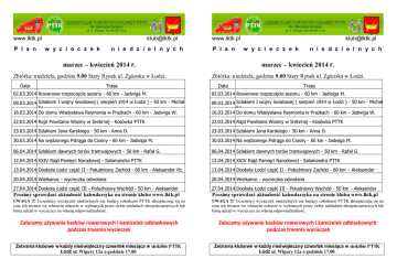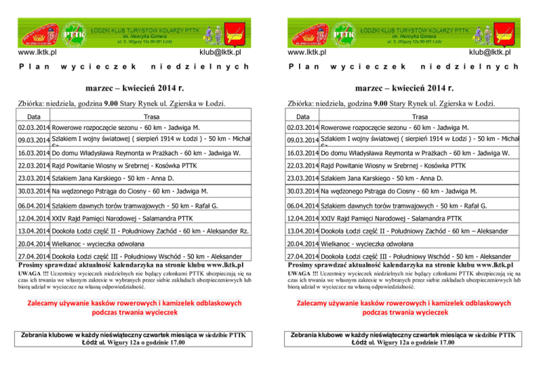 www.lktk.pl P l a n [email protected] w y c i e c z e k n i e d z i e l n y c h www.lktk.pl P l a n marzec – kwiecień 2014 r. Zbiórka: niedziela, godzina 9.00 Stary Rynek ul. Zgierska w Łodzi. Data Trasa [email protected] w y c i e c z e k n i e d z i e l n y c h marzec – kwiecień 2014 r. Zbiórka: niedziela, godzina 9.00 Stary Rynek ul. Zgierska w Łodzi. Data Trasa 02.03.2014 Rowerowe rozpoczęcie sezonu - 60 km - Jadwiga M. 02.03.2014 Rowerowe rozpoczęcie sezonu - 60 km - Jadwiga M. 09.03.2014 Szlakiem I wojny światowej ( sierpień 1914 w Łodzi ) - 50 km - Michał Sz. 16.03.2014 Do domu Władysława Reymonta w Prażkach - 60 km - Jadwiga W. 09.03.2014 Szlakiem I wojny światowej ( sierpień 1914 w Łodzi ) - 50 km - Michał Sz. 16.03.2014 Do domu Władysława Reymonta w Prażkach - 60 km - Jadwiga W. 22.03.2014 Rajd Powitanie Wiosny w Srebrnej - Kosówka PTTK 22.03.2014 Rajd Powitanie Wiosny w Srebrnej - Kosówka PTTK 23.03.2014 Szlakiem Jana Karskiego - 50 km - Anna D. 23.03.2014 Szlakiem Jana Karskiego - 50 km - Anna D. 30.03.2014 Na wędzonego Pstrąga do Ciosny - 60 km - Jadwiga M. 30.03.2014 Na wędzonego Pstrąga do Ciosny - 60 km - Jadwiga M. 06.04.2014 Szlakiem dawnych torów tramwajowych - 50 km - Rafał G. 06.04.2014 Szlakiem dawnych torów tramwajowych - 50 km - Rafał G. 12.04.2014 XXIV Rajd Pamięci Narodowej - Salamandra PTTK 12.04.2014 XXIV Rajd Pamięci Narodowej - Salamandra PTTK 13.04.2014 Dookoła Łodzi część II - Południowy Zachód - 60 km - Aleksander Rz. 13.04.2014 Dookoła Łodzi część II - Południowy Zachód - 60 km – Aleksander 20.04.2014 Wielkanoc - wycieczka odwołana Rz. odwołana 20.04.2014 Rz…………………… Wielkanoc - wycieczka 27.04.2014 Dookoła Łodzi część III - Południowy Wschód - 50 km - Aleksander 27.04.2014 Dookoła Łodzi część III - Południowy Wschód - 50 km - Aleksander Prosimy sprawdzać aktualność kalendarzyka na stronie klubu www.lktk.pl Rz. Prosimy sprawdzać aktualność kalendarzyka na stronie klubu www.lktk.pl Rz. Zalecamy używanie kasków rowerowych i kamizelek odblaskowych podczas trwania wycieczek Zalecamy używanie kasków rowerowych i kamizelek odblaskowych podczas trwania wycieczek Zebrania klubowe w każdy nieświąteczny czwartek miesiąca w siedzibie PTTK Łódź ul. Wigury 12a o godzinie 17.00 Zebrania klubowe w każdy nieświąteczny czwartek miesiąca w siedzibie PTTK Łódź ul. Wigury 12a o godzinie 17.00 UWAGA !!! Uczestnicy wycieczek niedzielnych nie będący członkami PTTK ubezpieczają się na czas ich trwania we własnym zakresie w wybranych przez siebie zakładach ubezpieczeniowych lub biorą udział w wycieczce na własną odpowiedzialność. UWAGA !!! Uczestnicy wycieczek niedzielnych nie będący członkami PTTK ubezpieczają się na czas ich trwania we własnym zakresie w wybranych przez siebie zakładach ubezpieczeniowych lub biorą udział w wycieczce na własną odpowiedzialność.