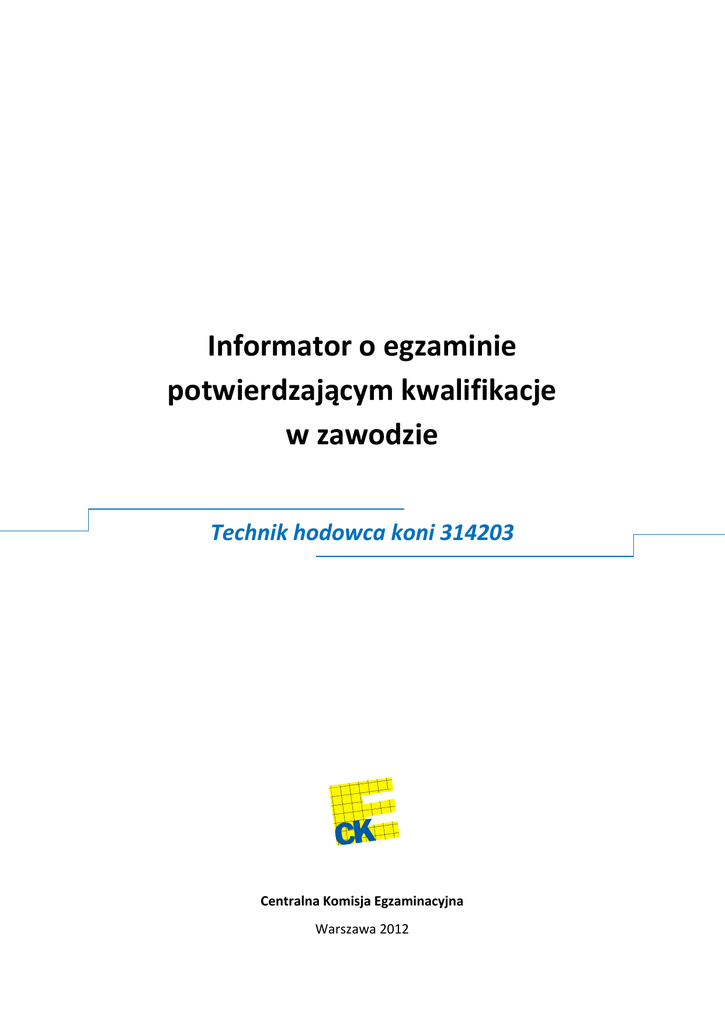 Informator o egzaminie potwierdzającym kwalifikacje w zawodzie Technik hodowca koni 314203 Centralna Komisja Egzaminacyjna Warszawa 2012 Informator opracowała Centralna Komisja Egzaminacyjna w Warszawie. Materiały do informatora opracowano w ramach Projektu VI Modernizacja egzaminów potwierdzających kwalifikacje zawodowe, Działanie 3.2. Rozwój systemu egzaminów zewnętrznych, Priorytet III Wysoka jakość systemu oświaty, Program Operacyjny Kapitał Ludzki. Spis treści SPIS TREŚCI MODUŁ 1. INFORMACJE WPROWADZAJĄCE ........................................... Moduł 1 1. Informacje ogólne o egzaminie zawodowym ................................................................... 1 2. Wymagania, które należy spełnić, aby przystąpić do egzaminu zawodowego ............... 2 3. Struktura egzaminu zawodowego .................................................................................... 5 3.1. Część pisemna egzaminu ....................................................................................................... 5 3.2. Część praktyczna egzaminu ................................................................................................... 11 3.3. Podstawa uznania egzaminu za zdany................................................................................... 11 4. Postępowanie po egzaminie.............................................................................................12 MODUŁ 2. INFORMACJE O ZAWODZIE ................................................... Moduł 2 1. Zadania zawodowe ........................................................................................................... 1 2. Wyodrębnienie kwalifikacji w zawodzie........................................................................... 1 3. Możliwości kształcenia w zawodzie .................................................................................. 1 MODUŁ 3. WYMAGANIA EGZAMINACYJNE Z PRZYKŁADAMI ZADAŃ ..... Moduł 3 Kwalifikacja 1. – R.19. Organizacja chowu i hodowli koni 1. Przykłady zadań do części pisemnej egzaminu ......................................................................... 1 2. Przykład zadania do części praktycznej egzaminu oraz kryteria oceniania .............................. 3 Kwalifikacja 2. – R.20. Szkolenie i użytkowanie koni 1. Przykłady zadań do części pisemnej egzaminu ......................................................................... 19 2. Przykład zadania do części praktycznej egzaminu oraz kryteria oceniania .............................. 24 ZAŁĄCZNIKI ............................................................................................ Załączniki SŁOWNIK POJĘĆ....................................................................................... Słownik Moduł 1. Informacje wprowadzające MODUŁ 1. INFORMACJE WPROWADZAJĄCE 1. Informacje ogólne o egzaminie zawodowym Czym jest egzamin zawodowy? Od 1 września 2012 r. weszły w życie przepisy wprowadzające zmiany w szkolnictwie zawodowym. W zawodach przedstawionych w nowej klasyfikacji wyodrębniono kwalifikacje. Przez kwalifikację w zawodzie należy rozumieć wyodrębniony w danym zawodzie zestaw oczekiwanych efektów kształcenia, których osiągnięcie potwierdza świadectwo wydane przez okręgową komisję egzaminacyjną, po zdaniu egzaminu potwierdzającego kwalifikacje w zawodzie w zakresie jednej kwalifikacji. Egzamin potwierdzający kwalifikacje w zawodzie, zwany również egzaminem zawodowym, jest formą oceny poziomu opanowania przez zdającego wiedzy i umiejętności z zakresu danej kwalifikacji wyodrębnionej w zawodzie, ustalonych w podstawie programowej kształcenia w zawodach. Egzamin zawodowy jest egzaminem zewnętrznym. Umożliwia uzyskanie porównywalnej i obiektywnej oceny poziomu osiągnięć zdającego poprzez zastosowanie jednolitych wymagań, kryteriów oceniania i zasad przeprowadzania egzaminu, opracowanych przez instytucje zewnętrzne, funkcjonujące niezależnie od systemu kształcenia. Rolę instytucji zewnętrznych pełnią: Centralna Komisja Egzaminacyjna i osiem okręgowych komisji egzaminacyjnych powołanych przez Ministra Edukacji Narodowej w 1999 roku. Na terenie swojej działalności okręgowe komisje egzaminacyjne przygotowują, organizują i przeprowadzają zewnętrzne egzaminy zawodowe. Egzaminy oceniać będą zewnętrzni egzaminatorzy. Egzamin zawodowy może być przeprowadzany w ciągu całego roku szkolnego w terminie ustalonym przez dyrektora komisji okręgowej, w uzgodnieniu z dyrektorem Komisji Centralnej. Termin egzaminu zawodowego dyrektor komisji okręgowej ogłasza na stronie internetowej komisji okręgowej nie później niż na 5 miesięcy przed terminem egzaminu zawodowego. Egzamin będzie obejmował zakresem tematycznym kwalifikację, czyli liczba egzaminów w danym zawodzie będzie zależna od liczby kwalifikacji wyodrębnionych w podstawie programowej kształcenia w zawodach. W praktyce będzie to jeden, dwa lub trzy egzaminy w danym zawodzie. Moduł 1 Strona 1 Moduł 1. Informacje wprowadzające Dla kogo przeprowadzany jest egzamin zawodowy? Egzamin zawodowy jest przeprowadzany dla: uczniów zasadniczych szkół zawodowych i techników oraz uczniów (słuchaczy) szkół policealnych, absolwentów zasadniczych szkół zawodowych, techników i szkół policealnych, osób, które ukończyły kwalifikacyjny kurs zawodowy, osób spełniających warunki określone w przepisach w sprawie egzaminów eksternistycznych. 2. Wymagania, które należy spełnić, aby przystąpić do egzaminu zawodowego Zmiany w formule egzaminu zawodowego i w sposobie jego przeprowadzania zostały ujęte w rozporządzeniu Ministra Edukacji Narodowej z dnia 24 lutego 2012 r. zmieniającym rozporządzenie w sprawie warunków i sposobu oceniania, klasyfikowania i promowania uczniów i słuchaczy oraz przeprowadzania sprawdzianów i egzaminów w szkołach publicznych. Jeśli jesteś uczniem lub słuchaczem, który