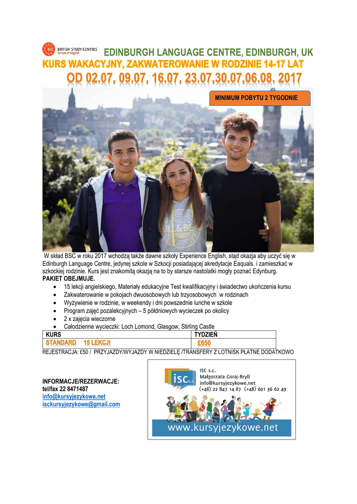 EDINBURGH LANGUAGE CENTRE, EDINBURGH, UK MINIMUM POBYTU 2 TYGODNIE W skład BSC w roku 2017 wchodzą także dawne szkoły Experience English, stąd okazja aby uczyć się w Edinburgh Language Centre, jedynej szkole w Szkocji posiadającej akredytacje Eaquals. i zamieszkać w szkockiej rodzinie. Kurs jest znakomitą okazją na to by starsze nastolatki mogły poznać Edynburg. PAKIET OBEJMUJE. 15 lekcji angielskiego, Materiały edukacyjne Test kwalifikacyjny i świadectwo ukończenia kursu Zakwaterowanie w pokojach dwuosobowych lub trzyosobowych w rodzinach Wyżywienie w rodzinie, w weekendy i dni powszednie lunche w szkole Program zajęć pozalekcyjnych – 5 półdniowych wycieczek po okolicy 2 x zajęcia wieczorne Całodzienne wycieczki: Loch Lomond, Glasgow, Stirling Castle KURS TYDZIEŃ REJESTRACJA: £50 / PRZYJAZDY/WYJAZDY W NIEDZIELĘ /TRANSFERY Z LOTNISK PŁATNE DODATKOWO INFORMACJE/REZERWACJE: tel/fax 22 8471487 [email protected] [email protected]