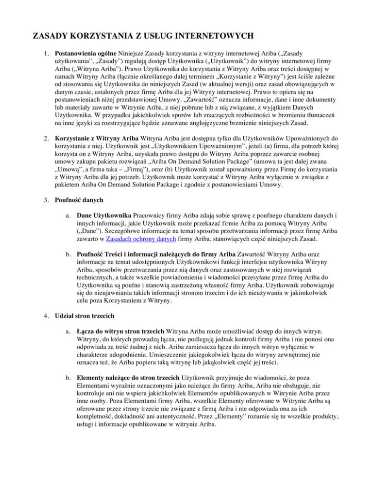 ZASADY KORZYSTANIA Z USŁUG INTERNETOWYCH 1. Postanowienia ogólne Niniejsze Zasady korzystania z witryny internetowej Ariba („Zasady użytkowania”, „Zasady”) regulują dostęp Użytkownika („Użytkownik”) do witryny internetowej firmy Ariba („Witryna Ariba”). Prawo Użytkownika do korzystania z Witryny Ariba oraz treści dostępnej w ramach Witryny Ariba (łącznie określanego dalej terminem „Korzystanie z Witryny”) jest ściśle zależne od stosowania się Użytkownika do niniejszych Zasad (w aktualnej wersji) oraz zasad obowiązujących w danym czasie, ustalonych przez firmę Ariba dla jej Witryny internetowej. Prawo to opiera się na postanowieniach niżej przedstawionej Umowy. „Zawartość” oznacza informacje, dane i inne dokumenty lub materiały zawarte w Witrynie Ariba, z niej pobrane lub z nią związane, z wyjątkiem Danych Użytkownika. W przypadku jakichkolwiek sporów lub znaczących rozbieżności w brzmieniu tłumaczeń na inne języki za rozstrzygające będzie uznawane anglojęzyczne brzmienie niniejszych Zasad. 2. Korzystanie z Witryny Ariba Witryna Ariba jest dostępna tylko dla Użytkowników Upoważnionych do korzystania z niej. Użytkownik jest „Użytkownikiem Upoważnionym”, jeżeli (a) firma, dla potrzeb której korzysta on z Witryny Ariba, uzyskała prawo dostępu do Witryny Ariba poprzez zawarcie osobnej umowy zakupu pakietu rozwiązań „Ariba On Demand Solution Package” (umowa ta jest dalej zwana „Umową”, a firma taka – „Firmą”), oraz (b) Użytkownik został upoważniony przez Firmę do korzystania z Witryny Ariba dla jej potrzeb. Użytkownik może korzystać z Witryny Ariba wyłącznie w związku z pakietem Ariba On Demand Solution Package i zgodnie z postanowieniami Umowy. 3. Poufność danych a. Dane Użytkownika Pracownicy firmy Ariba zdają sobie sprawę z poufnego charakteru danych i innych informacji, jakie Użytkownik może przekazać firmie Ariba za pomocą Witryny Ariba („Dane”). Szczegółowe informacje na temat sposobu przetwarzania informacji przez firmę Ariba zawarto w Zasadach ochrony danych firmy Ariba, stanowiących część niniejszych Zasad. b. Poufność Treści i informacji należących do firmy Ariba Zawartość Witryny Ariba oraz informacje na temat udostępnionych Użytkownikowi funkcji interfejsu użytkownika Witryny Ariba, sposobów przetwarzania przez nią danych oraz zastosowanych w niej rozwiązań technicznych, a także wszelkie powiadomienia i wiadomości przesyłane przez firmę Ariba do Użytkownika są poufne i stanowią zastrzeżoną własność firmy Ariba. Użytkownik zobowiązuje się do nieujawniania takich informacji stronom trzecim i do ich nieużywania w jakimkolwiek celu poza Korzystaniem z Witryny. 4. Udział stron trzecich a. Łącza do witryn stron trzecich Witryna Ariba może umożliwiać dostęp do innych witryn. Witryny, do których prowadzą łącza, nie podlegają jednak kontroli firmy Ariba i nie ponosi ona odpowiada za treść żadnej z nich. Ariba zamieszcza łącza do innych witryn wyłącznie w charakterze udogodnienia. Umieszczenie jakiegokolwiek łącza do witryny zewnętrznej nie oznacza też, że Ariba popiera taką witrynę lub jakąkolwiek część jej treści. b. Elementy należące do stron trzecich Użytkownik przyjmuje do wiadomości, że poza Elementami wyraźnie oznaczonymi jako należące do firmy Ariba, Ariba nie obsługuje, nie kontroluje ani nie wspiera jakichkolwiek Elementów opublikowanych w Witrynie Ariba przez inne osoby. Poza Elementami firmy Ariba, wszelkie Elementy oferowane w Witrynie Ariba są oferowane przez strony trzecie nie związane z firmą Ariba i nie odpowiada ona za ich kompletność, dokładność ani autentyczność. Przez „Elementy” rozumie się tu wszelkie produkty, usługi i informacje opublikowane w witrynie Ariba. 5. Ograniczenia dotyczące korzystania z Witryny Użytkownik zobowiązuje się, w ramach Korzystania z Witryny, że nie będzie świadomie: (i) ingerować ani próbować ingerować w prawidłowe działanie Witryny Ariba; (ii) publikować lub przesyłać do Witryny Ariba jakichkolwiek informacji niezgodnych z prawem, fałszywych, obraźliwych, agresywnych ani obscenicznych; (iii) publikować ani przesyłać do witryny Ariba czegokolwiek, co zawiera wirusy, błędy, złośliwe oprogramowanie czyszczące, robaki, konie trojańskie lub inne szkodliwe elementy; ani (iv) publikować, uruchamiać, dystrybuować, kopiować ani odtwarzać kodu źródłowego Witryny Ariba, ani też tworzyć dzieł od niej pochodnych. Użytkownik przyjmuje też do wiadomości, że z wyjątkiem przypadków jednoznacznie określonych w Umowie, firma Ariba nie może zagwarantować i nie gwarantuje, że jakiegokolwiek rodzaju pliki lub oprogramowanie udostępnione w Witrynie Ariba w celu pobrania przez Użytkownika nie zawierają infekcji, wirusów, robaków, koni trojańskich ani innego kodu lub wad o właściwościach niszczących lub naruszających spójność danych. 6. Zobowiązania po stronie Użytkownika dotyczące Nazw, Haseł i Danych Użytkownik jest jedyną stroną odpowiedzialną za: a. Zachowanie poufności swojej nazwy użytkownika i hasła Użytkownik niezwłocznie powiadomi firmę Ariba w przypadku, gdy dowie się o jakichkolwiek nieautoryzowanych próbach użycia nadanej mu nazwy użytkownika lub hasła. Wszelkie polecenia, wiadomości i inne informacje („Przekazy”), jakie firma Ariba otrzyma od kogokolwiek posługującego się nazwą użytkownika i hasłem Użytkownika, będzie ona traktować jako wysłane do niej przez Użytkownika. b. Przestrzeganie wszelkich obowiązujących zasad ochrony danych osobowych, praw konsumenckich i wszelkich innych praw i przepisów regulujących korzystanie przez Użytkownika z Witryny Ariba. c. Publikowanie w Witrynie Ariba tylko takich Danych, które Użytkownik ma prawo odtwarzać, powielać i ujawniać firmie Ariba Użytkownik zapewni firmie Ariba ochronę prawną i finansową