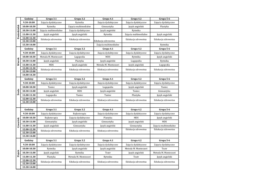 Poniedziałek Godziny Grupa 3.1 Grupa 3.2 Grupa 4.1 Grupa 4.2 Grupa 5-6 9.30-10.00 Zajęcia dydaktyczne Rytmika Zajęcia dydaktyczne Zajęcia dydaktyczne Zajęcia dydaktyczne 10.00-10.30 Rytmika Zajęcia multimedialne Gimnastyka Język angielski Plastyka 10.30-11.00 Zajęcia multimedialne Zajęcia dydaktyczne Język angielski Rytmika 11.00-11.30 Język angielski Język angielski Rytmika Zajęcia multimedialne Język angielski 12.00-12.30 12.30-13.00 Edukacja zdrowotna Edukacja zdrowotna Edukacja zdrowotna Edukacja zdrowotna Grupa 3.1 Grupa 3.2 Grupa 4.1 Grupa 4.2 Grupa 5-6 13.30-14.00 Wtorek Godziny Edukacja zdrowotna Zajęcia multimedialne Rytmika 9.30-10.00 Zajęcia dydaktyczne Zajęcia dydaktyczne Zajęcia dydaktyczne Zajęcia dydaktyczne Zajęcia dydaktyczne 10.00-10.30 Metoda M. Montessori Logopedia MDS Rytmika Język angielski 10.30-11.00 Język angielski Plastyka Język angielski Logopedia Rytmika 11.00-11.30 12.00-12.30 12.30-13.00 MDS Język angielski Metoda M. Montessori Język angielski Logopedia Edukacja zdrowotna Edukacja zdrowotna Edukacja zdrowotna Edukacja zdrowotna Edukacja zdrowotna Czwartek Środa 14.00-14.30 Godziny Grupa 3.1 Grupa 3.2 Grupa 4.1 Grupa 4.2 Grupa 5-6 9.30-10.00 Zajęcia dydaktyczne Zajęcia dydaktyczne Zajęcia dydaktyczne Zajęcia dydaktyczne Zajęcia dydaktyczne 10.00-10.30 Taniec Język angielski Logopedia Język angielski Taniec 10.30-11.00 Język angielski MDS Język angielski Taniec Gimnastyka 11.00-11.30 Logopedia Taniec Taniec Plastyka Język angielski 12.00-12.30 12.30-13.00 Edukacja zdrowotna Edukacja zdrowotna Edukacja zdrowotna Edukacja zdrowotna Edukacja zdrowotna Godziny Grupa 3.1 Grupa 3.2 Grupa 4.1 Grupa 4.2 Grupa 5-6 9.30-10.00 Zajęcia dydaktyczne Bajkoterapia Zajęcia dydaktyczne Zajęcia dydaktyczne Zajęcia dydaktyczne 10.00-10.30 Bajkoterapia Zajęcia dydaktyczne Plastyka MDS Język angielski 10.30-11.00 Gimnastyka Język angielski Gimnastyka Język angielski MDS 11.00-11.30 Język angielski Gimnastyka Język angielski Gimnastyka Zajęcia multimedialne 12.00-12.30 12.30-13.00 Edukacja zdrowotna Edukacja zdrowotna Edukacja zdrowotna Edukacja zdrowotna Edukacja zdrowotna Godziny Grupa 3.1 Grupa 3.2 Grupa 4.1 Grupa 4.2 Grupa 5-6 Zajęcia dydaktyczne Piątek 13.30-14.00 9.30-10.00 Zajęcia dydaktyczne Zajęcia dydaktyczne Zajęcia dydaktyczne Zajęcia dydaktyczne 10.00-10.30 Rytmika Język angielski Język angielski Metoda M. Montessori Teatr 10.30-11.00 Język angielski Rytmika Teatr Język angielski Metoda M. Montessori 11.00-11.30 Plastyka Metoda M. Montessori Rytmika Teatr Język angielski 12.00-12.30 12.30-13.00 Edukacja zdrowotna Edukacja zdrowotna Edukacja zdrowotna Edukacja zdrowotna Edukacja zdrowotna 13.30-14.00