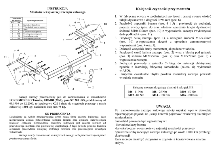 Kolejność czynności przy montażu INSTRUKCJA Montażu i eksploatacji zaczepu kulowego Oznaczenie zacisku wg ISO PN 1 L 2 + 3 31 4 R 5 58R 6 54 7 58L 11 Łączenie przewodów 6 Kierunkowskazy lewe Tylne światła przeciwmgłowe Masa Kierunkowskazy prawe Światła pozycyjne prawe Światła hamowania Światła pozycyjne lewe 10 A A 4 6 6 A 9 1 5 11 8 17 A 7 1. W fabryczne otwory w podłużnicach po lewej i prawej stronie włożyć tulejki dystansowe o długości L=94 mm (poz. 6). 2. Przyłożyć wsporniki boczne (poz. 4 i 5) i przykręcić do podłużnic poprzez otwory (poz. A) oraz włożone uprzednio tulejki dystansowe śrubami M10x130mm (poz. 10) z wyposażenia zaczepu (wykorzystać duże podkładki - poz. 11). 3. Przyłożyć belkę zaczepu (poz. 1), a następnie śrubami M12x30mm (poz. 10) z wyposażenia skręcić z uprzednio zamontowanymi wspornikami (poz. 4 oraz 5). 4. Dokręcić wszystkie śruby momentem jak podano w tabelce. 5. Przykręcić cześć kulista zaczepu (poz. 2) wraz z blachą pod gniazdo (poz. 3) śrubami M12x75mm (poz. 7) oraz M12x70mm (poz. 8) z wyposażenia zaczepu. 6. Podłączyć przewody z gniazdka 7- bieg. do instalacji elektrycznej zgodnie z instrukcją fabryczną samochodu (zaleca się wykonanie w ASO). 7. Uzupełnić ewentualne ubytki powłoki malarskiej zaczepu powstałe w trakcie montażu. 9 10 6 3 2 Zaczep kulowy przeznaczony jest do zamontowania w samochodzie FORD MONDEO Turnier, KOMBI (Mk2), poza ST 200 i RS, produkowany od 09.1996 do 12.2000, nr katalogowy C20 i służy do ciągnięcia przyczep o masie całkowitej 1800 kg i nacisku na kulę max 75 kg. OD PRODUCENTA Dziękujemy za wybór produkowanego przez naszą firmę zaczepu kulowego. Jego niezawodność została potwierdzona licznymi testami oraz opiniami zadowolonych klientów. Jednakże niezawodność zaczepów kulowych jest zależna również od prawidłowego montażu oraz prawidłowej eksploatacji. Z tego powodu prosimy Państwa o staranne przeczytanie niniejszej instrukcji montażu oraz przestrzeganie zawartych wskazówek. Zaczep należy zamontować w miejscach do tego celu przeznaczonych przez producenta samochodu. Zalecany moment skręcający dla śrub i nakrętek 8,8: M6 - 11 Nm M8 - 25 Nm M10 - 50 Nm M12 - 87 Nm M14 - 138 Nm M16 - 210 Nm UWAGA Po zamontowaniu zaczepu kulowego należy uzyskać wpis w dowodzie rejestracyjnym pojazdu na „stacji kontroli pojazdów” właściwej dla miejsca zamieszkania. Samochód powinien być wyposażony w : -kierunkowskazy boczne -lusterka boczne o rozstawie co najmniej szerokości przyczepy Sprawdzać śruby mocujące zaczepu kulowego po około 1 000 km przebiegu eksploatacji. Kula zaczepu musi być utrzymana w czystości i konserwowana smarem stałym. PPUH AUTO-HAK S.J. Wyposażenie zaczepu: Produkcja Zaczepów Kulowych Henryk i Zbigniew Nejman 76-200 SŁUPSK ul. Słoneczna 16K tel/fax (059) 8-414-414; 8-414-413 E-mail: [email protected] www. autohak.com.pl Zaczep kulowy bez wyposażenia elektrycznego C20 Klasa: A50-X Nr kat. Przeznaczony do zamontowania w samochodzie: Producent: FORD Model: MONDEO Turnier Typ: KOMBI (Mk2), poza ST 200 i RS produkowanego od 09.1996r. do 12.2000r. Dane techniczne: Wartość siły D: 9,20 kN maksymalna masa przyczepy: 1800 kg maksymalny nacisk na kulę: 75 kg Numer homologacji zgodnie z wytycznymi regulaminu EKG/ONZ 55.01: E20-55R-01 0824 KARTA GWARANCYJNA Producent udziela gwarancji niniejszą kartą gwarancyjną na okres 24 miesięcy licząc od dnia zakupu zaczepu kulowego do samochodu: FORD MONDEO TURNIER KOMBI (Mk2), poza ST 200 i RS produkowany od 09.1996r. do 12.2000r. Data produkcji .............................. Data zakupu........................................ Zakres gwarancji obejmuje wyłącznie wady jakościowe wynikające z winy producenta. Gwarancja nie obejmuje natomiast uszkodzeń zawinionych przez nabywcę, wynikających z niewłaściwego montażu, użytkowania lub konserwacji, uszkodzeń mechanicznych, normalnego zużycia podczas eksploatacji itp. Gwarancja udzielona na zakupiony towar nie wyłącza, nie ogranicza ani nie zawiesza uprawnień kupującego wynikających z niezgodności towaru z umową. Reklamacje należy zgłaszać w punkcie sprzedaży, składając jednocześnie kartę gwarancyjną. Usunięcie "wady" następuje po stwierdzeniu przez punkt sprzedaży wspólnie z producentem słuszności złożonej reklamacji. Reklamacja powinna być załatwiona w ciągu 14 dni od dnia uznania reklamacji. Karta gwarancyjna jest nieważna jeżeli nie jest wypełniona i podpisana. Data zgłoszenia reklamacji: ................................................................... INFORMACJA WSTĘPNA Zaczep kulowy jest skonstruowany zgodnie z zasadami bezpieczeństwa ruchu drogowego. Zaczep kulowy jest elementem wpływającym na bezpieczeństwo jazdy i może zostać zainstalowany wyłącznie przez personel wyspecjalizowany. Niedopuszczalne jest dokonywanie jakichkolwiek zmian w konstrukcji zaczepu. Powoduje to wygaśniecie dopuszczenia do stosowania. W przypadku obecności masy izolacyjnej lub osłony podwozia w miejscu przylegania zaczepu, należy ją usunąć. Nieosłonięte miejsca karoserii oraz wywiercone otwory należy pomalować farbą antykorozyjną. Informacjami wiążącymi odnośnie wartości obciążeń są dane podawane przez producenta samochodu, względnie wartości maksymalnej masy przyczepy oraz maksymalnego nacisku na kulę, przy czym wartości parametrów zaczepu kulowego nie mogą być przekroczone. Wzór do obliczania wartości siły D: Maks. masa przyczepy [kg] x Masa całkowita samochodu [kg] 9,81 = X + 1000 Maks. masa przyczepy [kg] + Masa całkowita samochodu [kg] + D [kN]