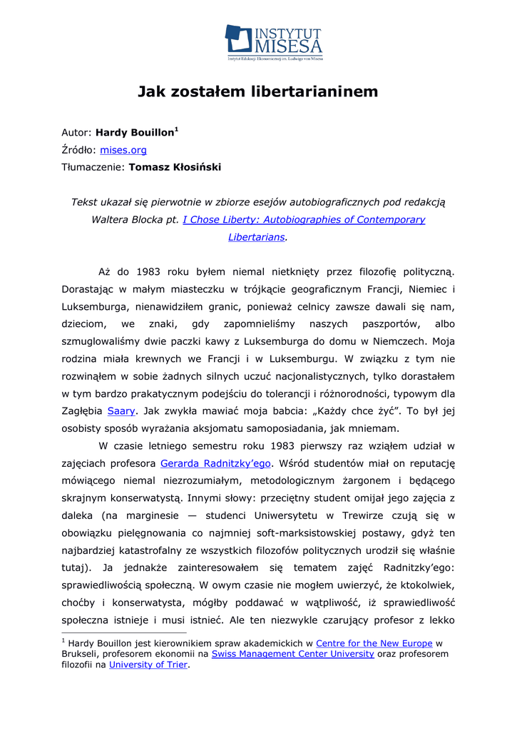 Jak zostałem libertarianinem Autor: Hardy Bouillon1 Źródło: mises.org Tłumaczenie: Tomasz Kłosiński Tekst ukazał się pierwotnie w zbiorze esejów autobiograficznych pod redakcją Waltera Blocka pt. I Chose Liberty: Autobiographies of Contemporary Libertarians. Aż do 1983 roku byłem niemal nietknięty przez filozofię polityczną. Dorastając w małym miasteczku w trójkącie geograficznym Francji, Niemiec i Luksemburga, nienawidziłem granic, ponieważ celnicy zawsze dawali się nam, dzieciom, we znaki, gdy zapomnieliśmy naszych paszportów, albo szmuglowaliśmy dwie paczki kawy z Luksemburga do domu w Niemczech. Moja rodzina miała krewnych we Francji i w Luksemburgu. W związku z tym nie rozwinąłem w sobie żadnych silnych uczuć nacjonalistycznych, tylko dorastałem w tym bardzo prakatycznym podejściu do tolerancji i różnorodności, typowym dla Zagłębia Saary. Jak zwykła mawiać moja babcia: „Każdy chce żyć”. To był jej osobisty sposób wyrażania aksjomatu samoposiadania, jak mniemam. W czasie letniego semestru roku 1983 pierwszy raz wziąłem udział w zajęciach profesora Gerarda Radnitzky’ego. Wśród studentów miał on reputację mówiącego niemal niezrozumiałym, metodologicznym żargonem i będącego skrajnym konserwatystą. Innymi słowy: przeciętny student omijał jego zajęcia z daleka (na marginesie — studenci Uniwersytetu w Trewirze czują się w obowiązku pielęgnowania co najmniej soft-marksistowskiej postawy, gdyż ten najbardziej katastrofalny ze wszystkich filozofów politycznych urodził się właśnie tutaj). Ja jednakże zainteresowałem się tematem zajęć Radnitzky’ego: sprawiedliwością społeczną. W owym czasie nie mogłem uwierzyć, że ktokolwiek, choćby i konserwatysta, mógłby poddawać w wątpliwość, iż sprawiedliwość społeczna istnieje i musi istnieć. Ale ten niezwykle czarujący profesor z lekko 1 Hardy Bouillon jest kierownikiem spraw akademickich w Centre for the New Europe w Brukseli, profesorem ekonomii na Swiss Management Center University oraz profesorem filozofii na University of Trier. południowo-morawsko-wiedeńskim akcentem, który stale przeskakiwał między niemieckim i angielskim, delikatnie uśmiechając się, gdy wyjaśniał nam tezę Hayeka, mówiącą że sprawiedliwość społeczna stanowi pomieszanie kategorii, a więc jest błędem. Moja dusza była w tarapatach, ale mimo wszystko był to rodzaj tego wyzwania intelektualnego, którego brakowało mi przez tyle lat na Uniwersytecie w Trewirze, gdzie większość profesorów filozofii uczyła raczej historii filozofii niż samej filozofii. Gerard Radnitzky był inny. Jego analityczne przygotowanie i rygor logiczny były jak powiew świeżego powietrza. Te zajęcia sprawiły, że wykonałem woltę o 180 stopni. Lubiłem popperowsko-hayekowskie podejście do filozofii, które znalazłem u Radnitzky’ego. Dzięki niemu miałem szansę nauczyć się od Hayeka trzech ważnych koncepcji. Po pierwsze, idei rozpoznawania wzorców i przewidywania wzorców, wraz ze spostrzeżeniem, że umysł jest aparatem rozpoznawczym (ang. recognition apparatus — przyp. tłum.), na który wpływ ma ewolucja człowieka, oraz jego własny rozwój. A zatem pozostaje on pod wpływem wkładu kulturowego. Po drugie, że istnieją dwa systemy moralne, ten związany z hordą i ten związany z abstrakcyjnym społeczeństwem. Pierwszy nie może zastąpić drugiego bez katastrofalnych konsekwencji. Po trzecie, bliźniaczych idei ewolucji kulturowej i ładu spontanicznego, które wyjaśniają, iż wiele uporządkowanych struktur w społeczeństwie rozwinęło się spontanicznie poprzez ludzkie interakcje w procesie ewolucji kulturowej. Pomimo mojego wielkiego podziwu dla Hayeka, byłem rozczarowany jego niewystarczającą definicją wolności indywidualnej. Popper pod tym względem był jeszcze gorszy, więc rozwinąłem swoją własną definicję. Wynikiem mojej „eksplikacji”, roszczącym sobie miano pozbawionego wewnętrznych sprzeczności, jest spojrzenie na wolność i przymus zakładające, że zawierają one propozycje dwóch rodzajów, tj. zarówno wolność, jak i przymus pytają nas o dwie różne decyzje, jedną na poziomie obiektów, drugą zaś na meta-poziomie. Jednym słowem: człowiek wybiera i nie może nie wybierać. Wybieramy cały czas. Ciągły napływ informacji rzutuje na jednostkę. Ona dokonuje selekcji zgodnie ze swoimi preferencjami; skłania się do niektórych z nich (stosownie do ich istotności), a ignoruje resztę. Niektóre z selekcji są czynione jawnie, niektóre niejawnie, a nawet podświadomie. Kiedy dostrzeżemy, że znajdujemy się w obliczu wyboru, mamy w zasadzie dwie opcje: albo przyjąć wybór, który został nam zaoferowany lub narzucony, a zatem zmienić nasze oryginalne plany, albo zignorować ten wybór. Jednostka przeprowadza, jawnie bądź niejawnie (czasami nawet podświadomie), badanie kosztów i korzyści. Być może prostszy przykład pomoże zilustrować istotę rzeczy. Idąc przez miasto i postępując zgodnie ze swoim planem, muszę przejść przez ulicę, jednak widzę w pewnej odległości zbliżający się samochód. Następnie muszę zdecydować, czy iść, czy zatrzymać się i poczekać, aż samochód przejedzie. Niejawnie kalkuluję ryzyko i dokonuję prognozy. Gdy mijam plac handlowy warzyw i owoców, mogę usłyszeć kupca promującego swoje towary i krzyczącego: „jabłka, pomarańcze, banany!” Słyszę jego krzyki i pierwszą decyzją, jaką muszę podjąć, jest: czy skłonić się ku jego propozycji i zapoznać się z jego ofertą owoców, czy zignorować krzyki i trzymać się mojego pierwotnego planu przejścia przez rynek, bez zwracania na niego uwagi. Pierwsza decyzja poprzedza logicznie ewentualność drugiej decyzji dotyczącej rodzajów owoców, a zatem poprzedza ją także historycznie. Oczywiście jednostka może nie zauważyć różnicy czasowej pomiędzy nimi; różnica ta może być