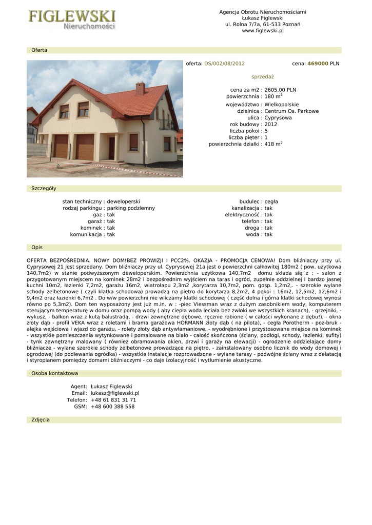 Agencja Obrotu Nieruchomościami Łukasz Figlewski ul. Rolna 7/7a, 61-533 Poznań www.figlewski.pl Oferta oferta: DS/002/08/2012 cena: 469000 PLN sprzedaż cena za m2 : 2605.00 PLN powierzchnia : 180 m2 województwo : Wielkopolskie dzielnica : Centrum Os. Parkowe ulica : Cyprysowa rok budowy : 2012 liczba pokoi : 5 liczba pięter : 1 powierzchnia działki : 418 m2 Szczegóły stan techniczny : deweloperski rodzaj parkingu : parking podziemny gaz : tak garaż : tak kominek : tak komunikacja : tak budulec : cegła kanalizacja : tak elektryczność : tak telefon : tak droga : tak woda : tak Opis OFERTA BEZPOŚREDNIA. NOWY DOM!BEZ PROWIZJI I PCC2%. OKAZJA - PROMOCJA CENOWA! Dom bliźniaczy przy ul. Cyprysowej 21 jest sprzedany. Dom bliźniaczy przy ul. Cyprysowej 21a jest o powierzchni całkowitej 180m2 ( pow. użytkowa 140,7m2) w stanie podwyższonym deweloperskim. Powierzchnia użytkowa 140,7m2 domu składa się z : - salon z przygotowanym miejscem na kominek 28m2 i bezpośrednim wyjściem na taras i ogród, zupełnie oddzielnej i bardzo jasnej kuchni 10m2, łazienki 7,2m2, garażu 16m2, wiatrołapu 2,3m2 ,korytarza 10,7m2, pom. gosp. 1,2m2,. - szerokie wylane schody żelbetonowe ( czyli klatka schodowa) prowadzą na piętro do korytarza 8,2m2, 4 pokoi : 16m2, 12,5m2, 12,6m2 i 9,4m2 oraz łazienki 6,7m2 . Do w/w powierzchni nie wliczamy klatki schodowej ( część dolna i górna klatki schodowej wynosi równo po 5,3m2). Dom ten wyposażony jest już m.in. w : -piec Viessman wraz z dużym zasobnikiem wody, komputerem sterującym temperaturę w domu oraz pompą wody ( aby ciepła woda leciała bez zwłoki we wszystkich kranach), - grzejniki, wykusz, - balkon wraz z kutą balustradą, - drzwi zewnętrzne dębowe, ręcznie robione ( w całości wykonane z dębu!), - okna złoty dąb - profil VEKA wraz z roletami i brama garażowa HORMANN złoty dąb ( na pilota), - cegła Porotherm - poz-bruk alejka wejściowa i wjazd do garażu, - rolety złoty dąb antywłamaniowe, - wyodrębnione i przystosowane miejsce na kominek - wszystkie pomieszczenia wytynkowane i pomalowane na biało - całość skończona (ściany, podłogi, schody, łazienki, sufity) - tynk zewnętrzny malowany ( również obramowania okien, drzwi i garaży na elewacji) - ogrodzenie oddzielające domy bliźniacze - wylane szerokie schody żelbetonowe prowadzące na piętro, - zainstalowany osobno licznik do wody domowej i ogrodowej (do podlewania ogródka) - wszystkie instalacje rozprowadzone - wylane tarasy - podwójne ściany wraz z delatacją i styropianem pomiędzy domami bliźniaczymi - co daje izolacyjność i wytłumienie akustyczne. Osoba kontaktowa Agent: Łukasz Figlewski Email: [email protected] Telefon: +48 61 831 31 71 GSM: +48 600 388 558 Zdjęcia