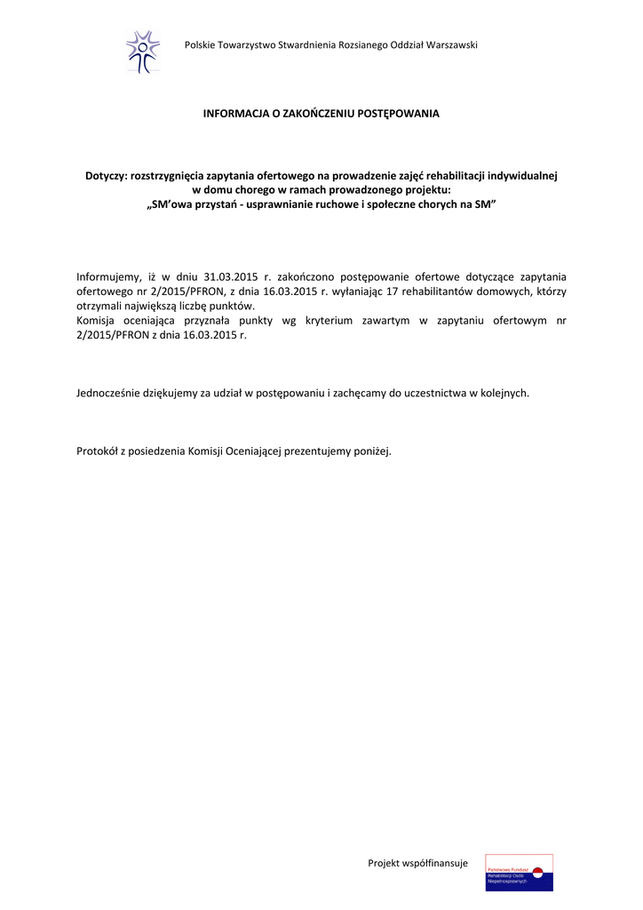 Polskie Towarzystwo Stwardnienia Rozsianego Oddział Warszawski INFORMACJA O ZAKOŃCZENIU POSTĘPOWANIA Dotyczy: rozstrzygnięcia zapytania ofertowego na prowadzenie zajęć rehabilitacji indywidualnej w domu chorego w ramach prowadzonego projektu: „SM’owa przystań - usprawnianie ruchowe i społeczne chorych na SM” Informujemy, iż w dniu 31.03.2015 r. zakończono postępowanie ofertowe dotyczące zapytania ofertowego nr 2/2015/PFRON, z dnia 16.03.2015 r. wyłaniając 17 rehabilitantów domowych, którzy otrzymali największą liczbę punktów. Komisja oceniająca przyznała punkty wg kryterium zawartym w zapytaniu ofertowym nr 2/2015/PFRON z dnia 16.03.2015 r. Jednocześnie dziękujemy za udział w postępowaniu i zachęcamy do uczestnictwa w kolejnych. Protokół z posiedzenia Komisji Oceniającej prezentujemy poniżej. Projekt współfinansuje Polskie Towarzystwo Stwardnienia Rozsianego Oddział Warszawski PROTOKÓŁ z wyboru najkorzystniejszej oferty na prowadzenie zajęć rehabilitacji indywidualnej w domu chorego w ramach prowadzonego projektu: „SM’owa przystań - usprawnianie ruchowe i społeczne chorych na SM”, realizowanego ze środków Państwowego Fundusz Rehabilitacji Osób Niepełnosprawnych Nr postępowania: 2/2015/PFRON, data: 16.03.2015r. I. Zamawiający: Polskie Towarzystwo Stwardnienia Rozsianego Oddział Warszawski ul. Nowosielecka 12, 00-466 Warszawa, [email protected] II. Przedmiot zamówienia: Przedmiotem zamówienia jest przeprowadzenie zajęć rehabilitacji indywidualnej w domu chorego zajęć usprawniających ruchowo dla uczestników projektu: „SM’owa przystań - usprawnianie ruchowe i społeczne chorych na SM” na terenie województwa mazowieckiego. III. Termin składania ofert: 30.03.2015r. IV. Termin wykonania usługi: kwiecień 2015 r. – 31 marzec 2016 r. V. Dnia 16.03.2015r. Zamawiający wysłał informację do następujących potencjalnych wykonawców: L.p. 1 2 3 Nazwa oferenta Anna Kryszczuk Paulina Chrząszcz Tomasz Gładysz VI. Sposób upublicznienia oferty: Oferta upubliczniona została na stronie internetowej Zamawiającego (w zakładce ogłoszenia) oraz w Jego siedzibie. VII. Do dnia 30.03.2015 r. wpłynęły następujące oferty: L.p. Nazwa oferenta 1 2 3 ARTIMED Artur Gałęski BLUE-MED. Maciej Błaszczyk Centrum Ruchu "PAWEŁEK" Paweł Maciejewski Chrząszcz Paulina Drużbicki Artur Gimnastyka Seniorów mgr Anna Kryszczuk Gładysz Tomasz Gumowska Izabela Karaś Paweł Kopytko Michał 4 5 6 7 8 9 10 Data wpłynięcia oferty 2015.03.17 2015.03.20 2015.03.23 2015.03.27 2015.03.19 2015.03.19 2015.03.27 2015.03.28 2015.03.20 2015.03.27 Projekt współfinansuje Polskie Towarzystwo Stwardnienia Rozsianego Oddział Warszawski 11 12 13 14 15 16 17 Kowalczyk Kamila Łodkowski Cezary MONI-MED. Rehabilitacja Monika Polak OFP FIZJOBIOMECH PIOTR KOSTRZĘBSKI REHABILITACJA "HUBER" mgr Paweł Huber REHMAR usługi fizjoterapeutyczne Marcin Kowalski Mgr Małgorzata Tymińska Rehabilitacja lecznicza 2015.03.30 2015.03.23 2015.03.27 2015.03.26 2015.03.20 2015.03.30 2015.03.25 Po dniu 30.03.2015r..nie wpłynęła żadna oferta droga pocztową. VIII. Kryterium wyboru oferty stanowiła: - Najniższa cena - 80 pkt. - Doświadczenie - 20 pkt.: UZASADNIENIE Zgodnie z zastrzeżeniem przez Zamawiającego prawa do wyboru kilku Wykonawców, ze względu na możliwość równoczesnej realizacji zadań na terenie wskazanym przez Oferentów, Komisja Ofertowa na posiedzeniu w dniu 31.03.2015 r. dokonała wyboru oferentów, którzy złożyli najkorzystniejszą ofertę i uzyskali najwyższą ilość punktów wg kryterium cena 80 pkt. oraz doświadczenie 20 pkt. Oferty, które zostały pozytywnie ocenione pod względem formalnym i merytorycznym otrzymując największą ilość punktów w zakresie podanych w zapytaniu kryteriów przedstawiają się następująco: L.p. Nazwa oferenta 1 2 ARTIMED Artur Gałęski BLUE-MED. Maciej Błaszczyk Gimnastyka Seniorów mgr Anna Kryszczuk Gładysz Tomasz MONI-MED. Rehabilitacja Monika Polak OFP FIZJOBIOMECH PIOTR KOSTRZĘBSKI REHABILITACJA "HUBER" mgr Paweł Huber Mgr Małgorzata Tymińska Rehabilitacja lecznicza Drużbicki Artur Centrum Ruchu "PAWEŁEK" Paweł 3 4 5 6 7 8 9 10 Ilość punktów cena 80 Ilość punktów doświadczenie Razem 20 100 80 20 100 80 20 100 80 20 100 80 20 100 80 20 100 80 20 100 80 20 100 80 15 95 80 15 95 Projekt współfinansuje Polskie Towarzystwo Stwardnienia Rozsianego Oddział Warszawski 11 12 13 14 15 16 17 Maciejewski Kopytko Michał REHMAR usługi fizjoterapeutyczne Marcin Kowalski Chrząszcz Paulina Gumowska Izabela Karaś Paweł Kowalczyk Kamila Łodkowski Cezary 80 15 95 80 15 95 80 80 80 80 80 10 10 10 10 10 90 90 90 90 90 Postępowanie przeprowadziła Komisja w składzie: 1. Marcin Skroczyński – Przewodniczący 2. Elżbieta Lasak – Sekretarz 3. Monika Staniec – Członek Data sporządzenia protokołu – 31.03.2015 Zatwierdził Kierownik Jednostki Elżbieta Doraczyńska, 31.03.2015 Projekt współfinansuje