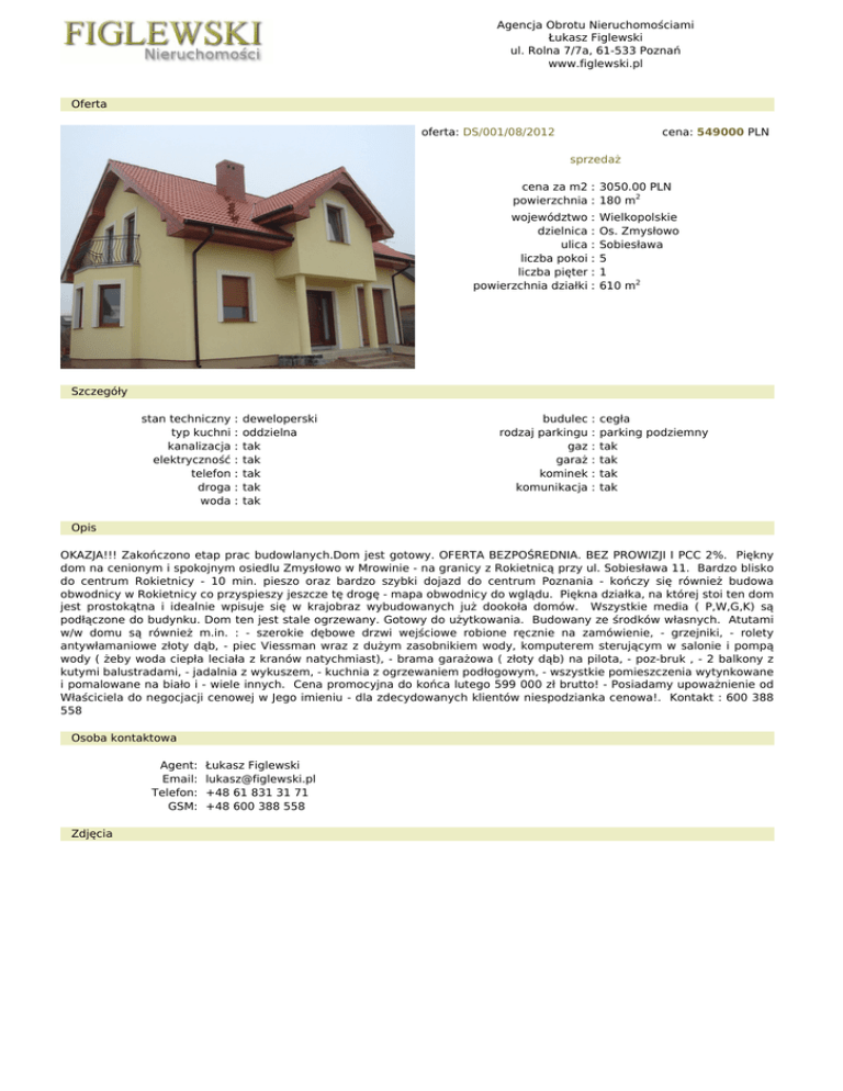 Agencja Obrotu Nieruchomościami Łukasz Figlewski ul. Rolna 7/7a, 61-533 Poznań www.figlewski.pl Oferta oferta: DS/001/08/2012 cena: 549000 PLN sprzedaż cena za m2 : 3050.00 PLN powierzchnia : 180 m2 województwo : Wielkopolskie dzielnica : Os. Zmysłowo ulica : Sobiesława liczba pokoi : 5 liczba pięter : 1 powierzchnia działki : 610 m2 Szczegóły stan techniczny : deweloperski typ kuchni : oddzielna kanalizacja : tak elektryczność : tak telefon : tak droga : tak woda : tak budulec : cegła rodzaj parkingu : parking podziemny gaz : tak garaż : tak kominek : tak komunikacja : tak Opis OKAZJA!!! Zakończono etap prac budowlanych.Dom jest gotowy. OFERTA BEZPOŚREDNIA. BEZ PROWIZJI I PCC 2%. Piękny dom na cenionym i spokojnym osiedlu Zmysłowo w Mrowinie - na granicy z Rokietnicą przy ul. Sobiesława 11. Bardzo blisko do centrum Rokietnicy - 10 min. pieszo oraz bardzo szybki dojazd do centrum Poznania - kończy się również budowa obwodnicy w Rokietnicy co przyspieszy jeszcze tę drogę - mapa obwodnicy do wglądu. Piękna działka, na której stoi ten dom jest prostokątna i idealnie wpisuje się w krajobraz wybudowanych już dookoła domów. Wszystkie media ( P,W,G,K) są podłączone do budynku. Dom ten jest stale ogrzewany. Gotowy do użytkowania. Budowany ze środków własnych. Atutami w/w domu są również m.in. : - szerokie dębowe drzwi wejściowe robione ręcznie na zamówienie, - grzejniki, - rolety antywłamaniowe złoty dąb, - piec Viessman wraz z dużym zasobnikiem wody, komputerem sterującym w salonie i pompą wody ( żeby woda ciepła leciała z kranów natychmiast), - brama garażowa ( złoty dąb) na pilota, - poz-bruk , - 2 balkony z kutymi balustradami, - jadalnia z wykuszem, - kuchnia z ogrzewaniem podłogowym, - wszystkie pomieszczenia wytynkowane i pomalowane na biało i - wiele innych. Cena promocyjna do końca lutego 599 000 zł brutto! - Posiadamy upoważnienie od Właściciela do negocjacji cenowej w Jego imieniu - dla zdecydowanych klientów niespodzianka cenowa!. Kontakt : 600 388 558 Osoba kontaktowa Agent: Łukasz Figlewski Email: [email protected] Telefon: +48 61 831 31 71 GSM: +48 600 388 558 Zdjęcia