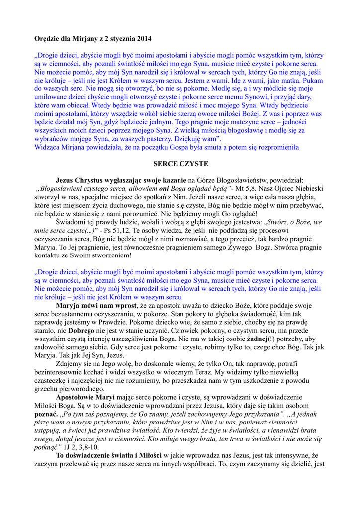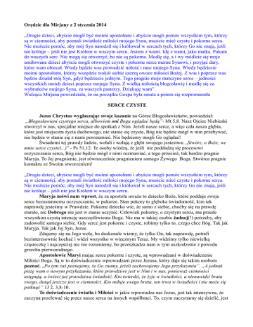 Orędzie dla Mirjany z 2 stycznia 2014 „Drogie dzieci, abyście mogli być moimi apostołami i abyście mogli pomóc wszystkim tym, którzy są w ciemności, aby poznali światłość miłości mojego Syna, musicie mieć czyste i pokorne serca. Nie możecie pomóc, aby mój Syn narodził się i królował w sercach tych, którzy Go nie znają, jeśli nie króluje – jeśli nie jest Królem w waszym sercu. Jestem z wami. Idę z wami, jako matka. Pukam do waszych serc. Nie mogą się otworzyć, bo nie są pokorne. Modlę się, a i wy módlcie się moje umiłowane dzieci abyście mogli otworzyć czyste i pokorne serce memu Synowi, i przyjąć dary, które wam obiecał. Wtedy będzie was prowadzić miłość i moc mojego Syna. Wtedy będziecie moimi apostołami, którzy wszędzie wokół siebie szerzą owoce miłości Bożej. Z was i poprzez was będzie działał mój Syn, gdyż będziecie jednym. Tego pragnie moje matczyne serce – jedności wszystkich moich dzieci poprzez mojego Syna. Z wielką miłością błogosławię i modlę się za wybrańców mojego Syna, za waszych pasterzy. Dziękuję wam”. Widząca Mirjana powiedziała, że na początku Gospa była smuta a potem się rozpromieniła SERCE CZYSTE Jezus Chrystus wygłaszając swoje kazanie na Górze Błogosławieństw, powiedział: „Błogosławieni czystego serca, albowiem oni Boga oglądać będą”- Mt 5,8. Nasz Ojciec Niebieski stworzył w nas, specjalne miejsce do spotkań z Nim. Jeżeli nasze serce, a więc cała nasza głębia, które jest miejscem życia duchowego, nie stanie się czyste, Bóg nie będzie mógł w nim przebywać, nie będzie w stanie się z nami porozumieć. Nie będziemy mogli Go oglądać! Świadomi tej prawdy ludzie, wołali i wołają z głębi swojego jestestwa: „Stwórz, o Boże, we mnie serce czyste(...)” - Ps 51,12. Te osoby wiedzą, że jeśli nie poddadzą się procesowi oczyszczania serca, Bóg nie będzie mógł z nimi rozmawiać, a tego przecież, tak bardzo pragnie Maryja. To Jej pragnienie, jest równocześnie pragnieniem samego Żywego Boga. Stwórca pragnie kontaktu ze Swoim stworzeniem! „Drogie dzieci, abyście mogli być moimi apostołami i abyście mogli pomóc wszystkim tym, którzy są w ciemności, aby poznali światłość miłości mojego Syna, musicie mieć czyste i pokorne serca. Nie możecie pomóc, aby mój Syn narodził się i królował w sercach tych, którzy Go nie znają, jeśli nie króluje – jeśli nie jest Królem w waszym sercu. Maryja mówi nam wprost, że za apostoła uważa to dziecko Boże, które poddaje swoje serce bezustannemu oczyszczaniu, w pokorze. Stan pokory to głęboka świadomość, kim tak naprawdę jesteśmy w Prawdzie. Pokorne dziecko wie, że samo z siebie, choćby się na prawdę starało, nic Dobrego nie jest w stanie uczynić. Człowiek pokorny, o czystym sercu, ma przede wszystkim czystą intencję uszczęśliwienia Boga. Nie ma w takiej osobie żadnej(!) potrzeby, aby zadowolić samego siebie. Gdy serce jest pokorne i czyste, robimy tylko to, czego chce Bóg. Tak jak Maryja. Tak jak Jej Syn, Jezus. Zdajemy się na Jego wolę, bo doskonale wiemy, że tylko On, tak naprawdę, potrafi bezinteresownie kochać i widzi wszystko w wiecznym Teraz. My widzimy tylko niewielką cząsteczkę i najczęściej nic nie rozumiemy, bo przeszkadza nam w tym uszkodzenie z powodu grzechu pierworodnego. Apostołowie Maryi mając serce pokorne i czyste, są wprowadzani w doświadczenie Miłości Boga. Są w to doświadczenie wprowadzani przez Jezusa, który daje się takim osobom poznać. „Po tym zaś poznajemy, że Go znamy, jeżeli zachowujemy Jego przykazania”. „A jednak piszę wam o nowym przykazaniu, które prawdziwe jest w Nim i w nas, ponieważ ciemności ustępują, a świeci już prawdziwa światłość. Kto twierdzi, że żyje w światłości, a nienawidzi brata swego, dotąd jeszcze jest w ciemności. Kto miłuje swego brata, ten trwa w światłości i nie może się potknąć” 1J 2, 3,8-10. To doświadczenie światła i Miłości w jakie wprowadza nas Jezus, jest tak intensywne, że zaczyna przelewać się przez nasze serca na innych współbraci. To, czym zaczynamy się dzielić, jest Miłością samego Boga, Syna Maryi. Nasze apostołowanie zakorzenione jest w Bogu! Jeśli nie ma takiej kolejności w stawaniu się apostołem, skutki świadczenia o Bogu zawsze są raniące. Idę z wami, jako matka. Pukam do waszych serc. Nie mogą się otworzyć, bo nie są pokorne. Modlę się, a i wy módlcie się moje umiłowane dzieci abyście mogli otworzyć czyste i pokorne serce memu Synowi, i przyjąć dary, które wam obiecał. Poznawanie Boga to ruch, stawanie się, wydarzenie, a więc doświadczenie, które w żadnym momencie nie jest statyczne! Za wszelką cenę musimy pozwolić się wyrwać z tego statycznego stanu i wreszcie zacząć iść z Maryją. W czasie tej naszej ziemskiej drogi, Ona bezustannie puka do naszych serc, chce nas wyrwać z duchowego letargu. Nasze serca są uśpione, bo nie widzą zagrożenia. Nie widzą siebie w Prawdzie. Tylko pokora pozwala przyjąć prawdę o własnej ułomności. Nasza Mama mówi to wprost: wasze serca nie mogą się otworzyć, bo nie są pokorne, ani czyste. A to powoduje następny, destrukcyjny skutek, nie pozwalamy żyć Jezusowi w nas i obdarzać się Jego darami. A bez nich jesteśmy nieskutecznymi, bo pozbawionymi autentyczności apostołami! Maryja wie, że proces oczyszczania serca z naszych przyzwyczajeń i wyobrażeń czym jest miłość jest bolesny. Dlatego ciągle nam towarzyszy jako matka, która utuli, pocieszy i obroni przed wrogiem. Pozostaje nam jedynie poddać się w wolności temu procesowi. Maryja swoją obecnością i wstawiennictwem, dodaje nam odwagi! Wtedy będzie was prowadzić miłość i moc mojego Syna. Wtedy będziecie moimi apostołami, którzy wszędzie wokół siebie szerzą owoce miłości Bożej. Z was i poprzez was będzie działał mój Syn, gdyż będziecie 