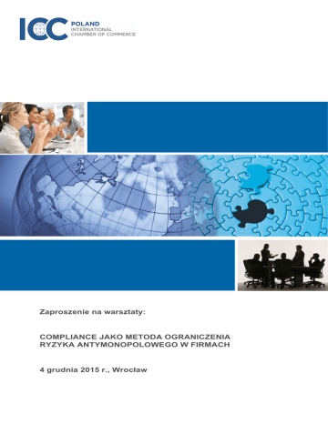 Zaproszenie na warsztaty: COMPLIANCE JAKO METODA OGRANICZENIA RYZYKA ANTYMONOPOLOWEGO W FIRMACH 4 grudnia 2015 r., Wrocław Opis wydarzenia: Komisja Konkurencji Międzynarodowej Izby Handlowej w Polsce (ICC Polska) ma zaszczyt zaprosić do udziału w warsztatach będących częścią cyklu spotkań regionalnych poświęconych programom przestrzegania prawa konkurencji (competition compliance). W spotkaniach udział wezmą przedstawiciele Urzędu Ochrony Konkurencji i Konsumentów, przedsiębiorcy, specjaliści z zakresu prawa konkurencji oraz przedstawiciele środowisk akademickich. Warsztaty mają na celu przybliżenie roli programów przestrzegania prawa konkurencji oraz zachęcenie przedsiębiorców do ich tworzenia. Podczas warsztatów Komisja zaprezentuje, jak korzystać z „Zestawu narzędzi ICC do tworzenia programów przestrzegania prawa konkurencji” oraz „Zestawu narzędzi ICC dla MŚP”. Ponadto odbędzie się debata o roli prawa konkurencji w działalności przedsiębiorców, w szczególności małych i średnich, z udziałem przedstawicieli UOKiK, biznesu i nauki. Termin: 4.12.2015 r. godz. 10:00-13.00 Miejsce: Hotel BEST WESTERN PLUS Q, ul. Zaolziańska 2, Wrocław Program: 9:45-10.00 Rejestracja uczestników i kawa powitalna 10:00-10:10 Powitanie uczestników i otwarcie warsztatów Sabina Famirska, Wiceprzewodnicząca Komisji Konkurencji ICC Polska 10:10-10:30 Wystąpienie na temat programów zgodności z prawem konkurencji Dr hab. Zbigniew Jurczyk, Dyrektor Delegatury UOKiK we Wrocławiu 10:30-11:45 Warsztat praktyczny 1. Prezentacja „Zestawu narzędzi ICC…” oraz „Zestawu narzędzi ICC dla MŚP” Sabina Famirska, Wiceprzewodnicząca Komisji Konkurencji ICC Polska 2. Competition compliance w praktyce Maciej Wypych, Dyrektor ds. Odpowiedzialności Społecznej, Castorama Polska 11:45-12:00 Przerwa 12:00-13:00 Debata Maciej Wypych, Dyrektor ds. Odpowiedzialności Społecznej, Castorama Polska Dr Grzegorz Materna, Zakład Prawa Konkurencji INP PAN, Hansberry Tomkiel Andrzej Madała, Wardyński i Wspólnicy Moderator: Sabina Famirska, Wiceprzewodnicząca Komisji Konkurencji ICC Polska RSVP: udział w wydarzeniu jest bezpłatny. Z uwagi na ograniczoną liczbę miejsc wymagane jest wcześniejsze potwierdzenie uczestnictwa [email protected], tel.: 22 537 82 00. pod adresem e-mail: