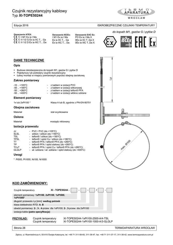 Czujnik rezystancyjny kablowy Typ XI-TOPE50244 Edycja 2016 ISKROBEZPIECZNE CZUJNIKI TEMPERATURY do kopalń M1, gazów G i pyłów D Oznaczenie ATEX: I M1 Ex ia I Ma II 1/2 G Ex ia IIC T... Ga II 1/2 D Ex ia IIIC T... Da Oznaczenie IECEx: Oznaczenie EAC Ex: I M1 Ex ia I Ma Ex ia IIC T... Ga Ex ia IIIC T... Da PO Ex ia I Ma X 0Ex ia IIC T..Ga X 0Ex ia IIIC T..Da X DANE TECHNICZNE Opis Budowa iskrobezpieczna do kopalń M1, gazów G i pyłów D Pojedynczy lub podwójny czujnik rezystancyjny Łatwy montaż w miejscu pomiarowym poprzez obejmę zaciskową Zakres pomiarowy -10 .. +105oC -50 .. +180oC -50 .. +260oC -50 .. +400oC - z kablem w izolacji PVC z kablem w izolacji silikonowej z kablem w izolacji teflon® PFA z kablem w izolacji włókno szklane Element pomiarowy 1x lub 2xPt100 * Klasa A lub B, zgodnie z PN-EN 60751 Obejma zaciskowa Materiał stal ocynkowana Osłona Materiał mosiądz niklowany Izolacja przewodu JJ SLSL TSL TPSL TT TP TCuT GLGLP - PVC / PVC (do +105oC) silikon / silikon (do +180oC) teflon® / silikon (do +180oC) teflon® / oplot Cu / silikon (do +180oC) teflon® PFA / teflon® PFA (do +260oC) teflon® PFA / oplot stalowy (do +260oC) teflon® PFA / oplot Cu / teflon® PFA (do +260oC) wł. szklane / wł. szklane / oplot stalowy (do +400oC) Uwagi * Pt500, Pt1000, Ni100, Ni1000 KOD ZAMÓWIENIOWY: Czujnik temperatury XI - TOPE50244 - - - / - element pomiarowy: 1xPt100, 2xPt100, 1xPt500, 1xPt1000* długość przewodu Lp [mm]: według potrzeb klasa dokładności RTD: A, B obwód pomiarowy: 2-, 3-, 4-przew. dla 1xPt100; 2-, 3-przew. dla 2xPt100 izolacja kabla (patrz specyfikacja) PRZYKŁAD: Strona 28 Czujnik temperatury Czujnik temperatury XI-TOPE50244-1xPt100-2500-A/4-TSL XI-TOPE50244-1xPt100-1000-A/3-GLGLP TERMOAPARATURA WROCŁAW Zębice, ul. Rzemieślnicza 4, 55-010 Święta Katarzyna, tel. +48 71 311-58-60, 311-38-47, fax. +48 71 311-37-17, 311-38-42, www.termoaparatura.com.pl