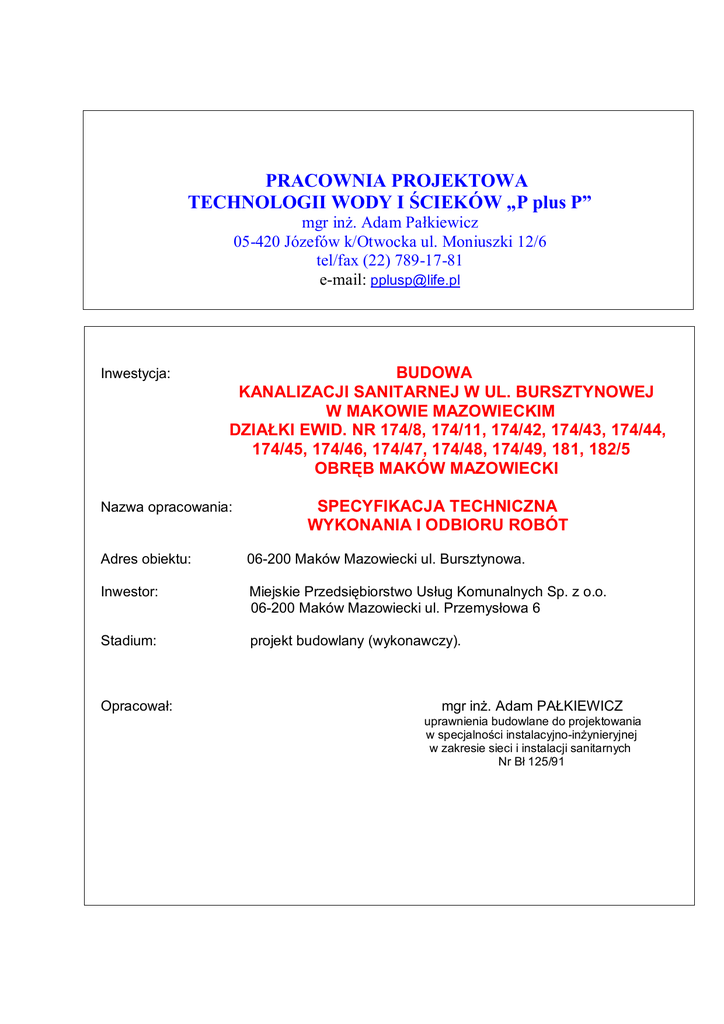 PRACOWNIA PROJEKTOWA TECHNOLOGII WODY I ŚCIEKÓW „P plus P” mgr inż. Adam Pałkiewicz 05-420 Józefów k/Otwocka ul. Moniuszki 12/6 tel/fax (22) 789-17-81 e-mail: [email protected] Inwestycja: BUDOWA KANALIZACJI SANITARNEJ W UL. BURSZTYNOWEJ W MAKOWIE MAZOWIECKIM DZIAŁKI EWID. NR 174/8, 174/11, 174/42, 174/43, 174/44, 174/45, 174/46, 174/47, 174/48, 174/49, 181, 182/5 OBRĘB MAKÓW MAZOWIECKI Nazwa opracowania: SPECYFIKACJA TECHNICZNA WYKONANIA I ODBIORU ROBÓT Adres obiektu: 06-200 Maków Mazowiecki ul. Bursztynowa. Inwestor: Miejskie Przedsiębiorstwo Usług Komunalnych Sp. z o.o. 06-200 Maków Mazowiecki ul. Przemysłowa 6 Stadium: projekt budowlany (wykonawczy). Opracował: mgr inż. Adam PAŁKIEWICZ uprawnienia budowlane do projektowania w specjalności instalacyjno-inżynieryjnej w zakresie sieci i instalacji sanitarnych Nr Bł 125/91 2 Józefów, październik 2013 r. Spis treści I. Część ogólna. 1. Inwestycja. 2. Nazwa opracowania. 3. Adres obiektu. 4. Inwestor. 5. Stadium. 6. Podstawa opracowania. 7. Zakres rzeczowy opracowania. 8. Definicja równoważności. 9. Definicja prototypu. II. Część szczegółowa 1. Ogólne wytyczne wykonawstwa i odbioru robót. 2. Wykaz kart szczegółowych wytycznych wykonawstwa. 3. Specyfikacja równoważności. 3.1. Pompa do ścieków. 3.2. Rurociągi (na zewnątrz obiektów). 3.3. Armatura odcinająca. 3.3.1. Armatura odcinająca w pompowni. 3.3.2. Armatura odcinająca na połączeniu wodociągowym. 3.4. Armatura zwrotna. 3.5. Armatura hydrantowa. 3.6. Przewody wewnętrzne. 1 3 3.7. Ślusarka. 3.8. Prefabrykaty studzienne i obudowy pompowni. 3.9. Włazy studzienne. 3.10. Ogrodzenie prefabrykowane. 3.11. Zabezpieczenie silników i sterowanie pracą pomp. 3.12. Rozdzielnica sterująca. 4. Zaplecze budowy. 4.1. Lokalizacja. 4.2. Dostępność mediów i zasada korzystania. 4.3. Instalacje zaplecza budowy. 4.4. Koszty zaplecza budowy. 4.5. Koszty niezbędnych robót technologicznych o charakterze nie inwestycyjnym. 5. Ogólne wytyczne wykonawstwa i odbioru. 6. Wykaz kart specyfikacji. a/. ST1 - roboty ziemne, b/. ST2 - roboty budowlane, c/. ST3 - roboty montażowe rurociągów, d/. ST4 - roboty montażowe wewnętrzne, e/. ST5 - próby szczelności, czystości i płukanie. 4 I. Część ogólna 1. Inwestycja. Budowa kanalizacji w ul. Bursztynowej w Makowie Mazowieckim. Działki ewid. Nr 174/4, 174/11, 174/42, 174/43, 174/44, 174/45, 174/46, 1764/47, 174/48, 174/49, 181 i 182/5. Obręb Maków Mazowiecki. 2. Nazwa opracowania. Specyfikacja Techniczna Wykonania i Odbioru Robót. 3. Adres obiektu. 06-200 Maków Mazowiecki ul. Bursztynowa. 4. Inwestor. Miejskie Przedsiębiorstwo Usług Komunalnych Sp. z o.o. 06-200 Maków Mazowiecki ul. Przemysłowa 6. 5. Stadium. Projekt budowlany (wykonawczy). 6. Podstawa opracowania. a/. umowa z Inwestorem. b/. projekt budowlany w branży technologicznej i sanitarnej. 7. Zakres rzeczowy opracowania. Opracowanie obejmuje nw. obiekty projektowanej kanalizacji sanitarnej: a/. pompownię P1, b/. studnie rewizyjne S1-S30 oraz Sr1-Sr3, c/. przewody kanalizacji grawitacyjnej Dz200 i 250, d/. przewody kanalizacji ciśnieniowej Dz110, e/. połączenie wodociągowe Dz90 dla potrzeb technicznych terenu pompowni, zasilające hydrant nadziemny Dn80. 8. Definicja równoważności. Z uwagi na specyfikę i stadium opracowania (projekt technologiczny SW w fazie projektu budowlanego wykonawczego) przyjęto z konieczności konkretne rozwiązania materiałowe (urządzenia, armatura, przewody), determinujące rzędne, średnice, konstrukcję hydrauliczną i przestrzenną instalacji oraz parametry technologiczne. Kierowano się przy tym kryterium spełnienia wymaganych potrzeb techniczno-technologicznych; zgodnego z najlepszą wiedzą techniczną oraz z wiedzą aktualnie dostępną nt. zaprojektowanych urządzeń, ujawnioną przez Producentów w ich informacji technicznej. Dlatego też każde, istotne z punktu widzenia technologicznego urządzenie, przewód i armaturę opisano w dokumentacji technicznej ich znakiem firmowym (typ, Producent, charakterystyka techniczno-technologiczna). Natomiast z uwagi na wymagania ustawo- 5 dawstwa o zamówieniach publicznych opisanie uzupełniono klauzulą „lub równoważny(a)”. 9. Definicja prototypu. Zaprojektowane urządzenia technologiczne podstawowe, do których należy zaliczyć pompy są urządzeniami fabrycznymi, przyjętymi w niniejszym opracowaniu na podstawie katalogów Producentów, dostępnej wiedzy dot. konstrukcji materiałowej i technologii wykonania. Posiadają gwarancje należytego funkcjonowania oraz certyfikaty nie wykluczające ich stosowania na terenie UE. Są sprawdzone pod względem funkcjonowania w warunkach wieloletniej eksploatacji na analogicznych obiektach oraz nie są jako takie prototypami co nie wyklucza wystąpienia w zaprojektowanych typowielkościach wszelkich innowacji sygnowanych przez Producentów. Niniejszym wyklucza się możliwość zastosowania (jako zamiennych) urządzeń będących prototypami i/lub plagiatami, przez co rozumieć należy: a/. powtórzenia określane jako „identyczne” z punktu widzenia, wydajności, ciśnień i wymiarów. b/. połączenia urządzeń fabrycznych z uzbrojeniem i oprzyrządowaniem na zasadzie zastąpienia uzbrojenia i oprzyrządowania występującego w kompletnej ofercie Producentów określanym jako „identyczne”, Dla ww. sytuacji niniejszym odmawia się prawa do stosowania kryterium równoważności. II. Część szczegółowa 1. Ogólne wytyczne wykonawstwa i odbioru robót. Całość robót objęta dokumentacją techniczną z wyjątkiem części robót montażowych związanych z technologią SW - z punktu widzenia należytego tzn. zgodnego ze sztuką budowlaną wykonawstwa i odbioru – w sposób wyczerpujący normowana jest w Warunkach Technicznych Wykonania i Odbioru Robót Budowlano-Montażowych: a/. Tom I część 1-4 (roboty budowlane ogólne), b/. Tom II (instalacje sanitarne i przemysłowe), c/. Tom I