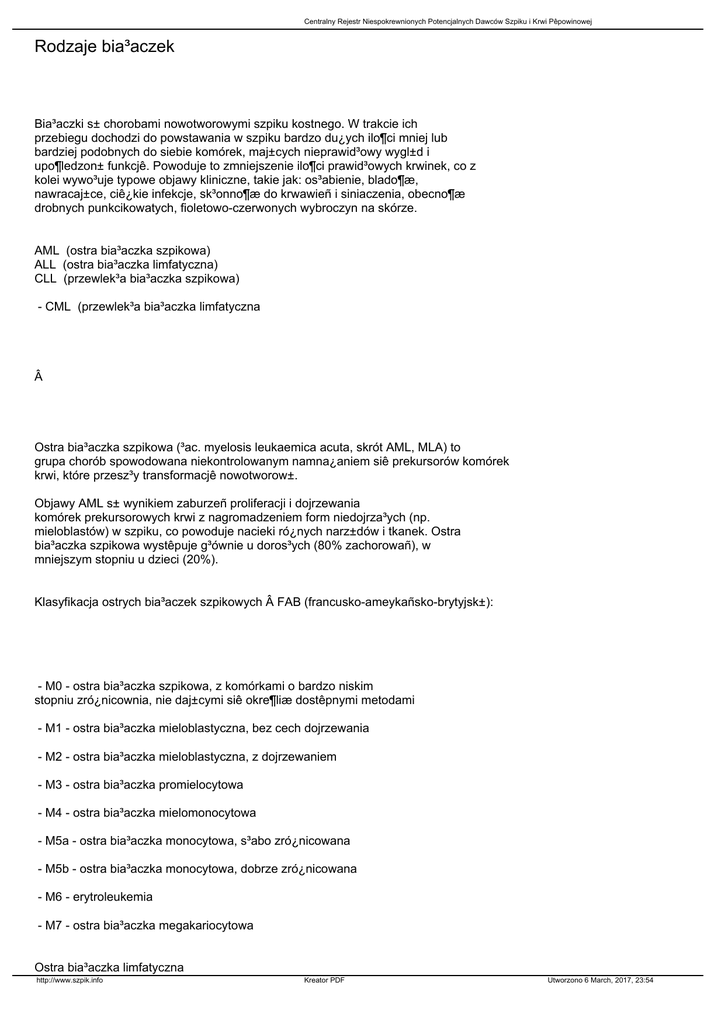 Centralny Rejestr Niespokrewnionych Potencjalnych Dawców Szpiku i Krwi Pêpowinowej Rodzaje bia³aczek Bia³aczki s± chorobami nowotworowymi szpiku kostnego. W trakcie ich przebiegu dochodzi do powstawania w szpiku bardzo du¿ych ilo¶ci mniej lub bardziej podobnych do siebie komórek, maj±cych nieprawid³owy wygl±d i upo¶ledzon± funkcjê. Powoduje to zmniejszenie ilo¶ci prawid³owych krwinek, co z kolei wywo³uje typowe objawy kliniczne, takie jak: os³abienie, blado¶æ, nawracaj±ce, ciê¿kie infekcje, sk³onno¶æ do krwawieñ i siniaczenia, obecno¶æ drobnych punkcikowatych, fioletowo-czerwonych wybroczyn na skórze. AML (ostra bia³aczka szpikowa) ALL (ostra bia³aczka limfatyczna) CLL (przewlek³a bia³aczka szpikowa) - CML (przewlek³a bia³aczka limfatyczna  Ostra bia³aczka szpikowa (³ac. myelosis leukaemica acuta, skrót AML, MLA) to grupa chorób spowodowana niekontrolowanym namna¿aniem siê prekursorów komórek krwi, które przesz³y transformacjê nowotworow±. Objawy AML s± wynikiem zaburzeñ proliferacji i dojrzewania komórek prekursorowych krwi z nagromadzeniem form niedojrza³ych (np. mieloblastów) w szpiku, co powoduje nacieki ró¿nych narz±dów i tkanek. Ostra bia³aczka szpikowa wystêpuje g³ównie u doros³ych (80% zachorowañ), w mniejszym stopniu u dzieci (20%). Klasyfikacja ostrych bia³aczek szpikowych  FAB (francusko-ameykañsko-brytyjsk±): - M0 - ostra bia³aczka szpikowa, z komórkami o bardzo niskim stopniu zró¿nicownia, nie daj±cymi siê okre¶liæ dostêpnymi metodami - M1 - ostra bia³aczka mieloblastyczna, bez cech dojrzewania - M2 - ostra bia³aczka mieloblastyczna, z dojrzewaniem - M3 - ostra bia³aczka promielocytowa - M4 - ostra bia³aczka mielomonocytowa - M5a - ostra bia³aczka monocytowa, s³abo zró¿nicowana - M5b - ostra bia³aczka monocytowa, dobrze zró¿nicowana - M6 - erytroleukemia - M7 - ostra bia³aczka megakariocytowa Ostra bia³aczka limfatyczna http://www.szpik.info Kreator PDF Utworzono 6 March, 2017, 23:54 Centralny Rejestr Niespokrewnionych Potencjalnych Dawców Szpiku i Krwi Pêpowinowej (³ac. lymphadenosis leucaemica acuta, skrót LLA, ALL) choroba nowotworowa charakteryzuj±ca siê niekontrolowanym rozrostem tkanki limfatycznej i naciekaniem jej w ró¿nych narz±dach. Wêz³y ch³onne oraz w±troba i ¶ledziona ulegaj± powiêkszeniu, objawom tym mog± towarzyszyæ bóle brzucha stawów i podwy¿szona temperatura, w nastêpstwie obni¿enia liczby p³ytek krwi mog± wystêpowaæ objawy skazy krwotocznej: wybroczyny na skórze i sk³onno¶æ do powstawania siñców. Przewlek³a bia³aczka limfatyczna (³ac. lymphadenosis leucaemica chronica, skrótem CLL, LLC) choroba spowodowana rozplemem nowotworowym limfocytów i limfoblastów (komórek ró¿nicuj±cych siê w limfocyty B lub T). Objawia siê powiêkszeniem wêz³ów ch³onnych, w±troby, ¶ledziony, zmêczeniem, os³abieniem, niedokrwisto¶ci±, duszno¶ci±, obrzêkiem kostek, wysypk± na skórze. Wystêpuje najczê¶ciej u osób starszych po 60 roku ¿ycia, czê¶ciej u mê¿czyzn ni¿ u kobiet. Ma ³agodniejszy przebieg ni¿ reszta odmian bia³aczek i rokuje kilkunastoletnie prze¿ycie. Przewlek³a bia³aczka szpikowa (³ac. myelosis leukaemica chronica, skrót MLC, CML) jest wywo³ana niekontrolowan± proliferacj± komórek uk³adu granulocytarnego szpiku kostnego. Objawia siê os³abieniem, spadkiem masy cia³a, bólami brzucha, duszno¶ci±, krwawieniem z b³on ¶luzowych, powiêkszeniem w±troby i ¶ledziony. W ponad 95% przypadków CML wi±¿e siê z wystêpowaniem tzw, chromosomu Philadelphia, odkrytego i opisanego w 1960 roku przez Petera Nowella z Uniwersytetu w Pensylwanii oraz Davida Hungerforda z Institute for Cancer Research. Przyczyn± tej anomalii chromosomalnej jest translokacja (przeniesienie fragmentu jednego chromosomu na drugi) pomiêdzy chromosomem 9 a 22, czego efektem jest powstanie chromosomu fuzyjnego bcr-abl (od nazw genów, które w zrekombinowanym chromosomie wystêpuj± blisko siebie). Gen abl jest proonkogenem koduj±cym bia³ko z rodziny kinaz tyrozynowych, które jest odpowiedzialne za ró¿nicowanie, podzia³, przyleganie i apoptozê komórek. W warunkach produkcja bia³ka abl, podlega ¶cis³ej regulacji. Po po³±czeniu z fragmentem bcr, powsta³y gen znajduje siê ci±gle w pozycji w³±czonej i wymyka siê spod kontroli komórki, z protoonkogenu staje siê onkogenem Powstaje nowe bia³ko, które przyczynia siê do wzrostu czêstotliwo¶ci podzia³ów komórkowych, a blokuj±c naprawê DNA, powoduje szybkie gromadzenie siê mutacji w nowych pokoleniach komórek. Wszystko to prowadzi do wzrostu masy nowotworu. Pod koniec lat dziewiêædziesi±tych XXw. opracowano lek, który blokuje dzia³anie powsta³ej kinazy tyrozynowej - Imatinib. Jego podawanie prowadzi do zahamowania rozwoju nowotworu, pozwalaj±c pacjentom uzyskaæ ca³kowite remisje. Nie doprowadza on jednak do ca³kowitego wyleczenia. W Polsce dostêpny jest on pod nazw± handlow± Glivec®. Chromosom Philadelfia spotyka siê  równie¿ w ostrych bia³aczkach limfoblastycznych - (25-30% u doros³ych, <10% u dzieci), niekiedy równie¿ w ostrych bia³aczkach szpikowych. Wyst±pienie chromosomu Ph w ostrej bia³aczce limfoblastycznej rokuje znacznie gorzej dla chorych na ALL ni¿ brak tej aberracji. Natomiast brak chromosomu Ph przy przewlek³ej bia³aczce szpikowej wi±¿e siê ze znacznie gorszym rokowaniem.   http://www.szpik.info Kreator PDF Utworzono 6 March, 2017, 23:54 Centralny Rejestr Niespokrewnionych Potencjalnych Dawców Szpiku i Krwi Pêpowinowej  http://www.szpik.info Kreator PDF Utworzono 6 March, 2017, 23:54
