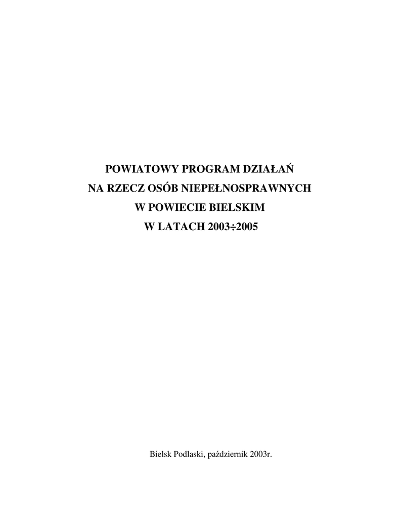 POWIATOWY PROGRAM DZIAŁA NA RZECZ OSÓB NIEPEŁNOSPRAWNYCH W POWIECIE BIELSKIM W LATACH 2003÷2005 Bielsk Podlaski, pa dziernik 2003r. Wst p W ka dym społecze stwie istnieje pewien procent osób, które z przyczyn dziedzicznych, wrodzonych, w wyniku chorób, wypadków, czy te nieprawidłowych warunków ycia nie maj pełnej sprawno ci fizycznej lub psychicznej. W powiecie bielskim liczb osób niepełnosprawnych szacuje si na ponad 6200 i liczba ta stale ro nie. Zdecydowan wi kszo w ród orzeczonych przez Zespół do Spraw Orzekania o Niepełnosprawno ci osób niepełnosprawnych stanowi osoby w wieku 16 lat i wi cej. Według danych Zespołu w ród osób niepełnosprawnych: co pi ta osoba jest w grupie wiekowej 16÷25 lat, co dziewi ta osoba jest w grupie wiekowej 26÷40 lat, co druga osoba jest w grupie wiekowej 40÷60 lat, w grupie wiekowej powy ej 60 lat w Zespole orzeka si co pi ta osoba. Zarówno w Polsce jak i w naszym powiecie tendencje wzrostowe tłumaczy mo na mi dzy innymi rozwijaj c zatruwaniem i niszczeniem ratuj cej si technik (wypadki), rodowiska naturalnego, post pem medycyny ycie, ale nie zawsze umiej cej zapobiec skutkom chorób czy wypadków. Stresuj cy tryb ycia, brak nawyków prozdrowotnych jest tak e przyczyn du ej liczby przypadków niepełnosprawno ci. Osoby niepełnosprawne maj prawo do korzystania z niezb dnych rodków, niezale nego, samodzielnego i aktywnego ycia oraz korzystania na zasadzie równo ci z praw i obowi zków ustawowych dla ogółu obywateli, bez wzgl du na rodzaj, przyczyn i stopie niepełnosprawno ci. Prawo do posiadania praw na równi z osobami zdrowymi zapewnia Konstytucja Rzeczpospolitej Polskiej. Dokumentem odnosz cym si w cało ci do osób niepełnosprawnych jest Uchwała Sejmu Rzeczpospolitej Polskiej z dnia 1 VIII 1997r. – Karta Praw Osób Niepełnosprawnych. Uchwał t Sejm RP 2 potwierdził niezbywalne prawa osób niepełnosprawnych oraz wezwał rz d i władze samorz dowe do podj cia działa na rzecz przestrzegania tych praw. Podstawowym aktem prawnym dotycz cym osób niepełnosprawnych jest Ustawa z dnia 27 VIII 1997r. o rehabilitacji zawodowej i społecznej oraz zatrudnianiu osób niepełnosprawnych. Odniesienie do osób niepełnosprawnych znalazło si w Ustawie z 4VI 1998r. o samorz dzie powiatowym. Dokumenty te stanowi wa n baz dla budowy Powiatowego programu działa na rzecz osób niepełnosprawnych, w którym nale y zaplanowa takie działania, które b d odpowiada potrzebom niepełnosprawnych obywateli naszego powiatu, jak te mo liwo ciom ich realizacji w oparciu o posiadany potencjał i zasoby. 3 I. DIAGNOZA Według zgromadzonych przez Powiatowe Centrum Pomocy Rodzinie w Bielsku Podlaskim danych za rok 2002,wynika i na terenie powiatu bielskiego yje ogółem 6200 osób niepełnosprawnych, z czego 414 stanowi dzieci. (Dane zebrane przez PCPR do Karty Powiatu na zlecenie Pełnomocnika Rz du do Spraw Osób Niepełnosprawnych). Problemy osób niepełnosprawnych wchodz w ramy strategii pomocowej struktur działaj cych w obszarze zdrowia, zatrudnienia, pomocy społecznej, kultury, sportu, turystyki, transportu itd. Wynika st d potrzeba uwzgl dnienia udziału wielu partnerów w przygotowaniu programu. 1. Rehabilitacja zawodowa osób niepełnosprawnych. W przypadku dorosłych osób niepełnosprawnych istotnym problemem jest bezrobocie. Długotrwałe pozostawanie bez pracy osoby niepełnosprawnej prowadzi do negatywnych skutków ekonomicznych, psychicznych i społecznych. Rehabilitacja zawodowa ma za zadanie uaktywnienie osób niepełnosprawnych, podniesienie poziomu ycia, a w szczególno ci integracji niepełnosprawnym społecznej. „wyj cia z czterech Umo liwienie osobom cian” swoich mieszka , zapewnia im kontakt ze społecze stwem, integracj , poczucie własnej warto ci. Polepszenie sytuacji ekonomicznej umo liwia osobom niepełnosprawnym korzystanie z rehabilitacji, rodków ortopedycznych i pomocniczych, które pozwalaj zmniejsza skutki niepełnosprawno ci. Rehabilitacja zawodowa ma na celu ułatwienie osobie niepełnosprawnej uzyskanie i utrzymanie odpowiedniego zatrudnienia 4 i awansu poprzez umo liwienie jej korzystania z poradnictwa zawodowego, szkolenia zawodowego i po rednictwa pracy. Na przestrzeni ostatnich lat notuje si niewielkie zmniejszenie liczby zarejestrowanych niepełnosprawnych mieszka ców powiatu bielskiego. Tabela Nr 1 Rok Liczba osób niepełnosprawnych zarejestrowanych jako bezrobotne lub poszukuj ce pracy (wg stanu na 31XII 2002r. ) 2000 155 2001 132 2002 126 ( ródło: dane Powiatowego Zespołu do Spraw Orzekania o Niepełnosprawno ci) Według stanu na koniec XII 2002r. osoby niepełnosprawne stanowiły ok. 4,4% zarejestrowanych bezrobotnych i poszukuj cych pracy. Bardzo du rol w mo liwo ci uzyskania zatrudnienia przez osoby niepełnosprawne odgrywa poziom wykształcenia. Tabela Nr 2 Poziom wykształcenia Odsetek osób bezrobotnych do ogółu niepełnosprawnych (%) mniej ni podstawowe 12,4 % podstawowe 35,8 % zasadnicze 20 % rednie 29 % wy sze 2,7 % ( ródło: dane Powiatowego Zespołu do Spraw Orzekania o Niepełnosprawno ci) Z osób orzeczonych przez Powiatowy Zespół do Spraw Orzekania o Niepełnosprawno ci na 31.12.2002r. – 28,4% stanowiły osoby zatrudnione. 5 W powiecie bielskim s dwa zakłady pracy chronionej: - HOOP S.A. w Warszawie Zakład Produkcyjny w Bielsku Podlaskim ul. Mickiewicza 200, - Spółdzielnia Inwalidów „Przyszło ” w Bielsku Podlaskim ul. D browskiego 3. W sumie zatrudniaj one 613 osoby niepełnosprawne (stan na XII 2002r.). Na otwartym rynku pracy pracuje szacunkowo 300 osób niepełnosprawnych natomiast działalno gospodarcz prowadzi ok. 30 osób. Poni sza tabela obrazuje pomoc w zakresie rehabilitacji zawodowej jak udzielił Starosta Bielski w latach 1999-2002 ze rodków PFRON. Tabela Nr 3 Rok Liczba utworzonych, przystosowanych stanowisk pracy z cz ciow refundacj rodków PFRON Liczba udzielonych po yczek na utworzon działalno gospodarcz Liczba osób którym dofinansowano d