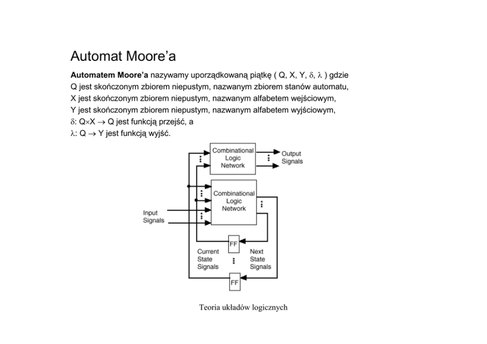 Automatem Moore’a nazywamy uporządkowaną piątkę ( Q, X, Y, δ, λ ) gdzie