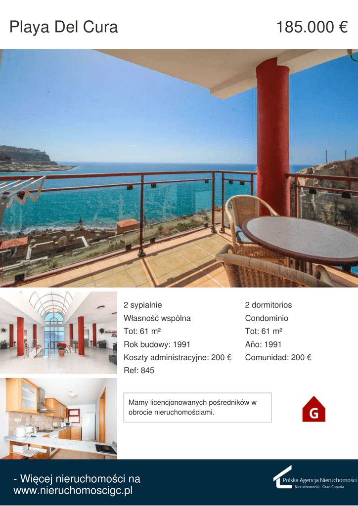 Playa Del Cura 185.000 € 2 sypialnie 2 dormitorios Własność wspólna Condominio Tot: 61 m² Tot: 61 m² Rok budowy: 1991 Año: 1991 Koszty administracyjne: 200 € Comunidad: 200 € Ref: 845 Mamy licencjonowanych pośredników w obrocie nieruchomościami. - Więcej nieruchomości na www.nieruchomoscigc.pl