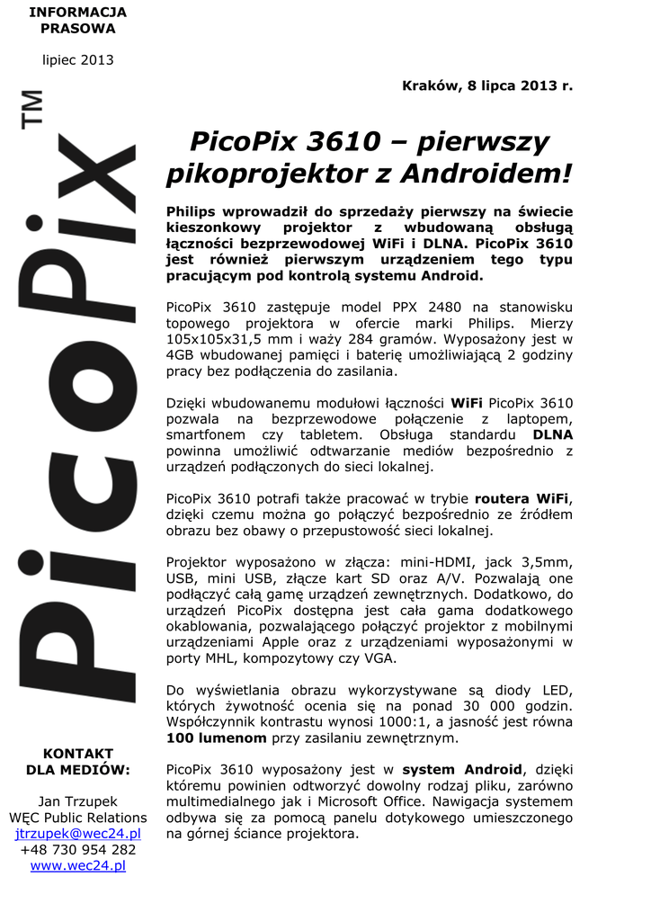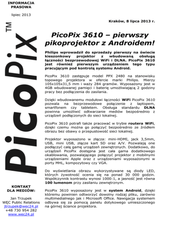 INFORMACJA PRASOWA lipiec 2013 Kraków, 8 lipca 2013 r. PicoPix 3610 – pierwszy pikoprojektor z Androidem! Philips wprowadził do sprzedaży pierwszy na świecie kieszonkowy projektor z wbudowaną obsługą łączności bezprzewodowej WiFi i DLNA. PicoPix 3610 jest również pierwszym urządzeniem tego typu pracującym pod kontrolą systemu Android. PicoPix 3610 zastępuje model PPX 2480 na stanowisku topowego projektora w ofercie marki Philips. Mierzy 105x105x31,5 mm i waży 284 gramów. Wyposażony jest w 4GB wbudowanej pamięci i baterię umożliwiającą 2 godziny pracy bez podłączenia do zasilania. Dzięki wbudowanemu modułowi łączności WiFi PicoPix 3610 pozwala na bezprzewodowe połączenie z laptopem, smartfonem czy tabletem. Obsługa standardu DLNA powinna umożliwić odtwarzanie mediów bezpośrednio z urządzeń podłączonych do sieci lokalnej. PicoPix 3610 potrafi także pracować w trybie routera WiFi, dzięki czemu można go połączyć bezpośrednio ze źródłem obrazu bez obawy o przepustowość sieci lokalnej. Projektor wyposażono w złącza: mini-HDMI, jack 3,5mm, USB, mini USB, złącze kart SD oraz A/V. Pozwalają one podłączyć całą gamę urządzeń zewnętrznych. Dodatkowo, do urządzeń PicoPix dostępna jest cała gama dodatkowego okablowania, pozwalającego połączyć projektor z mobilnymi urządzeniami Apple oraz z urządzeniami wyposażonymi w porty MHL, kompozytowy czy VGA. Do wyświetlania obrazu wykorzystywane są diody LED, których żywotność ocenia się na ponad 30 000 godzin. Współczynnik kontrastu wynosi 1000:1, a jasność jest równa 100 lumenom przy zasilaniu zewnętrznym. KONTAKT DLA MEDIÓW: Jan Trzupek WĘC Public Relations [email protected] +48 730 954 282 www.wec24.pl PicoPix 3610 wyposażony jest w system Android, dzięki któremu powinien odtworzyć dowolny rodzaj pliku, zarówno multimedialnego jak i Microsoft Office. Nawigacja systemem odbywa się za pomocą panelu dotykowego umieszczonego na górnej ściance projektora. INFORMACJA PRASOWA lipiec 2013 W zestawie, oprócz samego projektora, znajdziemy bogate wyposażenie dodatkowe, a w nim m.in.: futerał, zasilacz, pilot, instrukcję obsługi oraz podstawowy komplet okablowania, składający się z kabla HDMI i przejściówki miniUSB-USB. Kieszonkowy projektor Philips PicoPix 3610 jest objęty 24miesięczną gwarancją producenta, a jego sugerowana cena detaliczna wynosi 1799 PLN brutto. W sprzedaży wkrótce znajdą się również dodatkowe akcesoria dla PicoPix 3610, takie jak: stacja muzyczna, składająca się z dodatkowych głośników i baterii przedłużającej czas działania projektora do 4 godzin. Drugim akcesorium będzie moduł umożliwiający odbiór cyfrowej telewizji naziemnej. W poniższym linku znajduje się prezentacja wideo PicoPix 3610: http://youtu.be/UbwTAMf2CT0 Tagi: kieszonkowy, projektor, Philips, PicoPix, PPX, 3610, Android, LED, MP4, SD, HDMI, WiFi, DLNA, DVB-T, dom, praca, uczelnia O firmie Sagemcom Sagemcom to holding technologiczny o rodowodzie francuskim, działający w skali globalnej. Firma jest uznanym dostawcą nowoczesnych rozwiązań komunikacyjnych. Specjalizuje się w komunikacji szerokopasmowej oraz telekomunikacji, oferując zarówno urządzenia dla profesjonalistów, jak i ogółu społeczeństwa. Marka Philips jest własnością Koninklijke Philips Electronics N.V. i jest wykorzystywana przez Sagemcom na mocy przyznanej licencji. Więcej informacji: www.sagemcom.com KONTAKT DLA MEDIÓW: Jan Trzupek WĘC Public Relations [email protected] +48 730 954 282 www.wec24.pl