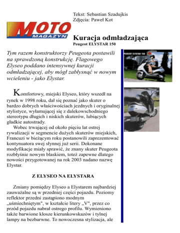 Tekst: Sebastian Szadujkis Zdjęcia: Paweł Kot Kuracja odmładzająca Peugeot ELYSTAR 150 Tym razem konstruktorzy Peugeota postawili na sprawdzoną konstrukcję. Flagowego Elyseo poddano intensywnej kuracji odmładzającej, aby mógł zabłysnąć w nowym wcieleniu - jako Elystar. Komfortowy, miejski Elyseo, który wszedł na rynek w 1998 roku, dał się poznać jako skuter o bardzo dobrych właściwościach jezdnych i oryginalnej stylistyce, wyłamującej się z dalekowschodniego stereotypu długich i niskich skuterów, lubiących gładkie autostrady. Wobec trwającej od około pięciu lat ostrej rywalizacji w segmencie dużych skuterów miejskich, Francuzi w bieżącym roku postanowili zaprezentować kontynuatora swej słynnej już serii. Dokonane modyfikacje miały sprawić, że znany skuter Peugeota rozbłyśnie nowym blaskiem, toteż zapewne dlatego nowości przygotowanej na rok 2003 nadano nazwę Elystar. Z ELYSEO NA ELYSTARA Zmiany pomiędzy Elyseo a Elystarem najbardziej zauważalne są w przedniej części pojazdu. Poziomy reflektor przedni zastąpiono modnym „uśmiechniętym", w kształcie litery „V", przez co przód pojazdu nabrał ostrego profilu. Wymieniono także barwione klosze kierunkowskazów i tylnej lampy na bezbarwne. To nowoczesna stylizacja, ale hołduje raczej powszechnemu trendowi, przez co Elystar nie ma już tak oryginalnego wyglądu jak poprzednik. Kolejną różnicę ujawnia miejsce pracy kierowcy, gdzie znajdziemy nową, tym razem znacznie bardziej funkcjonalną i efektowną deskę rozdzielczą oraz zaprojektowaną w podobnym charakterze kierownicę. O wyjątkowości tego modelu decyduje zastosowanie w nim systemu ABS/PBS (Power Brake System). To pierwszy europejski skuter klasy średniej, w którym zastosowano oba te układy wspomagające. System kontroli poślizgu jest załączony na stałe do obu kół. Natomiast działanie PBS polega na synchronizacji obu hamulców, gdzie lewa dźwignia na kierownicy typowo obsługuje tylny zacisk plus jeden z dwóch tłoczków przedniego. W efekcie delikatny nawet ruch lewą „klamką" daje bardzo skuteczny efekt spowalniający, a spokojna jazda nie wymaga korzystania z prawej dźwigni. Ta ostatnia, uruchamiając drugi tłoczek przedniego zacisku, pełni raczej funkcję wspomagania, przydatnego w sytuacjach awaryjnych. Także ABS jest odpowiednio dostrojony i daje mnóstwo frajdy, gdy przełamując barierę psychiczną, możemy na luźnej nawierzchni bez obawy wcisnąć oba hamulce "do oporu". Pod względem osiągów Elystar znacznie wykracza poza to, co oferował poprzednik. Przewidziane jednostki napędowe (50, 125 i 150 cm3) dozbrojono w elektroniczny układ wtryskowy, dzięki czemu chłodzony cieczą czterosuw o pojemności 150 cm3 rozpędza skuter do 118 km/h, dając wynik spotykany np. w klasie 250. NA POKŁADZIE Nowy Peugeot ma dobry start i równomierne przyspieszenie od 20 do 100 km/h. Jest zatem łagodny, ale w górnym zakresie obrotów daje poczucie mocy. Na uznanie zasługują: duża zwrot-ność, dobre tłumienie nierówności i świetne prowadzenie w zakrętach. Na "pokładzie" Elystara można pokusić się o dalsze wypady za miasto. Kierowca i pasażer mają stosunkowo wygodnie, a za kierownicą jest dużo miejsca na nogi, nawet dla najwyższych. Z tyłu pojazdu znajdziemy blisko metrowej długości potężną blokadę antykradzieżową. Pod siodłem jest duży bagażnik, ale zabrakło w nim oświetlenia. Dzięki doskonałej prezencji, prowadzeniu i skutecznym hamulcom Elystar roztacza mocny blask na skuterową klasę średnią. Ta gorąca nowość z francuskiej stajni dostępna jest na razie na zamówienie, a w polskich salonach zagości dopiero w przyszłym roku. MOIM ZDANIEM * Jakby nie patrzeć, Elyseo "na sterydach", mimo kilku drobiazgów, robi duże wrażenie. DANE TECHNICZNE PEUGEOT ELYSTAR 150 SILNIK Typ: czterosuwowy, 1-cylindrowy, chłodzony cieczą Pojemność: 150 cm3 Moc maksymalna: 13,6KM (10kW) przy 8000 obr./min Zasilanie: wtrysk PRZENIESIENIE NAPĘDU Sprzęgło: automatyczne, odśrodkowe Skrzynia biegów: bezstopniowa Przeniesienie na tylne koło: przekładnia redukcyjna PODWOZIE Rama: z rur stalowych Zawieszenie: przód - widelec teleskopowy o skoku 97 mm; tyt - wahacz dwuramienny, zblokowany z zespołem napędowym i dwoma elementami tłumiącoresorującymi o skoku 93 mm Hamulce: przód - tarczowy, o średnicy 226 mm; tył - tarczowy, o średnicy 210 mm Ogumienie: przód - 120/70-12; tyt-130/70-12 MASY I WYMIARY Masa bez płynów: 149 kg Rozstaw osi: 1368 mm Wymiary (dł./szer./wys.): 1900x720x1315 mm Wysokość siodła: 810 mm Pojemność zbiornika paliwa: 9,0 l OSIĄGI Prędkość maksymalna: 118 km/h Przyspieszenie 0-50 km/h: 4,4 s Przyspieszenie 0-100 km/h: 20,0 s Średnie zużycie paliwa: 3,4 l/100 km Zasięg: ok. 260 km Cena: ok. 4200 € euro Konkurencja: Suzuki Burgman 150