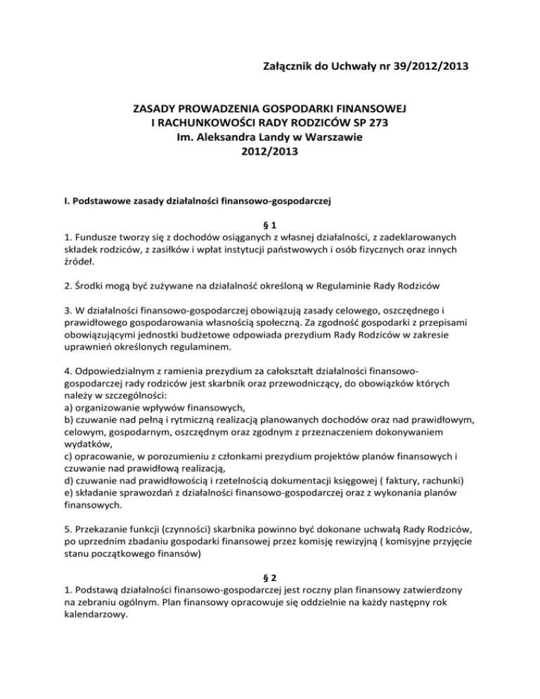 Załącznik do Uchwały nr 39/2012/2013 ZASADY PROWADZENIA GOSPODARKI FINANSOWEJ I RACHUNKOWOŚCI RADY RODZICÓW SP 273 Im. Aleksandra Landy w Warszawie 2012/2013 I. Podstawowe zasady działalności finansowo-gospodarczej §1 1. Fundusze tworzy się z dochodów osiąganych z własnej działalności, z zadeklarowanych składek rodziców, z zasiłków i wpłat instytucji państwowych i osób fizycznych oraz innych źródeł. 2. Środki mogą być zużywane na działalność określoną w Regulaminie Rady Rodziców 3. W działalności finansowo-gospodarczej obowiązują zasady celowego, oszczędnego i prawidłowego gospodarowania własnością społeczną. Za zgodność gospodarki z przepisami obowiązującymi jednostki budżetowe odpowiada prezydium Rady Rodziców w zakresie uprawnień określonych regulaminem. 4. Odpowiedzialnym z ramienia prezydium za całokształt działalności finansowogospodarczej rady rodziców jest skarbnik oraz przewodniczący, do obowiązków których należy w szczególności: a) organizowanie wpływów finansowych, b) czuwanie nad pełną i rytmiczną realizacją planowanych dochodów oraz nad prawidłowym, celowym, gospodarnym, oszczędnym oraz zgodnym z przeznaczeniem dokonywaniem wydatków, c) opracowanie, w porozumieniu z członkami prezydium projektów planów finansowych i czuwanie nad prawidłową realizacją, d) czuwanie nad prawidłowością i rzetelnością dokumentacji księgowej ( faktury, rachunki) e) składanie sprawozdań z działalności finansowo-gospodarczej oraz z wykonania planów finansowych. 5. Przekazanie funkcji (czynności) skarbnika powinno być dokonane uchwałą Rady Rodziców, po uprzednim zbadaniu gospodarki finansowej przez komisję rewizyjną ( komisyjne przyjęcie stanu początkowego finansów) §2 1. Podstawą działalności finansowo-gospodarczej jest roczny plan finansowy zatwierdzony na zebraniu ogólnym. Plan finansowy opracowuje się oddzielnie na każdy następny rok kalendarzowy. 2. Planowane na dany rok szkolny dochody i wydatki (koszty) powinny być zestawione w formie planu finansowego ( Preliminarza), który zatwierdza się do końca września w każdym roku szkolnym. 3. Dochody i wydatki (koszty) planuje się w sumach brutto – według poszczególnych źródeł pochodzenia oraz według przeznaczenia środków. 4. Otrzymane wpłaty z instytucji państwowych i organizacji społecznych oraz innych podmiotów mogą być zużyte tylko na cele uzgodnione z instytucją, która dokonała wpłaty. §3 1. Środki pieniężne są gromadzone i przechowywane na rachunkach bankowych. Równocześnie z otwarciem rachunku bankowego składa się na specjalnym druku bankowym wzory podpisów osób upoważnionych do podpisywania w imieniu prezydium dowodów wpłat i wypłat z rachunku. Przy podejmowaniu gotówki z rachunku Rady Rodziców obowiązuje podpis przewodniczącego lub skarbnika, natomiast przy podejmowaniu gotówki z subkonta Rady Rodziców- świetlica, obowiązuje podpis przewodniczącego lub skarbnika lub upoważnionego uchwałą Rady Rodziców Kierownika Świetlicy, zgłoszonego na wzorach podpisów. 2. Na drobne wydatki bieżące można dysponować gotówką w kasie na warunkach ogólnie obowiązujących, biorąc pod uwagę częstotliwość i wysokość wydatków wymagających pokrycia gotówkowego, oraz istniejące warunki i możliwości zabezpieczenia gotówki. 3. Prowadzenie kasy podręcznej powierza się skarbnikowi Rady Rodziców. II. Przyjmowanie wpłat §4 Rada Rodziców – „Świetlica SP 273” 1. Na każdą przyjętą wpłatę do kasy „świetlica SP 273”, wydaje się pokwitowanie z kwitariusza „Kasa przyjmie”. Kwitariusz prowadzi Kierownik świetlicy. Kwitariusz prowadzi się przebitkowo. Odbitka pozostawionego w aktach pokwitowania musi mieć ten sam numer kolejny co pokwitowanie wydane wpłacającemu. 2. Kwitariusze „Kasa przyjmie” powinny być ponumerowane już w chwili wydania ich osobie upoważnionej do inkasowania wpłat. Numerację blankietów pokwitowań prowadzi się bieżąco od nr 1 w każdym okresie obrachunkowym ( rok kalendarzowy). 3. Kierownik świetlicy zobowiązany jest do wpłacenia na subkonto bankowe Rady Rodziców – „świetlica SP 273” pełną kwotę gotówki, dowód wpłaty dołącza do Kwitariusza. 4. Nie dopuszcza się bezpośrednich wpłat rodziców na subkonto Rady Rodziców – „świetlica SP 273”, dlatego nie podaje się do publicznej wiadomości pełnego numeru rachunku bankowego. §5 Rada Rodziców SP 273 1. Zadeklarowane przez rodziców wpłaty na Radę Rodziców przyjmowane są przez przedstawiciela klasy do Rady Rodziców lub upoważnionego członka rady klasowej, na podstawie zbiorczych list wpłat. 2. Zbiorcze listy wpłat, opatrzone pieczęcią Rady Rodziców wydaje się członkom rad klasowych ( przedstawicielom klas do Rady Rodziców) na początku roku szkolnego. 3. Zbiorcze listy wpłat stanowią podstawę do rozliczenia finansowego i muszą zostać zwrócone skarbnikowi Rady Rodziców za pokwitowaniem, najpóźniej na ostatnim w roku szkolnym zebraniu Rady Rodziców. 4. Członek Rady Rodziców zobowiązany jest przekazywać bezzwłocznie zainkasowane od rodziców wpłaty wraz ze zbiorczą listą wpłat skarbnikowi Rady Rodziców. Na dowód rozliczenia otrzymuje on pokwitowanie na odwrocie tej listy : „ data, otrzymane <kwota>, podpis skarbnika”. Lista z pokwitowaniem zostaje zwracana Członkowi Rady Rodziców i służy do prowadzenia kolejnych zbiórek pieniędzy. 5. Skarbnik Rady Rodziców zobowiązany jest oszacować bieżące wydatki gotówkowe i zabezpieczyć gotówkę, pozostała kwota trafia niezwłocznie na konto bankowe Rady Rodziców. Na dowodzie wpłat, wpisuje się adnotację dotyczącą całości zebranej gotówki i kwoty o które pomniejsza się wpłatę na konto, określając ich cele. 6. Umożliwia się bezpośrednie wpłaty rodziców na konto Rady Rodziców, przy czym wpłata zostanie zaliczona do oddziału pod warunkiem określe