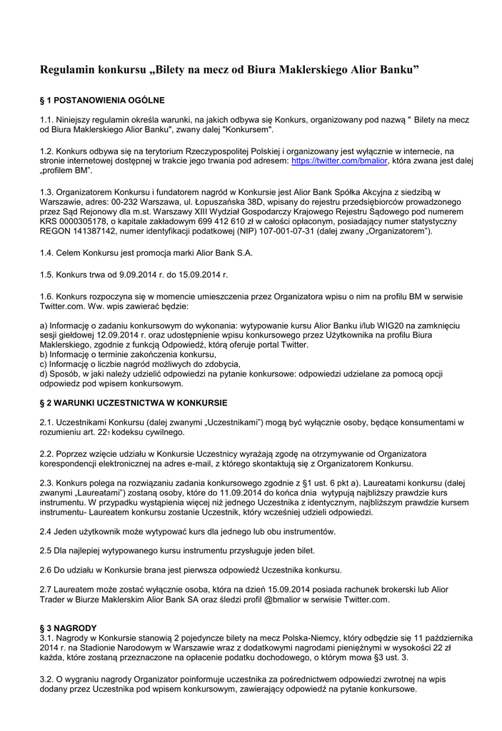 Regulamin konkursu „Bilety na mecz od Biura Maklerskiego Alior Banku” § 1 POSTANOWIENIA OGÓLNE 1.1. Niniejszy regulamin określa warunki, na jakich odbywa się Konkurs, organizowany pod nazwą " Bilety na mecz od Biura Maklerskiego Alior Banku", zwany dalej "Konkursem". 1.2. Konkurs odbywa się na terytorium Rzeczypospolitej Polskiej i organizowany jest wyłącznie w internecie, na stronie internetowej dostępnej w trakcie jego trwania pod adresem: https://twitter.com/bmalior, która zwana jest dalej „profilem BM”. 1.3. Organizatorem Konkursu i fundatorem nagród w Konkursie jest Alior Bank Spółka Akcyjna z siedzibą w Warszawie, adres: 00-232 Warszawa, ul. Łopuszańska 38D, wpisany do rejestru przedsiębiorców prowadzonego przez Sąd Rejonowy dla m.st. Warszawy XIII Wydział Gospodarczy Krajowego Rejestru Sądowego pod numerem KRS 0000305178, o kapitale zakładowym 699 412 610 zł w całości opłaconym, posiadający numer statystyczny REGON 141387142, numer identyfikacji podatkowej (NIP) 107-001-07-31 (dalej zwany „Organizatorem”). 1.4. Celem Konkursu jest promocja marki Alior Bank S.A. 1.5. Konkurs trwa od 9.09.2014 r. do 15.09.2014 r. 1.6. Konkurs rozpoczyna się w momencie umieszczenia przez Organizatora wpisu o nim na profilu BM w serwisie Twitter.com. Ww. wpis zawierać będzie: a) Informację o zadaniu konkursowym do wykonania: wytypowanie kursu Alior Banku i/lub WIG20 na zamknięciu sesji giełdowej 12.09.2014 r. oraz udostępnienie wpisu konkursowego przez Użytkownika na profilu Biura Maklerskiego, zgodnie z funkcją Odpowiedź, którą oferuje portal Twitter. b) Informację o terminie zakończenia konkursu, c) Informację o liczbie nagród możliwych do zdobycia, d) Sposób, w jaki należy udzielić odpowiedzi na pytanie konkursowe: odpowiedzi udzielane za pomocą opcji odpowiedz pod wpisem konkursowym. § 2 WARUNKI UCZESTNICTWA W KONKURSIE 2.1. Uczestnikami Konkursu (dalej zwanymi „Uczestnikami”) mogą być wyłącznie osoby, będące konsumentami w rozumieniu art. 221 kodeksu cywilnego. 2.2. Poprzez wzięcie udziału w Konkursie Uczestnicy wyrażają zgodę na otrzymywanie od Organizatora korespondencji elektronicznej na adres e-mail, z którego skontaktują się z Organizatorem Konkursu. 2.3. Konkurs polega na rozwiązaniu zadania konkursowego zgodnie z §1 ust. 6 pkt a). Laureatami konkursu (dalej zwanymi „Laureatami”) zostaną osoby, które do 11.09.2014 do końca dnia wytypują najbliższy prawdzie kurs instrumentu. W przypadku wystąpienia więcej niż jednego Uczestnika z identycznym, najbliższym prawdzie kursem instrumentu- Laureatem konkursu zostanie Uczestnik, który wcześniej udzieli odpowiedzi. 2.4 Jeden użytkownik może wytypować kurs dla jednego lub obu instrumentów. 2.5 Dla najlepiej wytypowanego kursu instrumentu przysługuje jeden bilet. 2.6 Do udziału w Konkursie brana jest pierwsza odpowiedź Uczestnika konkursu. 2.7 Laureatem może zostać wyłącznie osoba, która na dzień 15.09.2014 posiada rachunek brokerski lub Alior Trader w Biurze Maklerskim Alior Bank SA oraz śledzi profil @bmalior w serwisie Twitter.com. § 3 NAGRODY 3.1. Nagrody w Konkursie stanowią 2 pojedyncze bilety na mecz Polska-Niemcy, który odbędzie się 11 października 2014 r. na Stadionie Narodowym w Warszawie wraz z dodatkowymi nagrodami pieniężnymi w wysokości 22 zł każda, które zostaną przeznaczone na opłacenie podatku dochodowego, o którym mowa §3 ust. 3. 3.2. O wygraniu nagrody Organizator poinformuje uczestnika za pośrednictwem odpowiedzi zwrotnej na wpis dodany przez Uczestnika pod wpisem konkursowym, zawierający odpowiedź na pytanie konkursowe. 3.3. Organizator pobierze i odprowadzi do właściwego Urzędu Skarbowego zryczałtowany podatek od Nagród, o którym mowa w art. 30 ust. 1 pkt 2 ustawy z dnia 26 lipca 1991 r. o podatku dochodowym od osób fizycznych (Dz.U. z 2000 r. Nr 14, poz. 176 z późn. zm.). 3.4. Organizator zastrzega sobie prawo do zmiany nagród na inne, o zbliżonej wartości i parametrach, w przypadku wystąpienia nieprzewidzianych zdarzeń, uniemożliwiających wydanie nagród, wymienionych w ust. 3.1. 3.5. Uprawnienie do Nagrody nie może być przeniesione na osobę trzecią. 3.6. Organizator nie ponosi odpowiedzialności za brak możliwości przekazania Nagrody z przyczyn leżących po stronie Uczestnika, a w szczególności w przypadku podania błędnych danych, zmiany danych Uczestnika, o której nie został poinformowany, lub w przypadku niespełnienia przez Uczestnika warunków, o których mowa w niniejszym Regulaminie. W takim przypadku nagroda przepada. § 4 POSTANOWIENIA KOŃCOWE 4.1. Niniejszy Regulamin jest jedynym dokumentem, określającym zasady Konkursu. 4.2. Organizator jest uprawniony do zmiany postanowień niniejszego Regulaminu, o ile nie wpłynie to na pogorszenie warunków uczestnictwa w Konkursie. Dotyczy to w szczególności zmian terminów poszczególnych czynności konkursowych oraz zmian specyfikacji Nagród. 4.4. Naruszenie przez Uczestników Konkursu któregokolwiek z postanowień Regulaminu Konkursu, a w szczególności podanie nieprawdziwych danych osobowych, złożenie nieprawdziwych oświadczeń, naruszenie przepisów prawa lub dobrych obyczajów w związku z uczestnictwem w Konkursie upoważnia Organizatora do wyłączenia Uczestnika z Konkursu 4.5. W czasie trwania Konkursu treść Regulaminu będzie dostępna na stronie http://www.aliorbank.pl/pl/biuro_maklerskie/