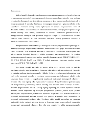 Streszczenie. Celem badań było ustalenie roli cech osobowych (temperamentu, stylu radzenia sobie ze stresem oraz prężności) oraz poznawczych (poznawczego obrazu choroby oraz poziomu stresu) osób chorujących na stwardnienie rozsianego w jego wczesnym okresie istotnych w procesie adaptacji do choroby określanego poprzez poziom depresji i lęku oraz jakości życia. Dodatkowo określone zostały cechy wpływające na poziom przystosowania oraz ich dynamika. Poddano analizie zmiany w zakresie konstruowania przez pacjentów poznawczego obrazu choroby oraz zmiany zachodzące w zakresie elementów przystosowania z uwzględnieniem istotnych cech jednostek mających wpływ na zaobserwowane zmiany. Badanie miało również na celu określenie związków między poziomem adaptacji a obiektywnym procesem chorobowym. Przeprowadzone badania trwały 6 miesięcy z dwukrotnym pomiarem w przeciągu 3 i 6 miesięcy odstępu od pierwszego spotkania. Przebadana została grupa 90 osób w wieku od 19 do 50 lat (88 i 85 w kolejnych pomiarach) chorująca na stwardnienie rozsianego do 4 lat od otrzymania formalnej diagnozy z niskim poziomem niepełnosprawności. Do pomiaru badanych zmiennych zastosowano siedem narzędzi diagnostycznych: FCZ-KT, MBSS, SPP25, IPQ-R, PSS-10, HADS oraz MSIS. W trakcie drugiego i trzeciego pomiaru badany otrzymywał IPQ-R, PSS-10, HADS i MSIS. Otrzymane wyniki wskazują na istotny udział stylu radzenia sobie w związku wymiarów choroby oraz jakości życia. Uzyskano także obserwacje sugerujące rolę żwawości w związku poziomu niepełnosprawności i jakości życia w wymiarze psychologicznym oraz wpływ płci na relację choroby w wymiarze czasowym oraz psychologicznej jakości życia. Uzyskano także wyniki o bezpośredniej zależności zmiennych dotyczących choroby i poziomu lęku oraz depresji jako wyznaczników adaptacji. Nie potwierdzono pośredniczącej roli komponentów poznawczego obrazu choroby oraz poziomu stresu w relacji choroby i poziomu przystosowania do niej. Analizy regresji wykazały, że poziom prężności oraz styl unikania źródła zagrożenia są istotnymi predyktorami poziomu jakości życia, poziom tolerancji na niepowodzenia jako element prężności, aktywności oraz perseweratywności są istotnymi predyktorami poziomu depresji oraz poziom aktywności oraz wytrwałości są istotnymi predyktorami poziomu lęku. Uzyskano także wyniki wskazujące na znaczenie prężności i stylów radzenia sobie ze stresem w dynamice zmian poszczególnych elementów poznawczej reprezentacji choroby. Ich rola oraz dodatkowo także perseweratywności ujawniła się również podczas analiz dynamiki poziomu adaptacji do stwardnienia rozsianego. Analizy korelacji pokazały negatywną zależność między poziomem depresji a poziomem niepełnosprawności oraz względny brak zależności miedzy poziomem lęku i jakości życia a zaawansowaniem choroby. Zaprezentowane wyniki pozwalają na wnioski dotyczące pozytywnego kierunku procesu przystosowania do stwardnienia rozsianego w badanej grupie pacjentów. Główne wnioski omówione w dyskusji wskazują na potencjał osobowy pacjentów umożliwiający pozytywne funkcjonowanie mimo pojawienia się choroby przewlekłej.