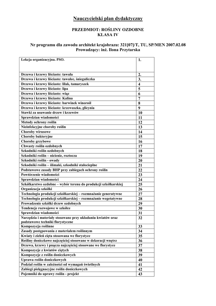 Nauczycielski plan dydaktyczny PRZEDMIOT: ROŚLINY OZDOBNE KLASA IV Nr programu dla zawodu architekt krajobrazu: 321[07]/T, TU, SP/MEN 2007.02.08 Prowadzący: inż. Ilona Przytarska Lekcja organizacyjna. PSO. 1. Drzewa i krzewy liściaste: tawuła Drzewa i krzewy liściaste: tawulec, śnieguliczka Drzewa i krzewy liściaste: lilak, tamaryszek Drzewa i krzewy liściaste: lipa Drzewa i krzewy liściaste: wiąz Drzewa i krzewy liściaste: Kalina Drzewa i krzewy liściaste: barwinek winorośl Drzewa i krzewy liściaste: krzewuszka, glicynia Stawki za usuwanie drzew i krzewów Sprawdzian wiadomości Metody ochrony roślin Nieinfekcyjne choroby roślin Choroby wirusowe Choroby bakteryjne Choroby grzybowe Chwasty roślin ozdobnych Szkodniki roślin ozdobnych Szkodniki roślin – nicienie, roztocza Szkodniki roślin - owady Szkodniki roślin – ślimaki, szkodniki stałocieplne Podstawowe zasady BHP przy zabiegach ochrony roślin Powtórzenie wiadomości Sprawdzian wiadomości Szkółkarstwo ozdobne – wybór terenu do produkcji szkółkarskiej Organizacja szkółki Technologia produkcji szkółkarskiej – rozmnażanie generatywne Technologia produkcji szkółkarskiej – rozmnażanie wegetatywne Prowadzenie szkółki drzew ozdobnych Tendencje rozwojowe w szkółce Sprawdzian wiadomości Narzędzia i materiały stosowane przy układaniu kwiatów oraz podstawowe techniki florystyczne Kompozycja roślinne Zasady postępowania z materiałem roślinnym Kwiaty i zieleń cięta stosowana we florystyce Rośliny doniczkowe najczęściej stosowane w dekoracji wnętrz Drzewa, krzewy i pnącza najczęściej stosowane we florystyce Kompozycje z kwiatów ciętych Kompozycje z roślin doniczkowych Uprawa roślin doniczkowych Podział roślin w zależności od wymagań świetlnych Zabiegi pielęgnacyjne roślin doniczkowych Pojemniki do uprawy roślin - projekt 2. 3. 4 5 6 7 8 9 10 11 12 13 14 15 16 17 18 19 20 21 22 23 24 25 26 27 28 29 30 31 32 33 34 35 36 37 38 39 40 41 42 43 Dekoracje roślinne w różnych wnętrzach Dekoracje z roślin suszonych Dekoracje z roślin sztucznych Dekoracje okolicznościowe Projekt stoiska wystawowego Elementy architektoniczne możliwe do zagospodarowania roślinnością Projekt ogrodu na dachu Aranżacje roślinne przy ścianach budynków Projekt ogródka ziołowego na balkonie lub tarasie Pojemniki i konstrukcje stosowane przy aranżacji balkonu, loggia i tarasu Techniki, terminy i pielęgnacja roślin balkonowych Powtórzenie wiadomości Sprawdzian wiadomości Projekt obsadzenia kwietnika od wczesnej wiosny do jesieni Projekt ogrodu skalnego Projekt ogrodu na glebie kwaśnej Projekt ogrodu na glebie zasadowej Projekt zagospodarowania brzegu i zbiornika wodnego Projekt części ogrodu przydomowego Powtórzenie i usystematyzowanie wiadomości z roślin ozdobnych Godziny do dyspozycji nauczyciela 44 45 46 47 48 - 49 50 51-52 53 54 55 56 57 58 59 - 61 62-63 64-65 66 -67 68-70 71-74 75 76-80