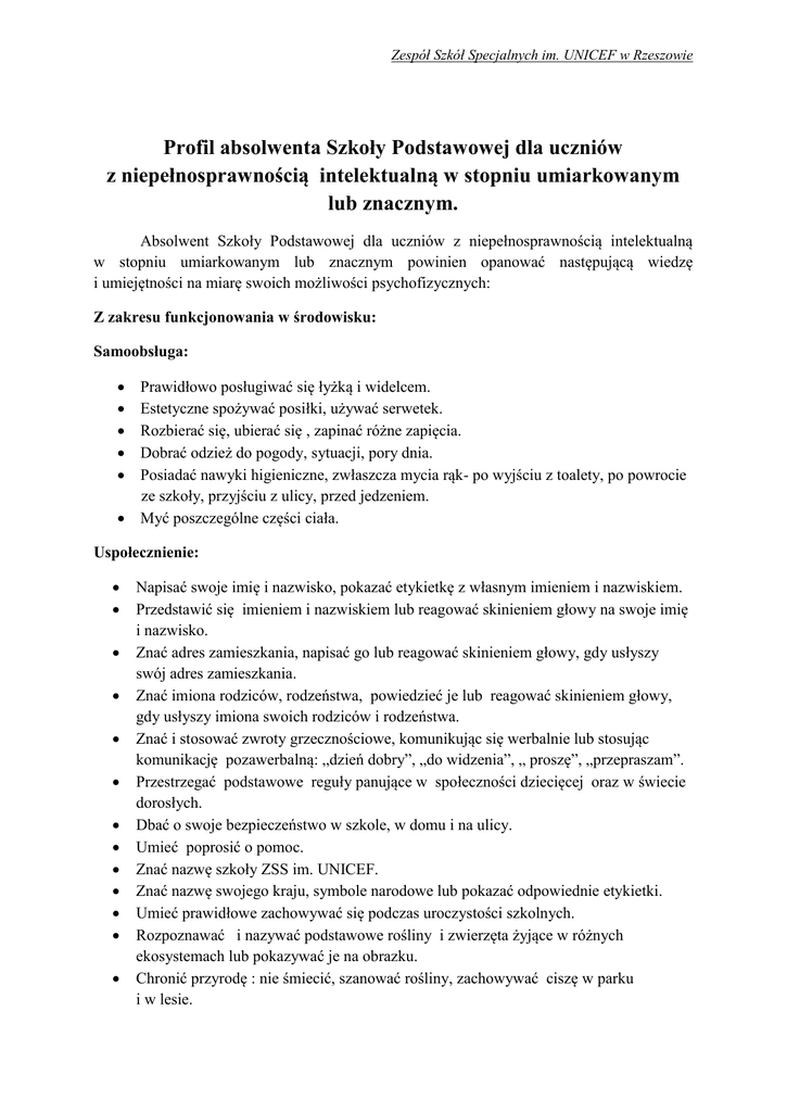 Zespół Szkół Specjalnych im. UNICEF w Rzeszowie Profil absolwenta Szkoły Podstawowej dla uczniów z niepełnosprawnością intelektualną w stopniu umiarkowanym lub znacznym. Absolwent Szkoły Podstawowej dla uczniów z niepełnosprawnością intelektualną w stopniu umiarkowanym lub znacznym powinien opanować następującą wiedzę i umiejętności na miarę swoich możliwości psychofizycznych: Z zakresu funkcjonowania w środowisku: Samoobsługa: Prawidłowo posługiwać się łyżką i widelcem. Estetyczne spożywać posiłki, używać serwetek. Rozbierać się, ubierać się , zapinać różne zapięcia. Dobrać odzież do pogody, sytuacji, pory dnia. Posiadać nawyki higieniczne, zwłaszcza mycia rąk- po wyjściu z toalety, po powrocie ze szkoły, przyjściu z ulicy, przed jedzeniem. Myć poszczególne części ciała. Uspołecznienie: Napisać swoje imię i nazwisko, pokazać etykietkę z własnym imieniem i nazwiskiem. Przedstawić się imieniem i nazwiskiem lub reagować skinieniem głowy na swoje imię i nazwisko. Znać adres zamieszkania, napisać go lub reagować skinieniem głowy, gdy usłyszy swój adres zamieszkania. Znać imiona rodziców, rodzeństwa, powiedzieć je lub reagować skinieniem głowy, gdy usłyszy imiona swoich rodziców i rodzeństwa. Znać i stosować zwroty grzecznościowe, komunikując się werbalnie lub stosując komunikację pozawerbalną: „dzień dobry”, „do widzenia”, „ proszę”, „przepraszam”. Przestrzegać podstawowe reguły panujące w społeczności dziecięcej oraz w świecie dorosłych. Dbać o swoje bezpieczeństwo w szkole, w domu i na ulicy. Umieć poprosić o pomoc. Znać nazwę szkoły ZSS im. UNICEF. Znać nazwę swojego kraju, symbole narodowe lub pokazać odpowiednie etykietki. Umieć prawidłowe zachowywać się podczas uroczystości szkolnych. Rozpoznawać i nazywać podstawowe rośliny i zwierzęta żyjące w różnych ekosystemach lub pokazywać je na obrazku. Chronić przyrodę : nie śmiecić, szanować rośliny, zachowywać ciszę w parku i w lesie. Zespół Szkół Specjalnych im. UNICEF w Rzeszowie Znać zagrożenia ze strony zwierząt (niebezpieczne i chore zwierzęta) i roślin (np. trujące owoce, liście, grzyby), wiedzieć jak zachować się w sytuacji zagrożenia. Umieć nazwać lub pokazać miejsce bólu. Wiedzieć jakie produkty są zdrowe, a jakie szkodzą człowiekowi. Znać tradycje związane z polskimi świętami. Odczytywać uproszczone rysunki, piktogramy: WC dla mężczyzn, WC dla Kobiet, Nie wolno wchodzić z lodami, ścieżka rowerowa itp. Odpowiednio zachowywać się w sklepie, towarzysząc osobie dorosłej podczas zakupów. Odpowiednio zachowywać się w miejscach publicznych: kino. teatr, kościół. Czytanie i pisanie: Znać litery alfabetu, potrafić je napisać z pamięci , odwzorować lub pokazać. Czytać proste wyrazy, etykietki np. znajdujące się na różnych produktach, szyldy. Pisać wyrazy z pamięci, odwzorowywać z tablicy lub pokazać odpowiednią etykietkę, piktogram. Odpowiadać logicznie na proste pytania werbalnie lub pozawerbalnie. Elementarne pojęcia matematyczne: Znać dni tygodnia i orientować się jaki jest dzisiaj dzień tygodnia, jaki będzie jutro, jaki był wczoraj- werbalnie lub pozawerbalnie. Znać nazwy miesięcy wymienić, pokazać je na kalendarzu, wiedzieć jaki jest aktualny miesiąc. Rozróżniać pory dnia: dzień- noc, rano, południe, wieczór. Odczytywać pełne godziny na zegarze z tarczą, kojarzyć je z charakterystycznymi czynnościami. Liczyć ze wskazaniem. Znać monografię liczb od 1-10 w zakresie dostępnym uczniowi. Porównywać liczebność zbiorów: mniej, więcej, tyle samo (małe liczebności). Rozdawać przedmioty tak, żeby każdy miał tyle samo. Ustalać wynik dodawania i odejmowania: liczenie przedmiotów- dokładanie lub zabieranie kilku i liczenie dla ustalenia, ile jest po takiej zmianie. Wymienić odpowiedni liczebnik lub pokazać cyfrę. Dodawać i odejmować na palcach lub na innych zbiorach zastępczych (małe liczebności). Klasyfikować przedmioty ze względu na: kolor, kształt, wielkość, na przynależność lub miejsce, gdzie się zwykle znajdują. Posługiwać się i rozumieć podstawowe wyrażenia przyimkowe: nad, pod, za , przed, obok. Określać położenie przedmiotów w stosunku do swojej osoby, np.: na, pod, niskowysoko, wysoko, w górze, na dole. Określać długość przy pomocy kroków lub naturalnych przyborów: klocka, sznurka. Zespół Szkół Specjalnych im. UNICEF w Rzeszowie Napełniać naczynia wodą lub materiałami sypkimi. Przelewać płyn lub przesypywać ciała sypkie z naczynia do naczynia. Mierzyć objętość jedną miarą np. kubeczkiem. Rozpoznawać monety w zakresie dostępnym uczniowi. Plastyka: Narysować człowieka samodzielnie lub pod dyktando. Wykonywać proste rysunki np. dom, drzewo, jabłko, itp. Prawidłowo posługiwać się pędzlem i farbami. Zamalowywać małe i duże powierzchnie, starając się mieścić w konturze. Aktywnie uczestniczyć w zajęciach plastycznych i odpowiednio reagować na instruktaż nauczyciela. Technika: Wykonywać proste czynności manipulacyjne: np. wkładać, wyjmować, zamykać, otwierać itp. Ugniatać, wałkować, formować, lepić różne formy z plasteliny, masy solnej. Wydzierać: darcie dowolne papieru, wzdłuż narysowanych linii. Prawidłowo posługiwać się nożyczkami: ciąć dowolnie, na sieczkę, wzdłuż narysowanych linii. Rozpoznawać produkty spożywcze gotowe do spożycia i wymagające obróbki. Nakładać łyżka produkty o różnej konsystencji. Smarować za pomocą noża. Przygotowywać kanapki z różnych składników. Utrzymywać ład i porządek w otoczeniu. Układać rzeczy, przedmioty w miejscach przeznaczenia. Zamiatać, powycierać stół. Umyć talerz, kubek. Wiedzieć do czego służą sprzęty mechaniczne. Korzystać z magnetofonu, windy. Muzyka: Aktywnie uczestniczyć w zajęciach muzyczno- rytmicznych. Śpiewać 