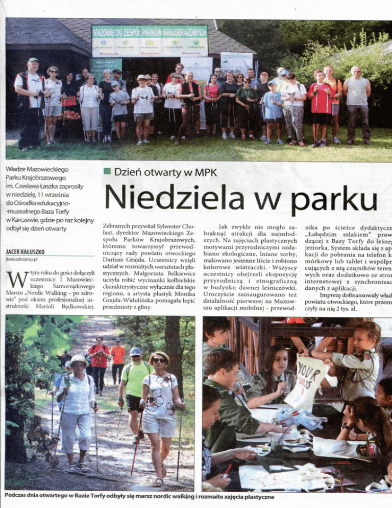 Wtedze Mazowieckiego Parku Krajobrazowego im. Czestawa taszka za prosily w niedziel^, 11 wrzesnia do Osrodka edukacyjno-muzealnego Baza Torfy w Karczewie, gdzie po raz kolejny odbyt si^ dzien otwarty JACEKKAtUSZKO [email protected] W tym roku do gosci dol^czyli uczestniq^ I Mazowieckiego Samorz^dowego Marszu (,Nordic Walking - po zdrowie" pod okiem profesjonalnej i n struktorki Marioli B^dkowskiej. Dzien otwarty w MPK Niedziela w parku Zebranych przywitaJ Sylwester C h o tast, dyrektor Mazowieckiego Z e spotu P a r k o w Krajobrazowych, ktoremu towarzyszyl przewodnicz^cy rady powiatu otwockiego Dariusz Grajda. Uczestnicy w z i ^ l i udziat w rozmaitych warsztatach plastycznych. Malgorzata Belkiewicz uczyta robic w y c i n a n k i kolbielskie charakterystyczne wylqcznie dla tego regionu, a artysta plastyk M o n i k a Grajda-Widulinska pomagala lepic przedmioty z gliny. Jak z w y k l e n i e moglo z a brakn^c atrakcji dla najmtods z y c h . N a zaj^ciach p l a s t y c z n y c h m o t y w a m i p r z y r o d n i c z y m i ozdab i a n o ekologiczne, I n i a n e torby, malowano jesienne liscie i robiono kolorowe wiatraczki. Wszyscy uczestnicy obejrzeli ekspozycj? przyro.dnicz^ i etnograficzn^ w b u d y n k u dawnej l e s n i c z o w k i . U r o c z y s c i e z a i n a u g u r o w a n o tez dzialalnosc pierwszej n a M a z o w szu aplikacji mobilnej - p r z e w o d - Podczas dnia otwartego w Bazie Torfy odbyfy si^ marsz nordic walkuig i rozmaite z a j ^ i a plastyczne n i k a po sciezce d y d a k t y c z n „Lab?dzim szlakiem" prow dz^cej z B a z y T o r f y do lesne j e z i o r k a . System sklada s i ? z ap k a c j i do p o b r a n i a n a telefon k m o r k o w y l u b tablet i w s p o l p c u j ^ c y c h z n i ^ c z u j n i k o w teren w y c h o r a z d o d a t k o w o ze stro internetowej z synchroniza danych z aplikacji. Imprez? dofinansowaty wlad powiatu otwockiego, ktore przezn c z y l y n a n i 4 2 tys. z l .