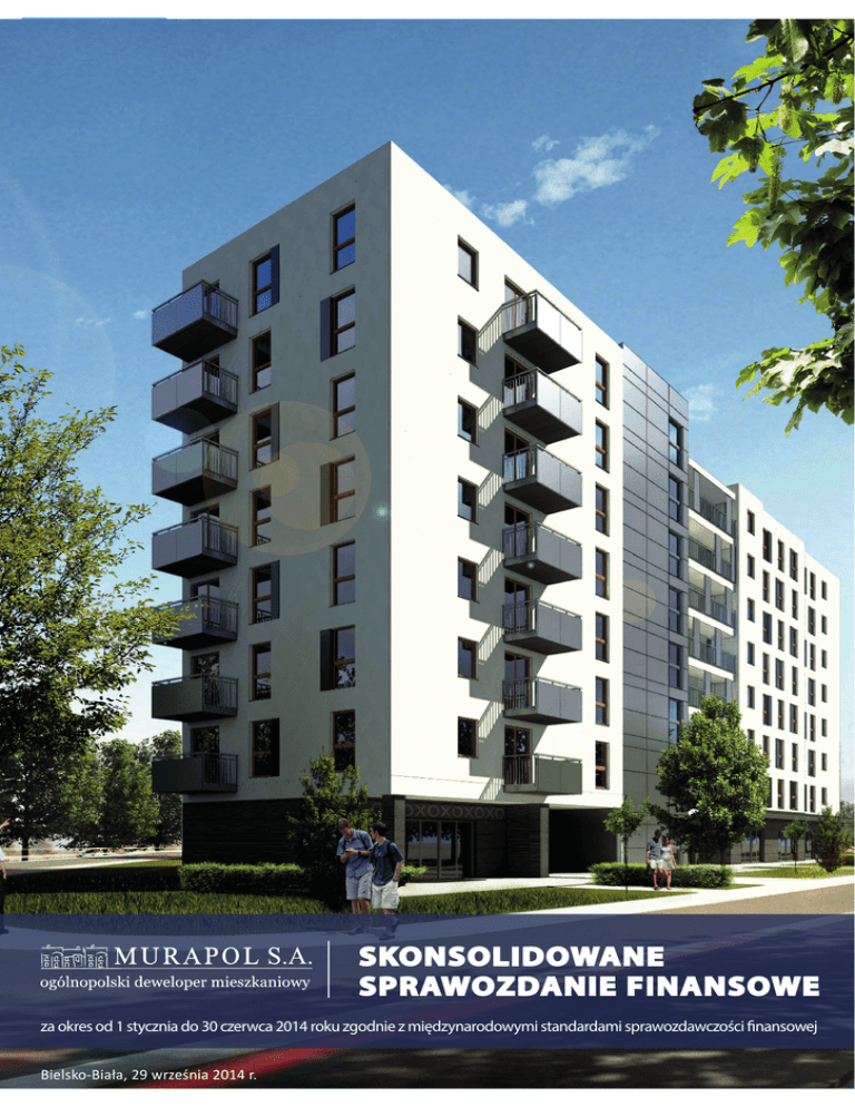 MURAPOL S.A. SKONSOLIDOWANE SPRAWOZDANIE FINANSOWE za okres od 1 stycznia do 30 czerwca 2014 roku zgodnie z międzynarodowymi standardami sprawozdawczości finansowej Bielsko-Biała, 29 września 2014 r. MURAPOL S.A. SKONSOLIDOWANE SPRAWOZDANIE FINANSOWE ZA OKRES od 01.01 do 30.06.2014r. 2 MURAPOL S.A. Spis treści A. WPROWADZENIE DO SKONSOLIDOWANEGO SPRAWOZDANIA FINANSOWEGO 5 1. Informacje ogólne 5 2. Przyjęte zasady (polityka) rachunkowości 10 B. SKONSOLIDOWANE SPRAWOZDANIE FINANSOWE 25 1. Skonsolidowane sprawozdanie z całkowitych dochodów 25 2. Skonsolidowane sprawozdanie z sytuacji finansowej 27 3. Skonsolidowane sprawozdanie z przepływów pieniężnych 29 4. Skonsolidowane sprawozdanie ze zmian w kapitale własnym 31 C. NOTY OBJAŚNIAJĄCE DO SKONSOLIDOWANEGO SPRAWOZDANIA FINANSOWEGO 33 1. Wartości niematerialne w okresie od 01.01 do 30.06.2014r. - NOTA NR 1 33 2. Rzeczowe aktywa trwałe w okresie od 01.01 do 30.06.2014r. - NOTA NR 2 34 3. Inwestycje w jednostkach zależnych objętych konsolidacją oraz inwestycje w pozostałych jednostkach powiązanych nie objętych konsolidacją w okresie od 01.01 do 30.06.2014r. - NOTA NR 3 35 4. Aktywa finansowe dostępne do sprzedaży na dzień 30.06.2014r. - NOTA NR 4 38 5. Aktywa finansowe wyceniane w wartości godziwej przez wynik finansowy - NOTA NR 5 39 6. Instrumenty finansowe - porównanie wartości bilansowych i wartości godziwych na dzień 30.06.2014r. - NOTA NR 6 43 7. Rodzaje ryzyk - NOTA NR 7 44 8. Informacje na temat podmiotów powiązanych za okres od 01.01 do 30.06.2014r. - NOTA NR 8 46 9. Nabycie spółki zależnej za okres od 01.01 do 30.06.2014r. - NOTA NR 9 47 10. Zapasy na dzień 30.06.2014r. - NOTA NR 10 47 11. Zapasy w okresie od 01.01 do 30.06.2014r. - NOTA NR 11 48 12. Należności z tytułu dostaw i usług oraz pozostałe należności na dzień 30.06.2014r. - NOTA NR 12 48 13. Rozliczenia międzyokresowe na dzień 30.06.2014r. - NOTA NR 13 49 14. Środki pieniężne i ich ekwiwalenty na dzień 30.06.2014r. - NOTA NR 14 49 15. Kapitał podstawowy na dzień 31.12.2013r. - NOTA NR 15 50 16. Zmiany kapitału podstawowego w okresie od 01.01 do 30.06.2014r. - NOTA NR 16 50 17. Kapitał zapasowy na dzień 30.06.2014r. - NOTA NR 17 50 18. Kapitał rezerwowy na dzień 30.06.2014r. - NOTA NR 18 51 19. Zmiany pozostałych kapitałów w okresie od 01.01 do 30.06.2014r. - NOTA NR 19 51 20. Rezerwy na świadczenia emerytalne i podobne w okresie od 01.01 do 30.06.2014r. - NOTA NR 20 52 21. Pozostałe rezerwy w okresie od 01.01 do 30.06.2014r. - NOTA NR 21 52 22. Zobowiązania z tytułu dostaw i usług oraz pozostałe zobowiązania krótkoterminowe na dzień 30.06.2014r. - NOTA NR 22 53 23. Kredyty i pożyczki na dzień 30.06.2014r. - NOTA NR 23 54 24. Struktura zapadalności kredytów, pożyczek i obligacji na dzień 30.06.2014r. - NOTA NR 24 59 25. Kredyty, pożyczki i obligacje w podziale na waluty na dzień 30.06.2014r. - NOTA NR 25 60 26. Zobowiązania z tytułu umów leasingu operacyjnego na dzień 30.06.2014r. - NOTA NR 26 60 27. Zobowiązania z tytułu umów leasingu finansowego na dzień 30.06.2014r. - NOTA NR 27 60 28. Przedmioty leasingu na dzień 30.06.2014r. - NOTA NR 28 61 29. Zobowiązania warunkowe na dzień 30.06.2014r. - NOTA NR 29 61 SKONSOLIDOWANE SPRAWOZDANIE FINANSOWE ZA OKRES od 01.01 do 30.06.2014r. 3 MURAPOL S.A. 30. Podatek dochodowy za okres od 01.01 do 30.06.2014r. - NOTA NR 30 62 31. Odroczony podatek dochodowy w okresie od 01.01 do 30.06.2014r. - NOTA NR 31 63 32. Przychody ze sprzedaży w okresie od 01.01 do 30.06.2014r. - NOTA NR 32 64 33. Koszty według rodzaju w okresie od 01.01 do 30.06.2014r. - NOTA NR 33 64 34. Pozostałe przychody i koszty w okresie od 01.01 do 30.06.2014r. - NOTA NR 34 66 35. Przychody i koszty finansowe w okresie od 01.01 do 30.06.2014r. - NOTA NR 35 66 36. Zysk/strata z tytułu różnic kursowych - netto w okresie od 01.01 do 30.06.2014r. - NOTA NR 36 67 37. Wynik działalności zaniechanej za okres od 01.01 do 30.06.2014r. - NOTA NR 37 67 38. Zysk przypadający na jedną akcję za okres od 01.01 do 30.06.2014r. - NOTA NR 38 68 39. Segmenty działalności - branżowe i geograficzne w okresie od 01.01 do 30.06.2014r. - NOTA NR 39 69 40. Informacje o łącznej wartości wynagrodzeń i nagród (w pieniądzu i w naturze), wypłaconych lub należnych, odrębnie dla osób zarządzających i nadzorujących emitenta w przedsiębiorstwie emitenta, bez względu na to, czy były one zaliczane w koszty, czy też wynikały z podziału zysku, a w przypadku, gdy emitentem jest jednostka dominująca lub znaczący inwestor oddzielnie informacje o wartości wynagrodzeń i nagród otrzymanych z tytułu pełnienia funkcji we władzach jednostek zależnych, współzależnych i stowarzyszonych; dodatkowo należy podać informacje o wynagrodzeniach, łącznie z wynagrodzeniami z zysku, wypłaconych lub zależnych osobom wchodzącym w skład organów zarządzających i nadzorujących spółek handlowych (dla każdej grupy osobno) - NOTA NR 40 69 41. Zdarzenia po dacie bilansu - NOTA NR 41 70 42. Zmiany zasad rachunkowości w okresie od 01.01 do 30.06.2014r. - NOTA NR 42 70 43. Objaśnienia dotyczące rachunku przepływów pieniężnych w okresie od 01.01 do 30.06.2014r. - NOTA NR 43 70 44. Ujawnienie elementów pozostałych dochodów całkowitych w okresie od 01.01 do 30.06.2014r. - NOTA NR 44 70 45. Wybrane dane finansowe wraz z przeliczeniem na euro - NOTA NR 45 70 D. SKRÓCONE SPRAWOZDANIE FINANSOWE MURAPOL S.A. ZA OKRES OD 01.01 DO 30.06.2014 R. 72 1. Sprawozdanie z całkowitych dochodów 72 2. Sprawozdanie z sytuacji finansowej 74 3. Sprawozdanie z przepływów pieniężnych za okres od 01.01 do 30.06.2014 r. 76 4. Sprawozdanie ze zmian w kapitale własnym 78 SKONSOLIDOWANE SPRAWOZDANIE FINANSOWE ZA OKRES od 01.01 do 30.06.2014r. 4 MURAPOL S.A. Skonsolidowane sprawozdanie finansowe za okres od 01.01 do 30.06.2014 roku Wszystkie kwoty wyrażone są w złotych polskich (o ile nie wskazano in