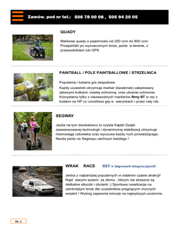 Zamów. pod nr tel.: QUADY Markowe quady o pojemności od 250 ccm do 800 ccm. Przejażdżki po wyznaczonym torze, jazda w terenie, z przewodnikiem lub GPS PAINTBALL / POLE PAINTBALLOWE / STRZELNICA Popularna i lubiana gra zespołowa. Każdy uczestnik otrzymuje marker (karabinek) załadowany żelowymi kulkami, maskę ochronną oraz ubranie ochronne. Korzystamy tylko z niezawodnych markerów firmy BT w raz z butlami na HP co umożliwia grę w warunkach i przez cały rok. SEGWAY Jazda na tym dwukołowcu to czysta frajda! Dzięki zaawansowanej technologii i dynamicznej stabilizacji utrzymuje równowagę człowieka oraz wyczuwa każdy ruch prowadzącego. Nauka jazdy na Segwayu zachwyci każdego ! WRAK RACE HIT w imprezach integracyjnych! Jedna z najbardziej popularnych w ostatnim czasie atrakcji! Rajd starymi autami ze złomu , którym nie straszne są delikatne stłuczki i obcierki ;) Sportowa rywalizacja na zamkniętym torze dla uczestników pragnących mocnych wrażeń ! Wyścig zapewnia emocje na najwyższym poziomie. Str. 1 mail : [email protected] OFF-ROAD SAMOCHODY TERENOWE 4x4 Przejażdżki autami terenowymi z napędem 4x4. Niezwykła atrakcja dla każdego kto chce poczuć adrenalinę jazdy terenowym autem w trudnych warunkach. TOR KARTINGOWY Gokart to mały pojazd silnikowy służący do wyścigów na torze kartingowym. Jazda gokartami zapewni emocje wszystkim fanom wyścigów samochodowych bez względu na wiek. RAJDÓWKI Do dyspozycji oddajemy sportowe auta Subaru Impreza. Na zamkniętym torze mamy możliwość doskonalenia techniki jazdy pod okiem doświadczonych instruktorów. ŚCIANKA WSPINACZKOWA, ZORBING, MEGA PIŁKARZYKI Ośmiometrowej wysokości ścianka spinaczkowa z dwiema drogami , które mogą pokonywać uczestnicy konkurencji. Zorbing-trzymetrowa kula to już klasyk na imprezach zorganizowanych i spełnienie marzeń wielbicieli sportów ekstremalnych. Mega piłkarzyki to doskonała rozrywka pobudzająca do rywalizacji, opracowania strategii i doskonalenia zgrania zespołu. Str. 2 GRUPY SZKOLNE, KOLONIE, PÓŁKOLONIE QUADY Nauka jazdy i przejażdżki po zamkniętym torze z instruktorem PAINTBALL / STRZELNICA PAINTBALLOWA Doskonała gra zespołowa dla dzieci. Dzieci od 8 lat. Dzieci poniżej 8 roku otrzymują markery typu Shotgun ( bezpieczniejsze, lżejsze) SEGWAY Nauka jazdy na dwukołowym pojeździe samobalansującym. Segway dostarcza niesamowitej radości z jazdy! Dzieci od 5 lat GRY I ZABAWY Podchody Poszukiwanie skarbów z wykrywaczami metalu Konkurencje zespołowe PRZEJAŻDŻKI AUTEM TERENOWYM Przejazdy samochodem terenowym 4x4 w trudnym terenie z instruktorem dostarczy każdemu niezapomnianych wrażeń. Lubiana atrakcja przez dzieci. Str. 3 ZORBING / KULE WODNE Doskonała zabawa dla dzieci . Do wyboru kule wodne lub bardziej ekstremalnie - Zorbing. Dodatkowo oferujemy: KUCHNIA POLOWA lub OGNISKO Lubiana przez wszystkich wojskowa kuchnia polowa. Urządzenie, które potrafi nadać wyjątkowy smak potrawom serwowanym wprost z MUZEUM POJAZDÓW WOJSKOWYCH Muzeum jest jedyną tego typu placówką w Polsce północnowschodniej. Jest to żywe muzeum, pojazdy są wyeksponowane na wolnym powietrzu, można je obejrzeć z bliska, do wielu z nich można wejść OPRAWA MUZYCZNA imprezy 4 osobowy wykonujący utwory wywodzące się z nurtu amerykańskiej muzyki folk-rockowej lat 70 tych urozmaici spotkanie towarzyskie. Q UA D Y - M R A G O W O. P L Kontakt: Tomek 506 780 008, Dorota 505 942 005 mail: [email protected] QUADY, PAINTBALL, SEGWAY, GOKART, IMPREZY INTEGRACYJNE Str. 4