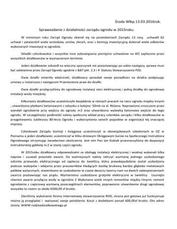 Środa Wlkp.13.03.2016rok. Sprawozdanie z działalności zarządu ogrodu w 2015roku. W minionym roku Zarząd Ogrodu zbierał się na posiedzeniach Zarządu 13 razy, uchwalił 62 uchwał i zatwierdził wiele wniosków, umów, zleceń, oraz z komisją inwestycyjną dokonał wiele odbiorów wykonanych inwestycji w ogrodzie. Składki członkowskie i wszystkie inne zobowiązania pieniężne uchwalone na WZ zapłacone przez wszystkich działkowców w wyznaczonym terminie. Jeden działkowiec odszedł na wieczny spoczynek nie pozostawiając po sobie następcy, sprawa musi być załatwiona przez Zarząd Ogrodu zgodnie z &87.pkt. 2.3 i 4 Statutu Stowarzyszenia PZD. Dwie działki zmieniły właścicieli, działkowcy sprzedali swoje posiadłości na działce podpisując umowy u notariusza z następcom Przeniesienia praw do działki. Dwie działki przyłączyliśmy do ogrodowej instalacji sieci elektrycznej i jedną działkę do ogrodowej instalacji wody miejskiej. Kilkunastu działkowców uczestniczyło bezpłatnie w różnych pracach na rzecz ogrodu między innymi ; utwardzono płytkami betonowymi z odzysku o kolejne 50mb na al. Różana. Naprawiono zniszczone przez wandali ogrodzenie przy wejściu do ogrodu nr2 oraz utwardzono wylewką betonowa wejście do tego ogrodu. W szczególności podkreślić należy społeczny wkład pracy członków zarządu i kilku działkowców w przygotowaniu Jubileuszu 80-lecia Ogrodu i wykorzystania swoich pojazdów w organizacji tej znaczącej imprezy. Członkowie Zarządu komisji i księgowa uczestniczyli w obowiązkowych szkoleniach w OZ w Poznaniu a jeden działkowiec uczestniczył w kliku dniowym Okręgowym kursie na Społecznego Instruktora Ogrodowego otrzymując świadectwo ukończenia. Jest nim Pan Jan Kubiak przeznaczyliśmy do dyspozycji Instruktorskiej gablotę nr.2 w starej części ogrodu. W 2015roku działkowcy odpowiedzialni za obsługę instalacji elektrycznej i wodnej wykonali kilka napraw i usuwali powstałe awarie. Do ważniejszych należy zaliczyć wymianę jednego uszkodzonego odcinka przewodu elektrycznego od zaplecza do świetlicy, który prawdopodobnie został uszkodzony podczas wykopów i wbijania przez pracowników kładących kostkę brukową bardzo głęboko metalowych palików wytycznych, stwierdzono że uszkodzenie w czasie deszczu tworzy nam na dwóch zabezpieczeniach zwarcia pozbawiając nas prądu. Wymieniono uszkodzone grzejniki elektryczne w świetlicy. Usunięto również awarie przyłącza wody w ogrodzie 2 Wykonano wiele innych remontów między innymi; remont ogrodzenia z częściową wymianą poszczególnych elementów, poprawiono utwardzenie drogi ogrodowej wszystko to razem za około 6500,00 zł brutto. Zleciliśmy wykonanie Strony Internetowej stowarzyszenia ROD, strona jest gotowa już funkcjonuje można ją przeglądać i wpisywać swoje polubienia. Koszt z dodatkami ponad 600,00zł brutto. Oto adres strony. WWW rodjniedzialkowskiego.pl Podpisano umowę z MPECWiK na odprowadzanie ścieków komunalnych do kanalizacji miejskiej od 2016roku. Koszty odprowadzania ścieków obowiązujące dla Miasta Środy Wlkp. Zgłosiliśmy nasze budynki ogrodowe Zaplecze i Dom Działkowca na Ankiecie programu Senior Wigor jest to program oparty na możliwości wykorzystania obiektów ROD na planowane tworzenie Dziennych Domów Seniora wspomaganych finansowo przez samorządy i fundacje. Działalność tą wprowadzają Fundacje posiadające akredytacje Ministerstwa Pracy i Polit. Społ. dla osób starszych oraz dzieci do lat 3.Fundacja specjalizuje się w pozyskiwaniu środków z Unii Europejskiej. Zorganizowaliśmy w naszej świetlicy spotkanie działkowców średzkich ogrodów z dzielnicowymi rewirów policyjnych na temat zabezpieczenia ogrodów i mienia działkowców w okresie zimy, oraz wykład wygłosił nasz instruktor ogrodowy Jan Kubiak na temat zabezpieczenia nasadzeń na działkach w okresie zimy oraz stosowanie oprysków i cięcia drzew. Podjęto również Uchwałę Nadzwyczajną pozwalającą na wykonanie dodatkowej nie uchwalonej na WZ inwestycji w ogrodzie, pod tytułem –Wykonanie pierwszego etapu instalacji wody miejskiej na starej części ogrodu na Al. Orzechowej. Powodem tego były liczne zgłoszenia działkowców o braku wody w studniach i brakiem opadów deszczu, motywując Zarząd do przyśpieszenia wykonania instalacji wody o jeden rok i przed położeniem kostki brukowej na al. Orzechowej i podjęcia powyższej uchwały o której wraz z wykonaniem inwestycji musiałem zgłosić do Okręgu uzasadniając podjęte decyzje i koszty wykonania które z dodatkami wyniosły około 9 tyś zł. Wszystkie zaplanowane inwestycje na 2015 rok wykonaliśmy w terminie, Faktury zapłacone odbiory dokonane i dotacje rozliczone. Wymieniliśmy całe zużyte ogrodzenie od str. torów kolejki na betonowe i częściowo nowe siatkowe powlekane. Wymieniliśmy zniszczoną o wąskich wymiarach bramę i furtkę nr2 na szerszą umożliwiającą wjazd samochodom do ogrodu utwardziliśmy kostką brukową na podkładzie drogowym kilka odcinków al. Orzechowej, oraz wykonano i zamontowano następne 4 ławki na al. Orzechowej. Razem z dodatkową inwestycją zapłaciliśmy około 38 tyś.zł. brutto. W tym 25 tyś. zł to dotacja docelowa na fundusz rozwoju ogrodu z UM. Miesiąc wrzesień to kolejny czas w którym zorganizowaliśmy Uroczystości jubileuszowe 80-cio lecia powstania ogrodu i Dnia Działkowca z udziałem wielu działkowców i ich rodzin, licznych gości z Województwa, UM i Powiatu, OZ z Poznania i prezesów sąsiednich średzkich ogrodów oraz przedstawicieli komendy powiatowej policji i straży pożarnej oraz PCK. Muzycznie pomagali nam panowie z zespołu Stara Gwardia i śpiewające dzieci przedszkolne. Rozrywki i konkursów nie brakowało. Były wręczane medale jubileuszowe, odznaczenia związkowe, nagrody dla ogrodu i działkowców, podziękowania i listy gratulacyjne, zjedliśmy wspólnie okazały Jubileuszowy tort oraz pyszne kieł